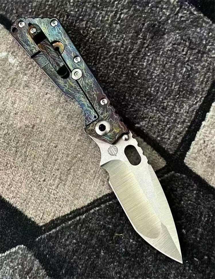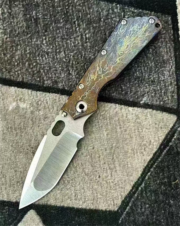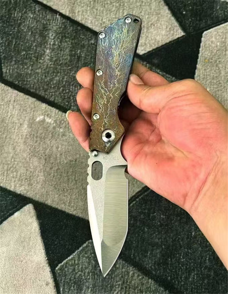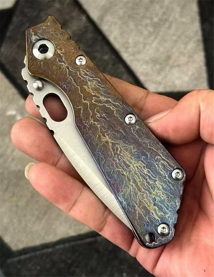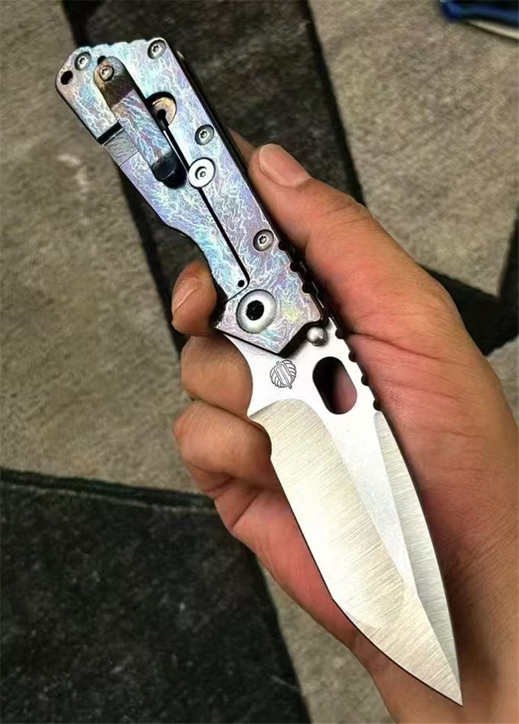 挺进者XL闪电纹折刀 总长:230mm 刃长:80mm 柄长:130mm 厚度:4.5mm 刃宽:34mm 表面:石洗+手工拉锻面 系统:铜垫片带独立钢头 硬度:61-62 HRC 净重:201克 材料:VG10 柄材:钛合金数控切割,成型工艺 柄面:阳极闪电纹
