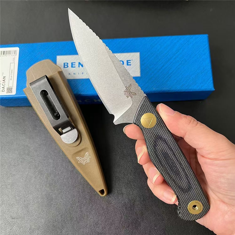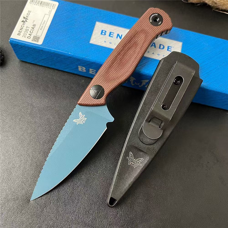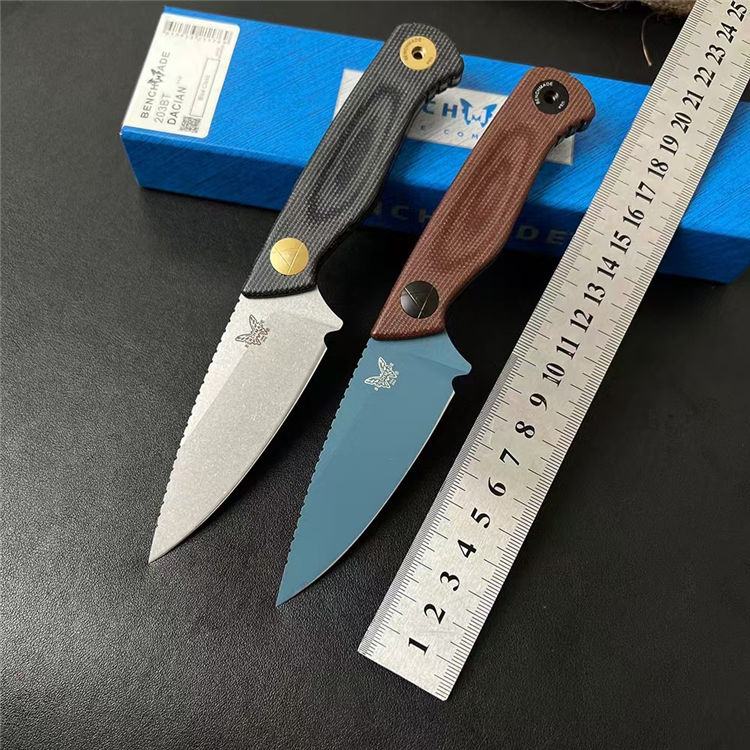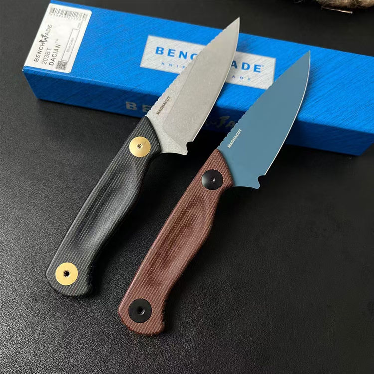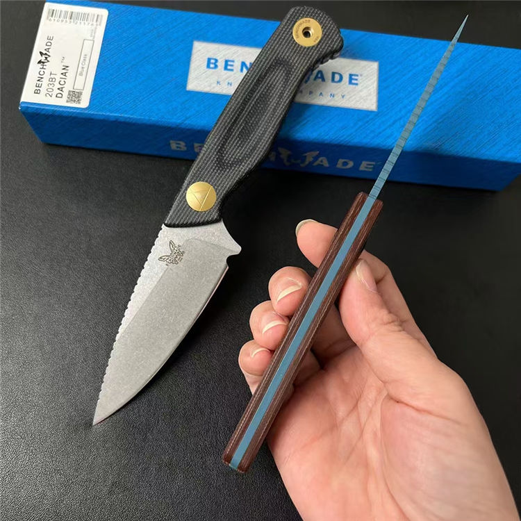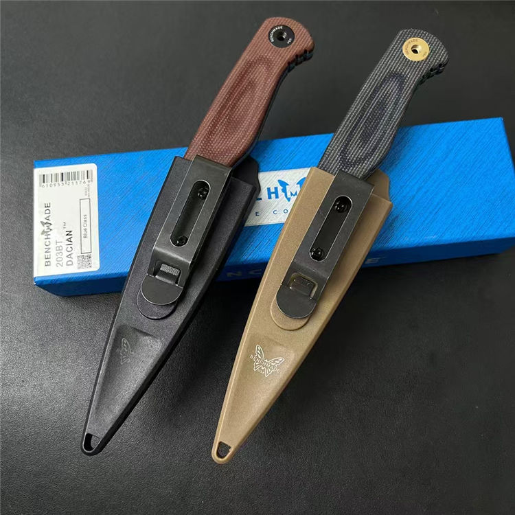 蝴蝶203BT达契亚直刀 全长:192mm 刃长:84mm 刃宽:32mm 柄长:108mm 刃厚:3mm 刃面:石洗或DLC涂层 刃材:MagnaCut钢 柄材:进口亚麻 净重:103g 重量:196g(含刀鞘包装) 刀鞘:PIM聚合物 硬度:60HRC 包装:原装彩盒