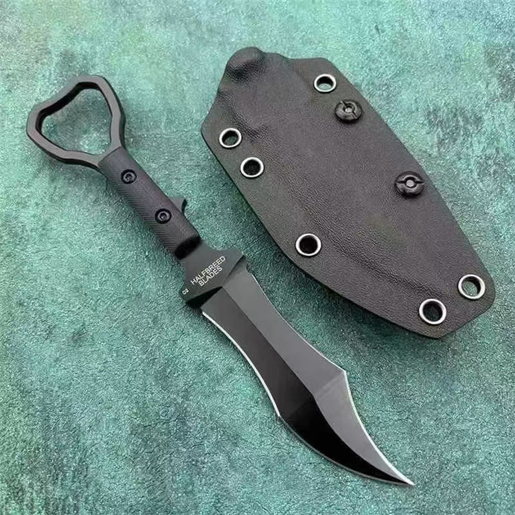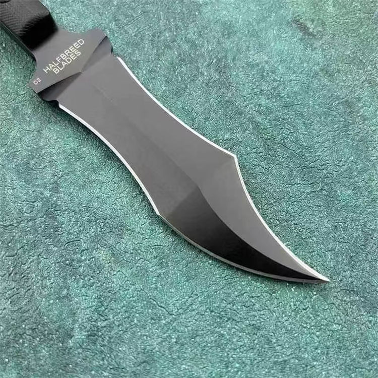 Halfcreed Blades异形爪刀 总长:20.6cm 手柄:10.3cm 刃长:9.3cm 厚度:4.5cm 刃材:D2钢(刀身一体钢) 硬度:60 手柄:G10贴片 刀套:K鞘 包装:礼盒