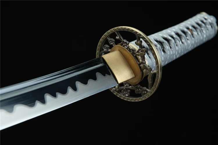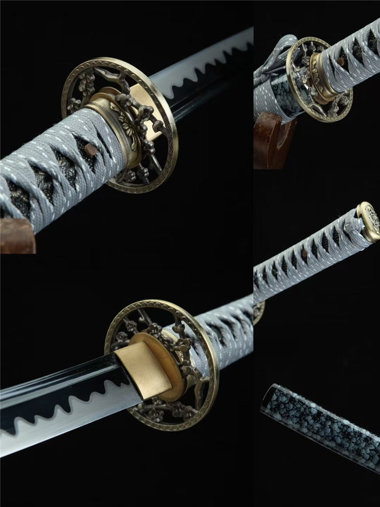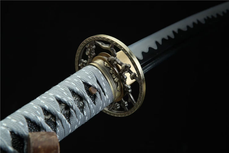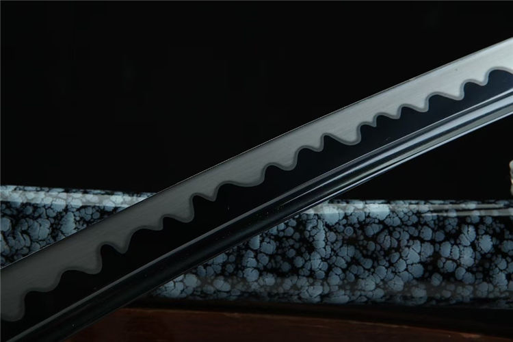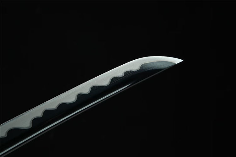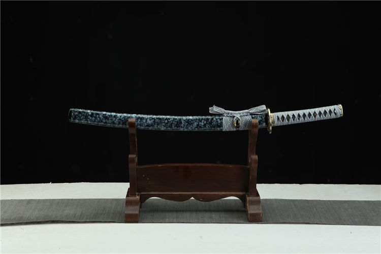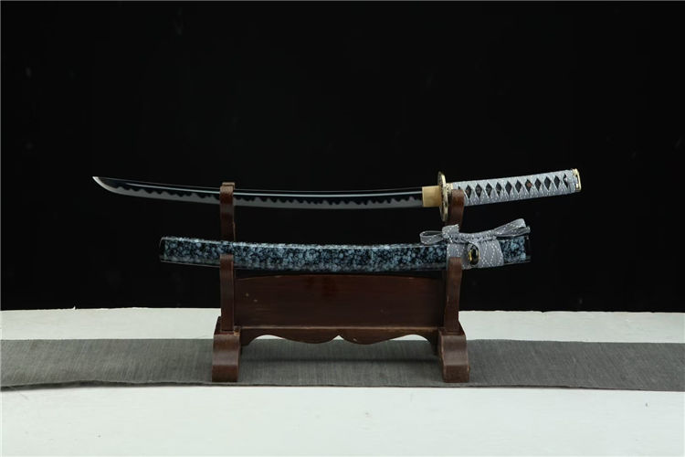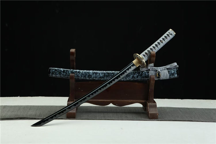 秋菊肋差武士刀 总长:78cm 刃长:51cm 兵长:21cm 刃宽:3.2cm 刃材:锋钢 工艺:高温发黑,刃口推磨 鞘材:实木油漆鞘 装具:合金 柄材:仿鱼皮 配置:锦盒,刀油,刀布