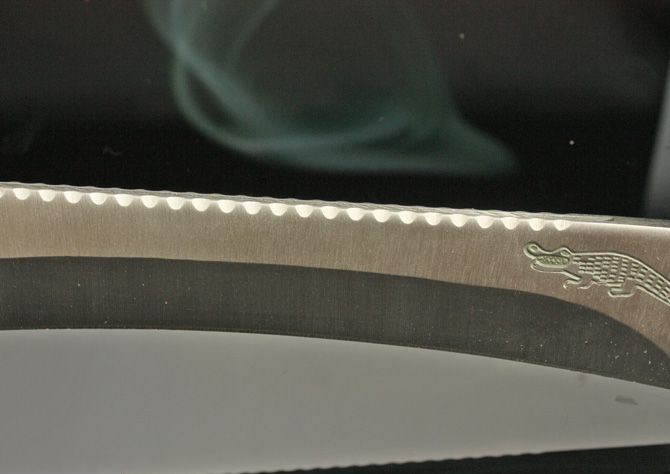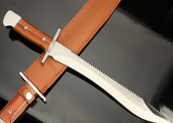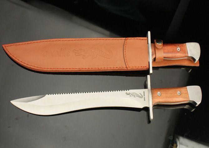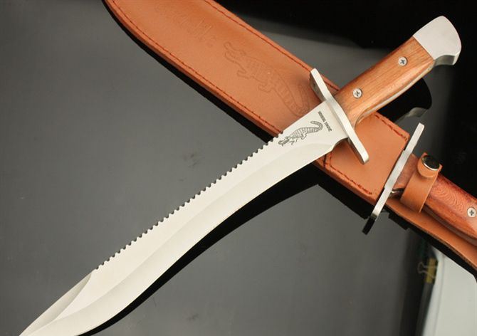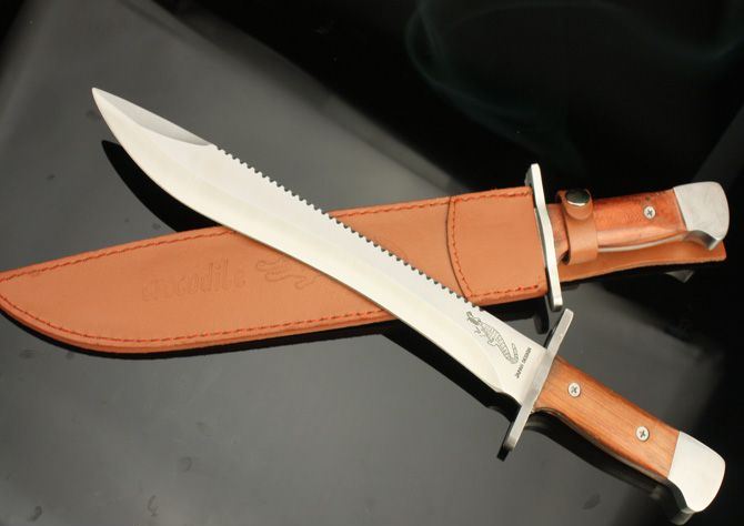 鳄鱼刺砍两用刀 全长:41cm 刃长:30cm 刃宽:3.6cm(最宽处) 刃厚:5mm 刃材:440 硬度:56HRC 柄材:桃木 刀鞘:真牛皮 重量:600克