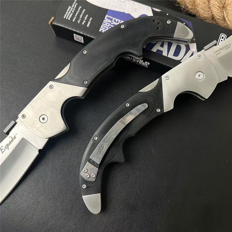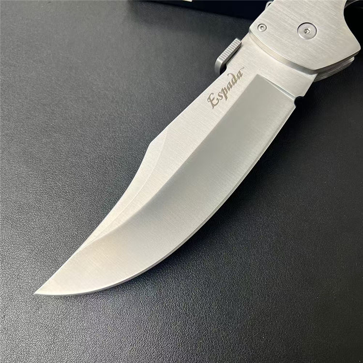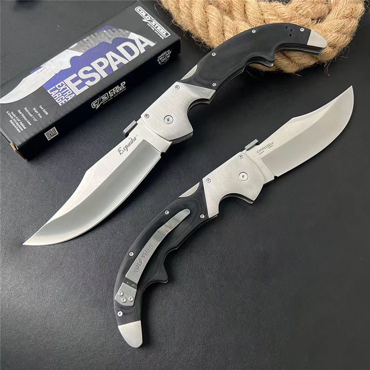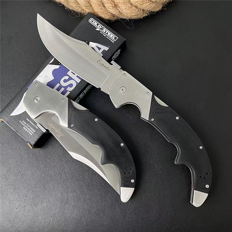 冷钢中号埃斯巴达折刀 全长:310mm 刃长:130mm 柄长:170mm 刃厚:3mm 刃面:锻光 刃材:CPM-S35VN钢 柄材:G10 净重:395g 重量:415g(含包装) 硬度:60HRC 包装:原装彩盒