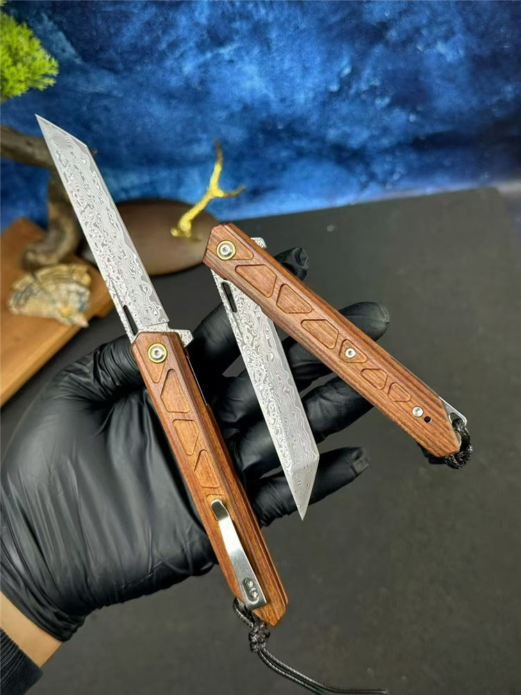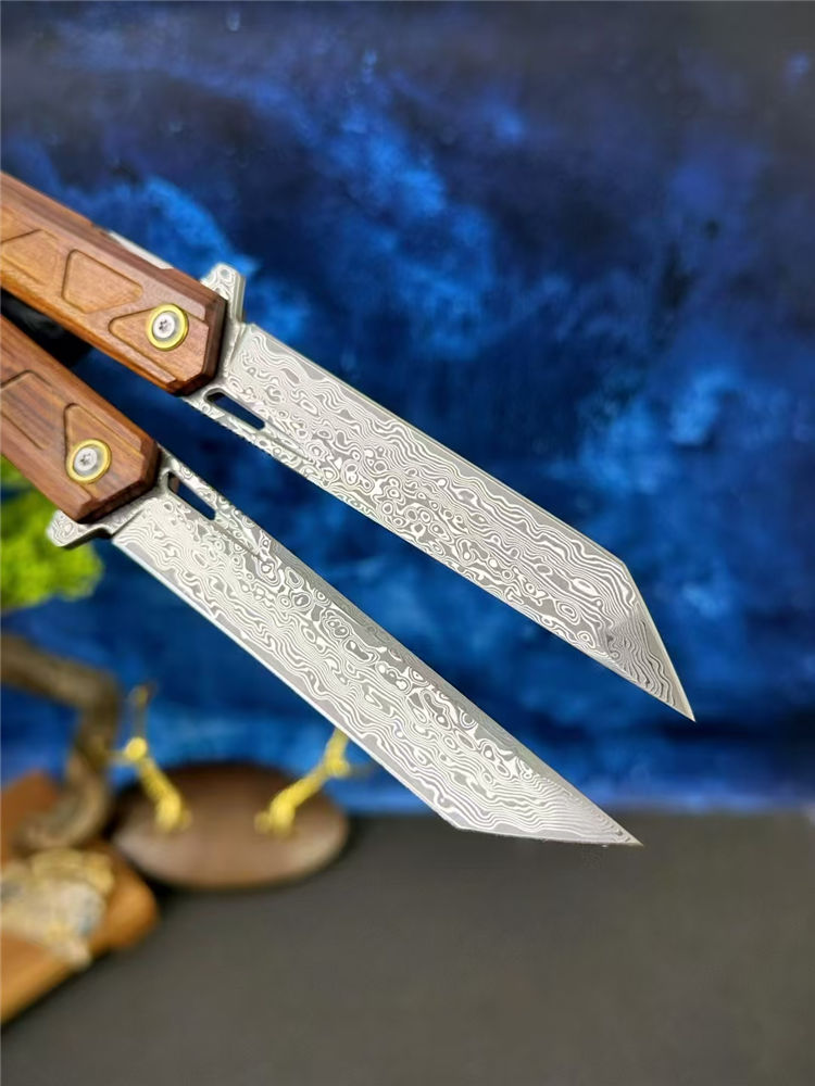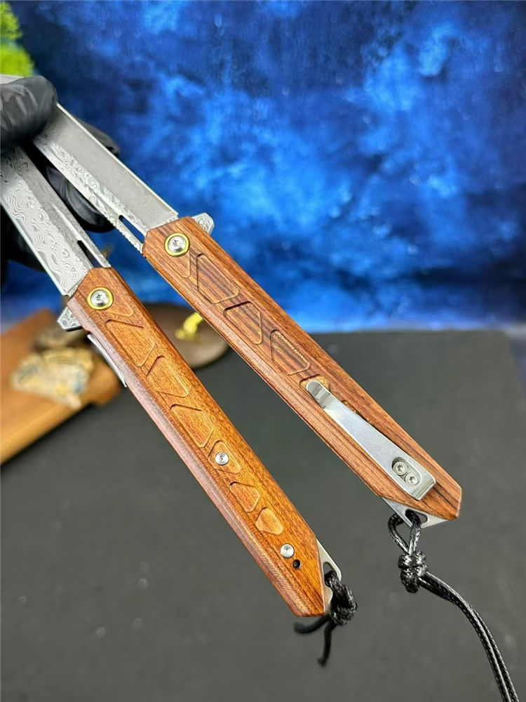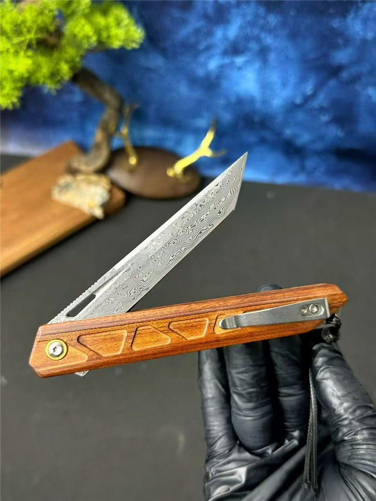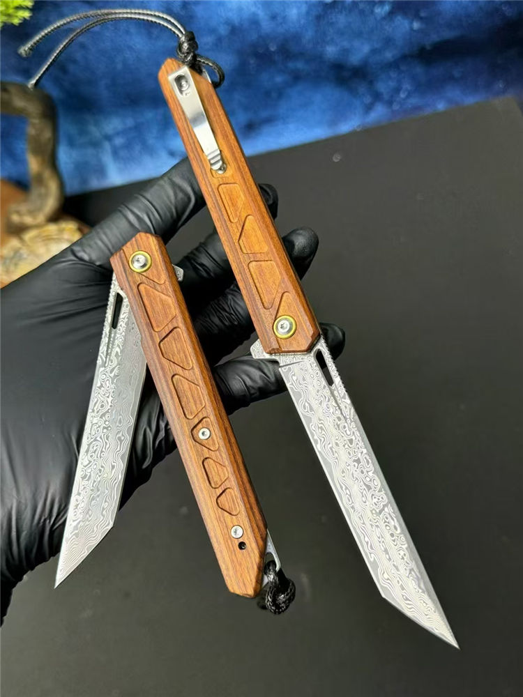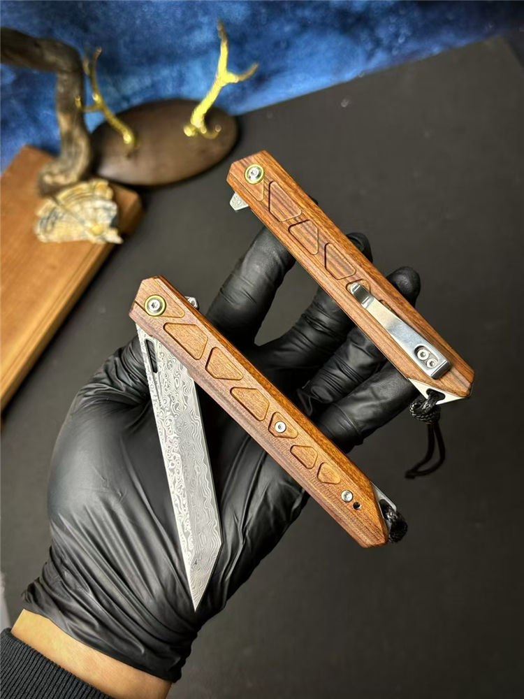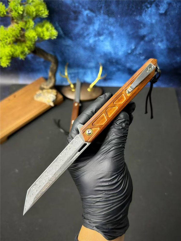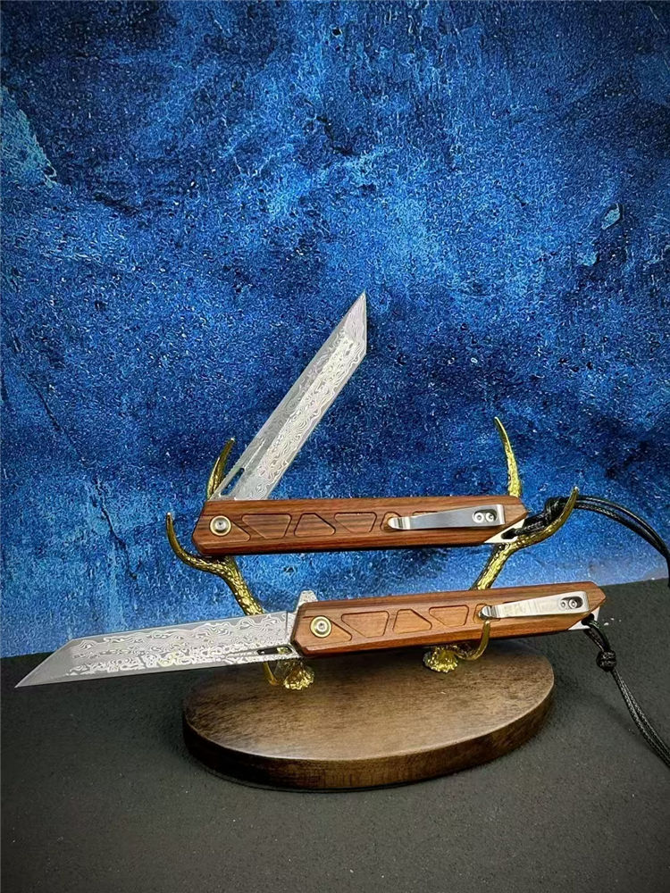 大马士革雷霆战折刀 总长:21.5cm 刀刃:10cm 手柄:12.5cm 刃宽:1.9cm 刃厚:3.1mm 材质:进口锻造大马士革钢 硬度:60HRC 柄材:进口沙漠铁木 重量:90g 包装:高档手工盒
