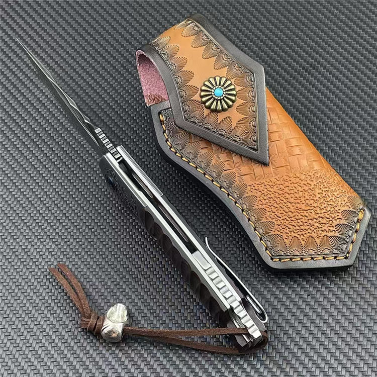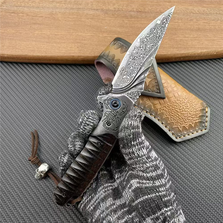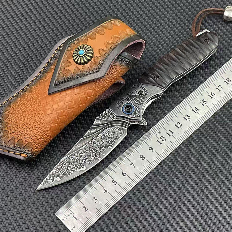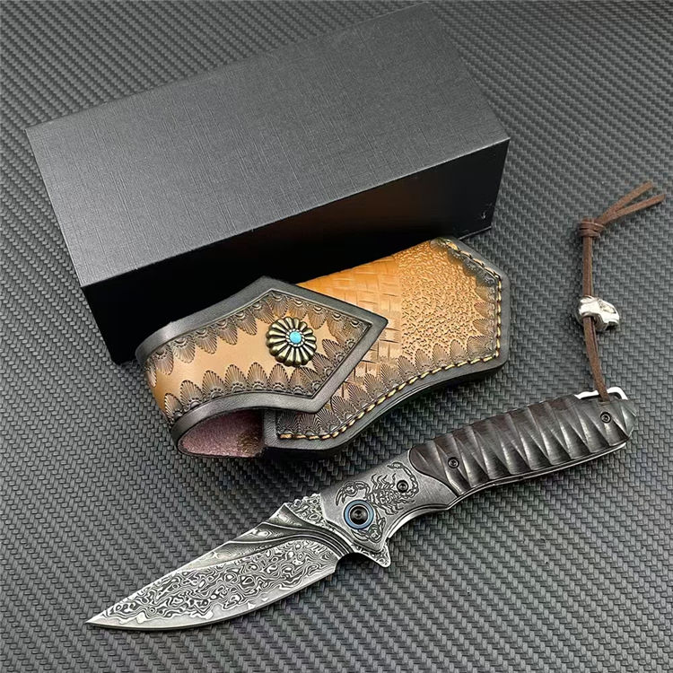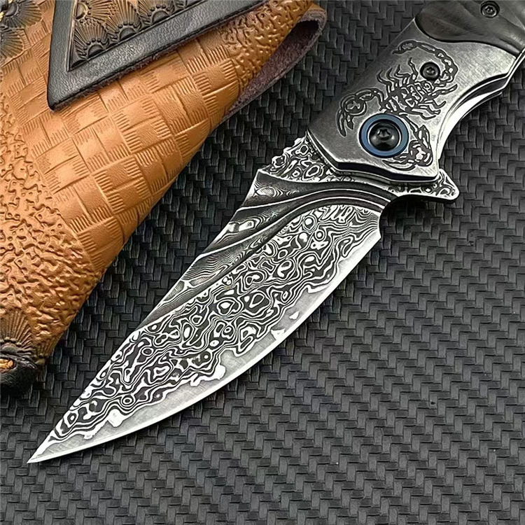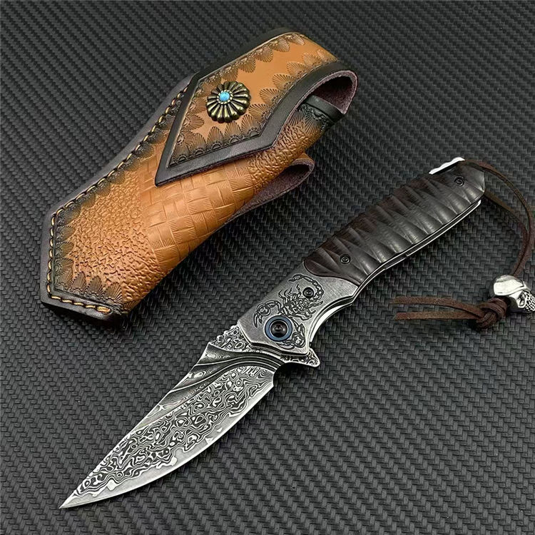 大马士革黑蝎折刀 总长:20cm 刃长:8.2cm 柄长:11.5cm 刃厚:3mm 钢材:228层进口VG10钢芯大马士革 硬度:60-62HRC真空热处理 柄材:砂铁木CNC浮雕+钢头CNC雕刻 皮套:意大利进口手工雕花植鞣雕花牛皮套 重量:138g/182g(含鞘) 毛重:266g(含包装合) 包装:精品礼品盒子包装