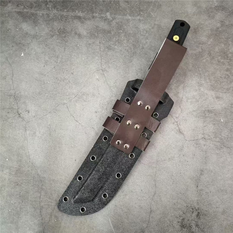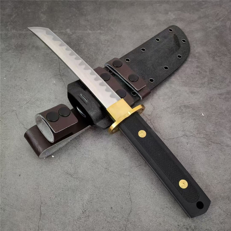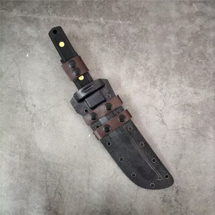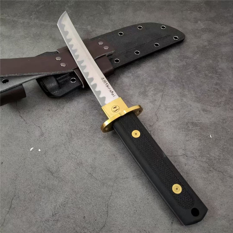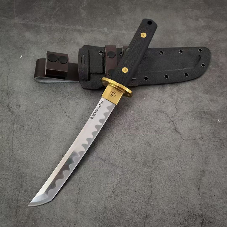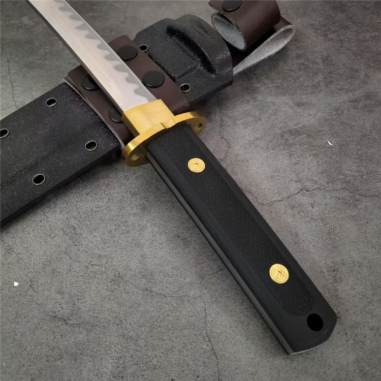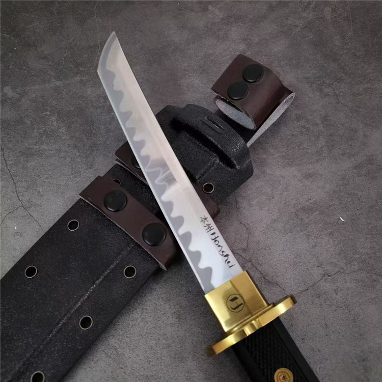本州战术助差武士刀 全长:36cm 刃长:21.5cm 柄长:14.5cm 刃厚:0.5cm 手柄:ABS 刃材:1095钢 毛重:678克 手工研磨,柄为色ABS,纯铜刀盘,K鞘