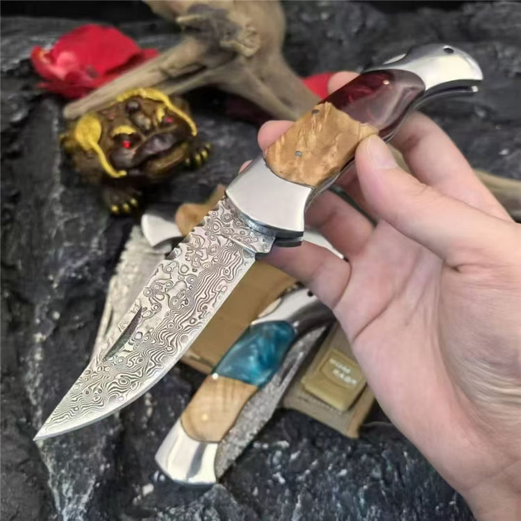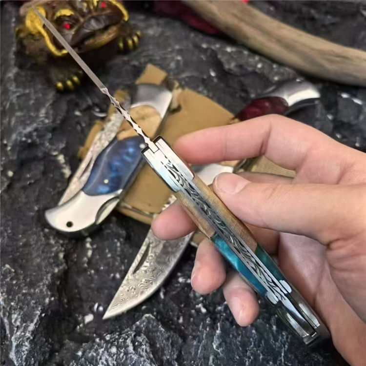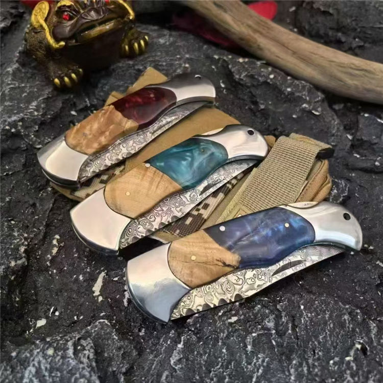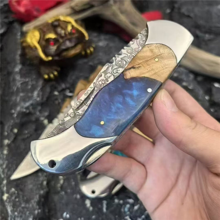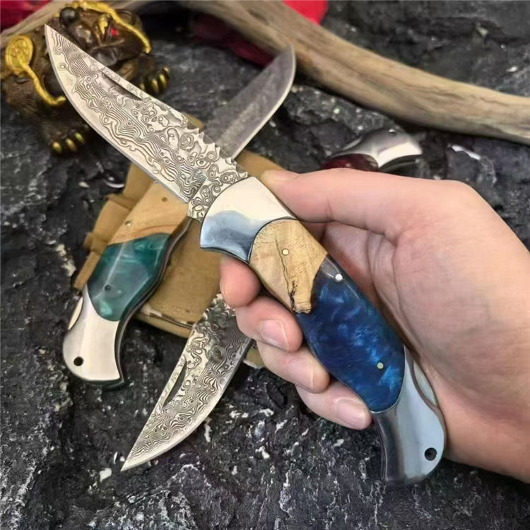 大马士革野山猫折刀 全长:215mm 刃长:85mm 刃厚:2.5mm 钢材:VG10大马士革钢 手柄:树瘤木+树脂(红、绿、蓝) 刀面:腐蚀纹 重量:193g