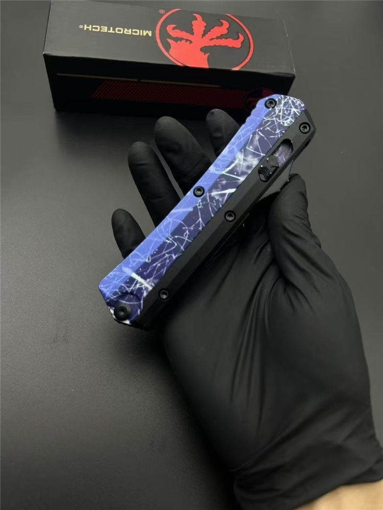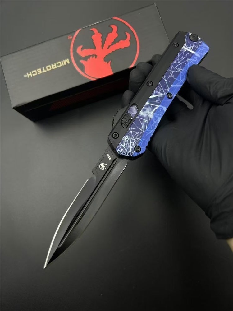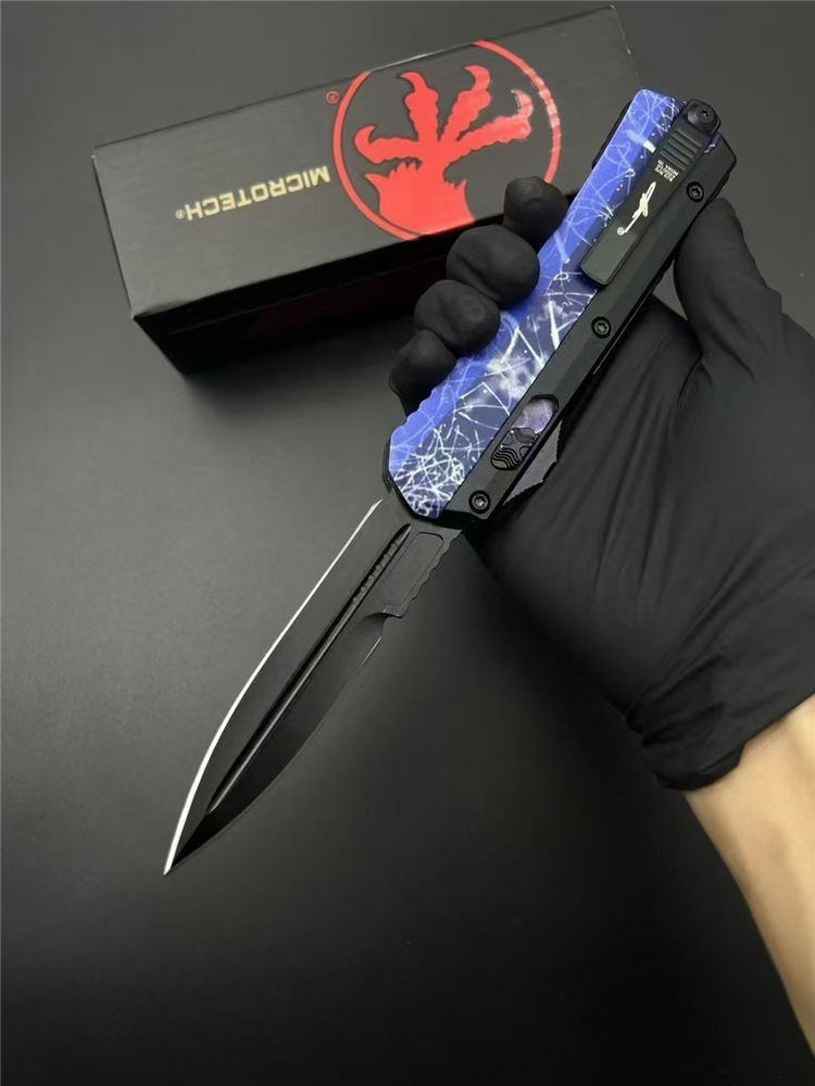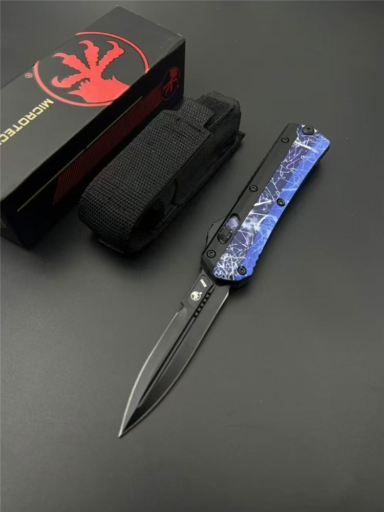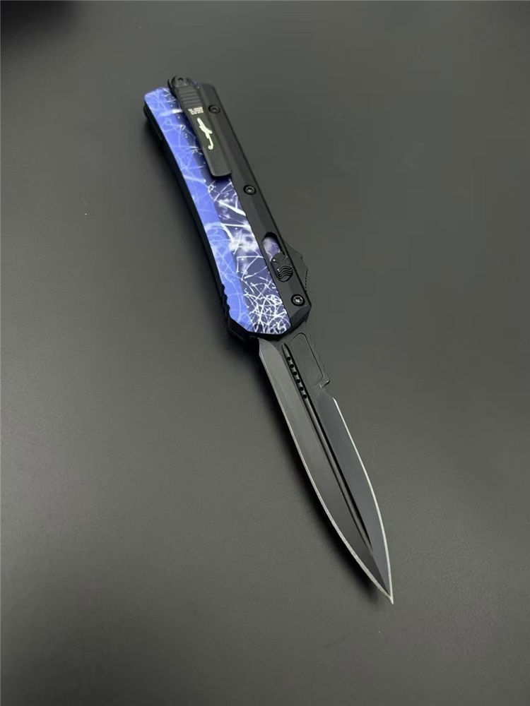 微技术定制版蛇神直出跳刀 总长:220mm 刃长:89mm 柄长:130mm 刃厚:3mm 刃材:7Cr15Mov(标M390) 柄材:锌铝合金 表面:黑钛 硬度:58HRC 重量:269g含包装 包装:尼龙套+彩盒