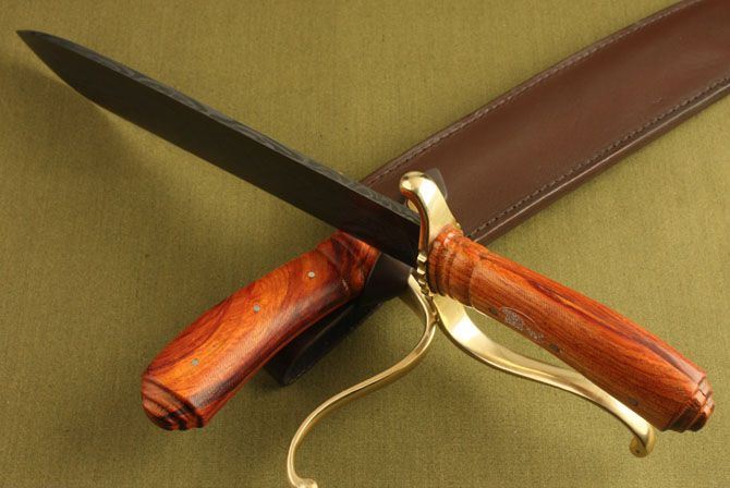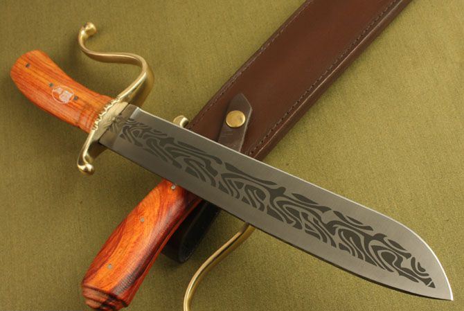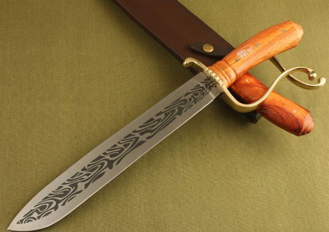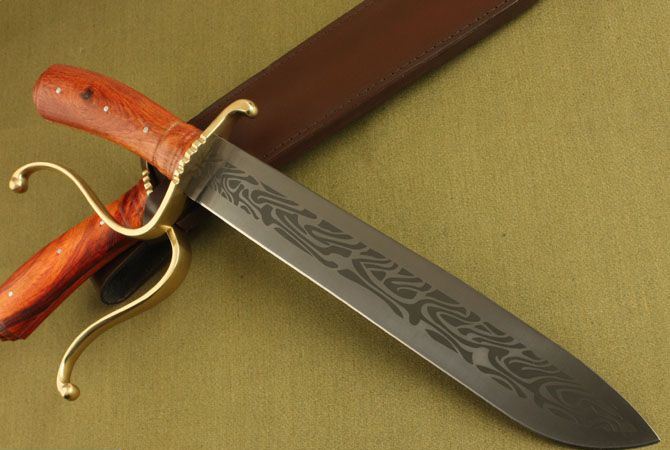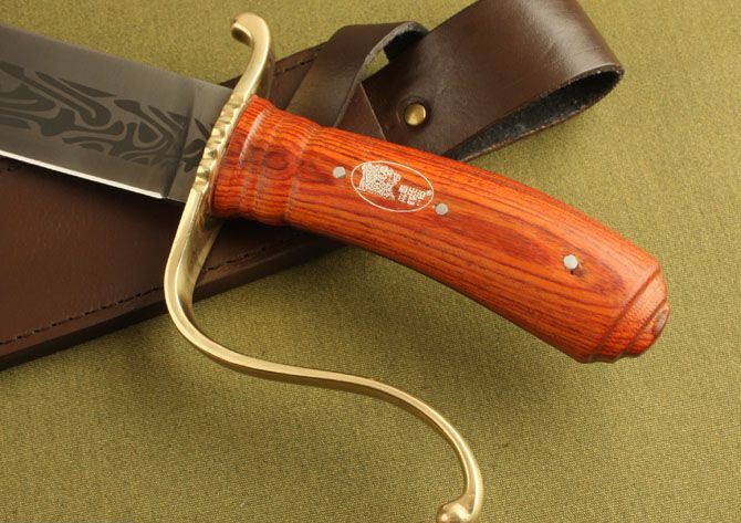 全 长:45.5cm 刃 长:31cm 刃 厚:5.7mm 刃 宽:4.2cm 柄 长:13.8cm 刃 材:440 柄 材:红酸枝木 结 构:龙骨,刀身贯穿至刀柄 硬 度:58HRC 表 面:电脑雕刻 包 装:牛皮刀套,配高档纸盒 净 重:640g 品 质:高品质