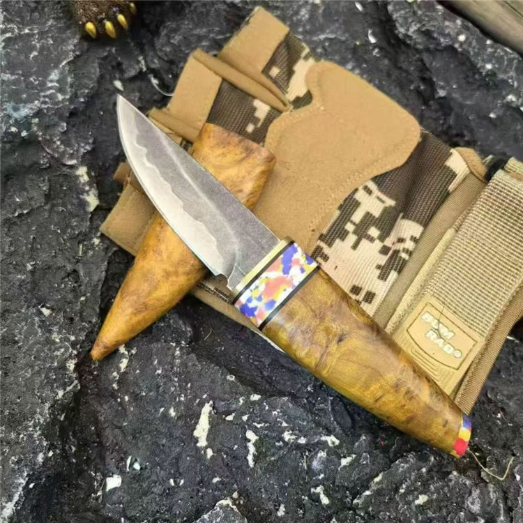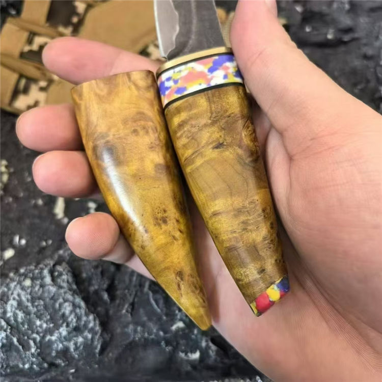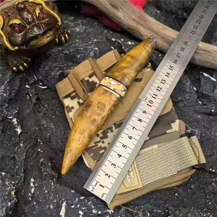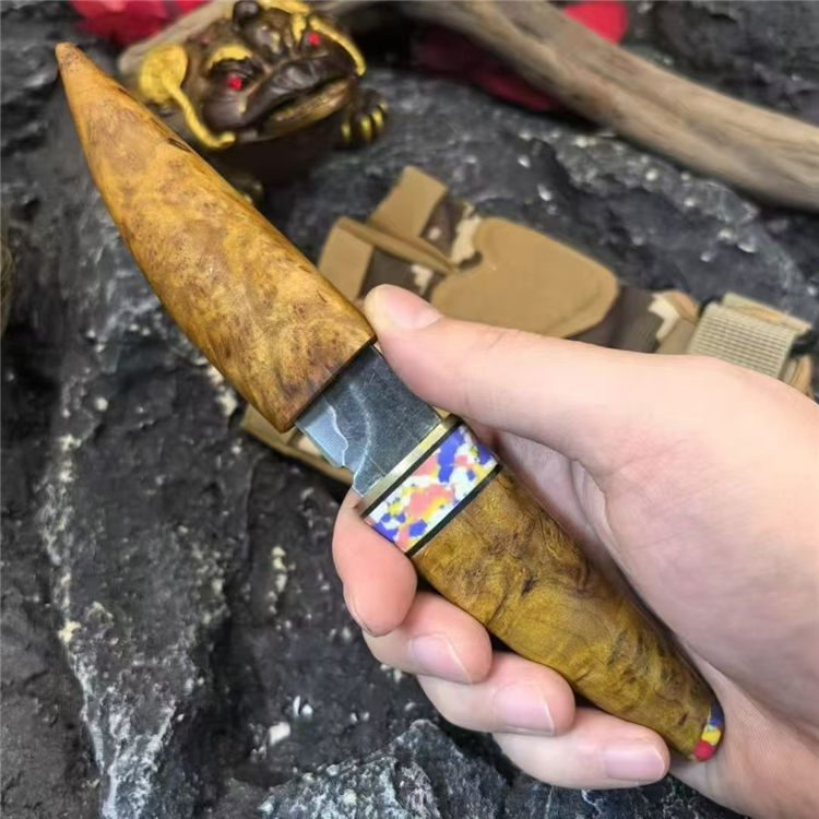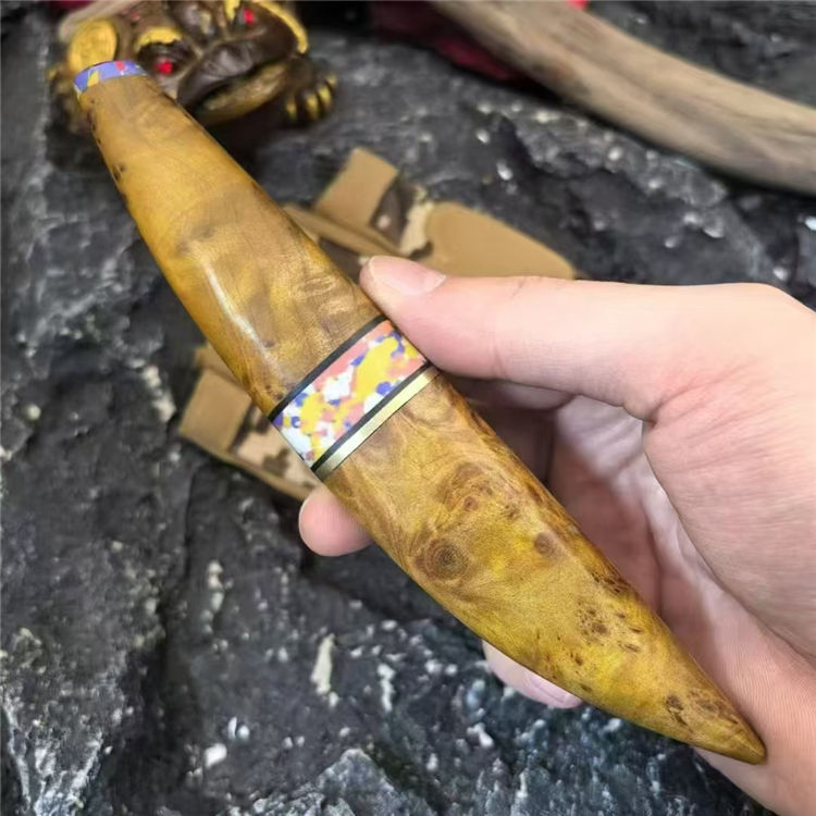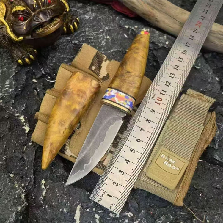 月牙崖柏木直刀 全长:160mm 刃长:70mm 刃厚:2.5mm 钢材:三枚合 手柄:鬼眼崖柏树瘤木 刀面:发黑 重量:63g 总重:110g