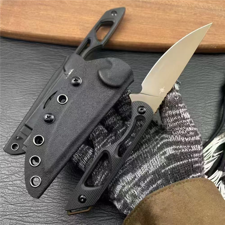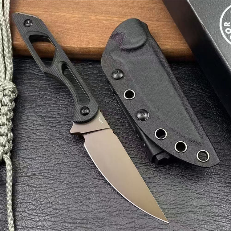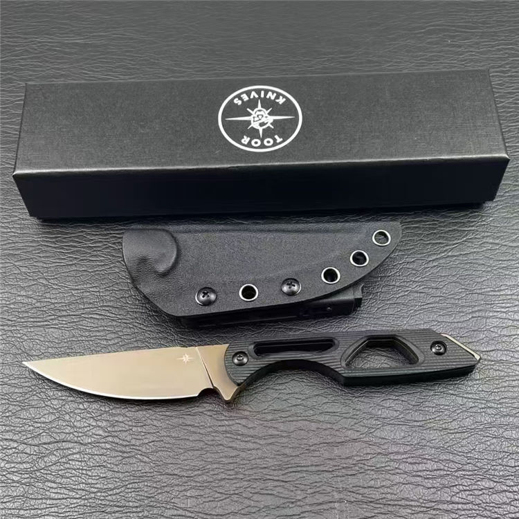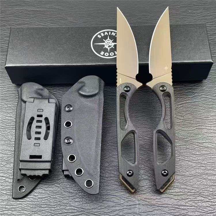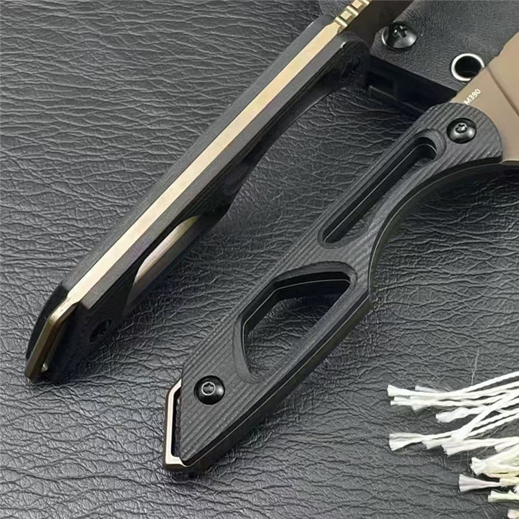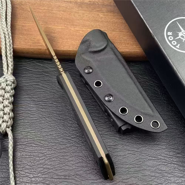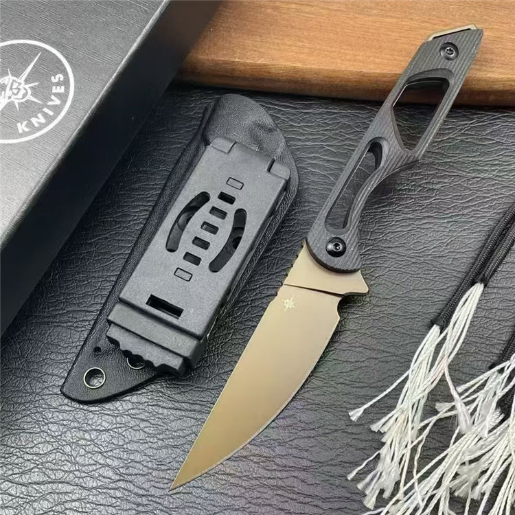 圣地亚哥金刃直刀 全长:20.6CM 刃长:8CM 柄长:12CM 刃宽:2.5CM 刃厚:4MM 刃材:M390 表面:滚光镀钛处理 柄材:一体钢柄+G10 刀重:89G/146G(含套) 毛量:216G 硬度:58-60HRC 包装:黑色礼盒