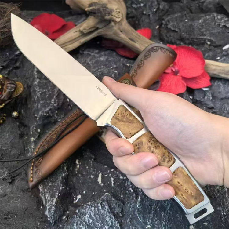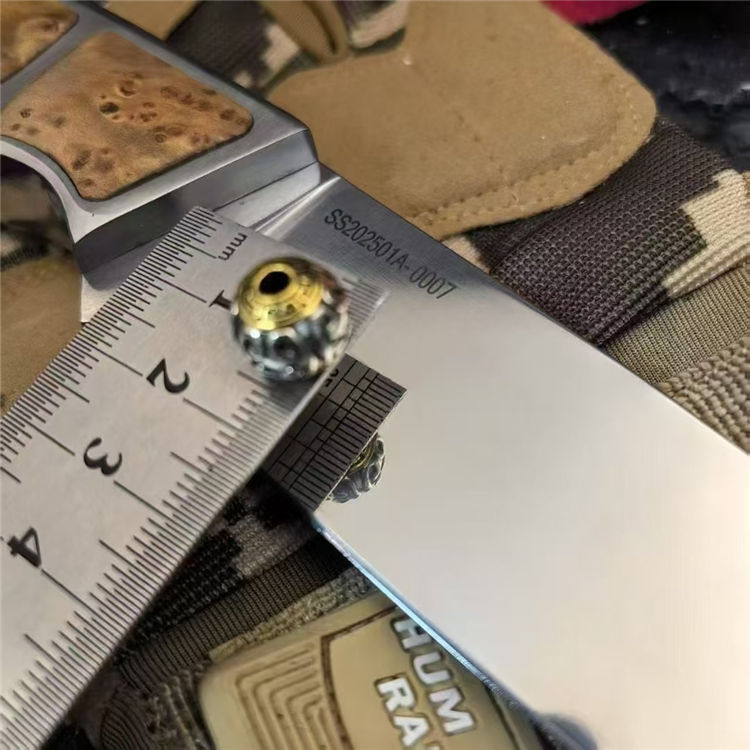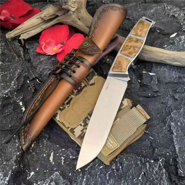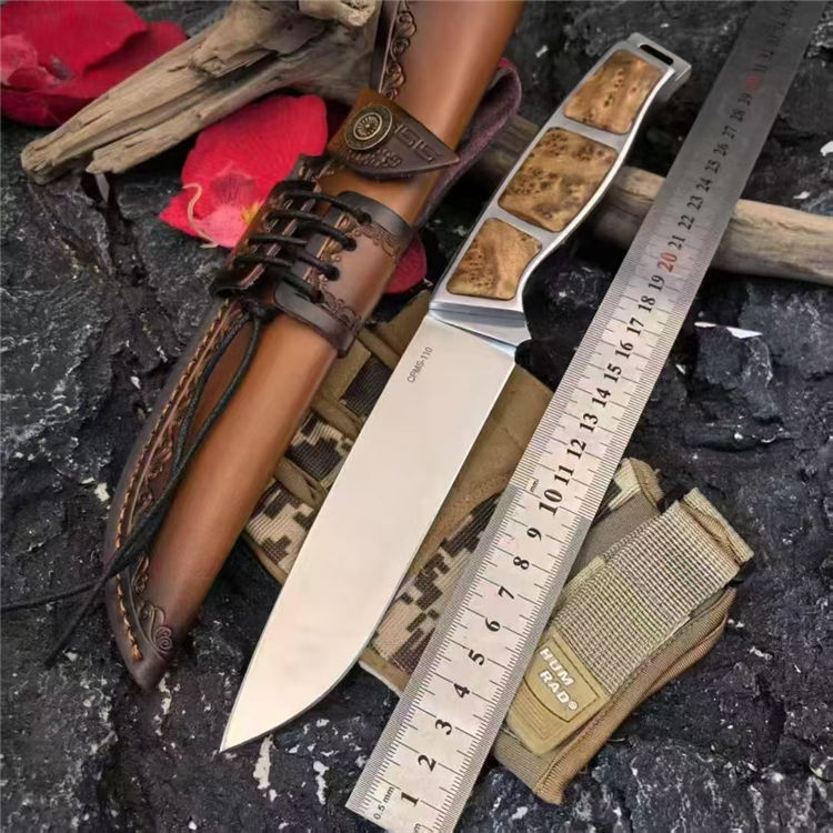崖柏将军直刀 全长:288mm 刃长:145mm 刃厚:5mm 刃宽:35mm 钢材:CPMS-110 手柄:崖柏木+钢 刀面:超镜面 硬度:60+hrc 重量:390g带套:460g 总重:582g
