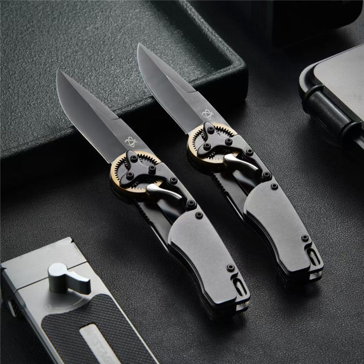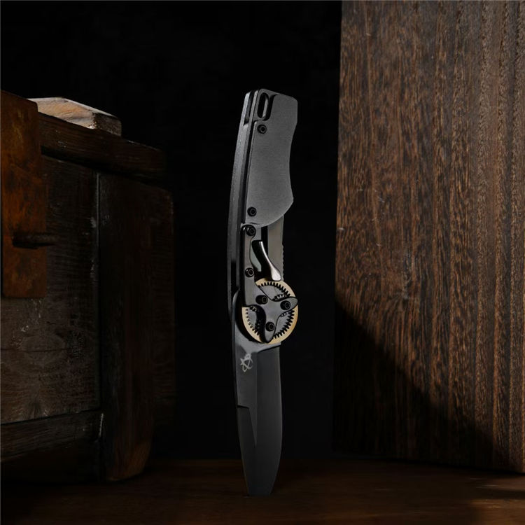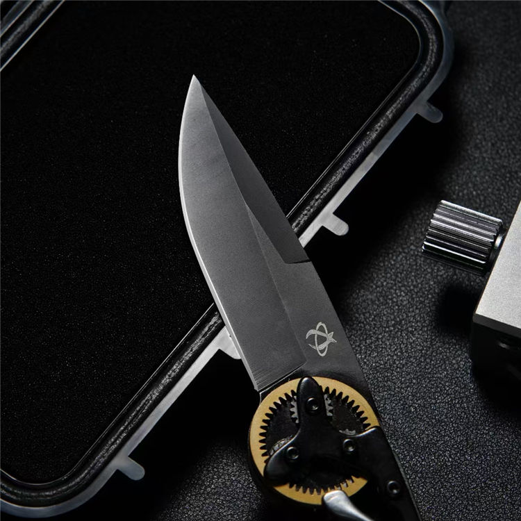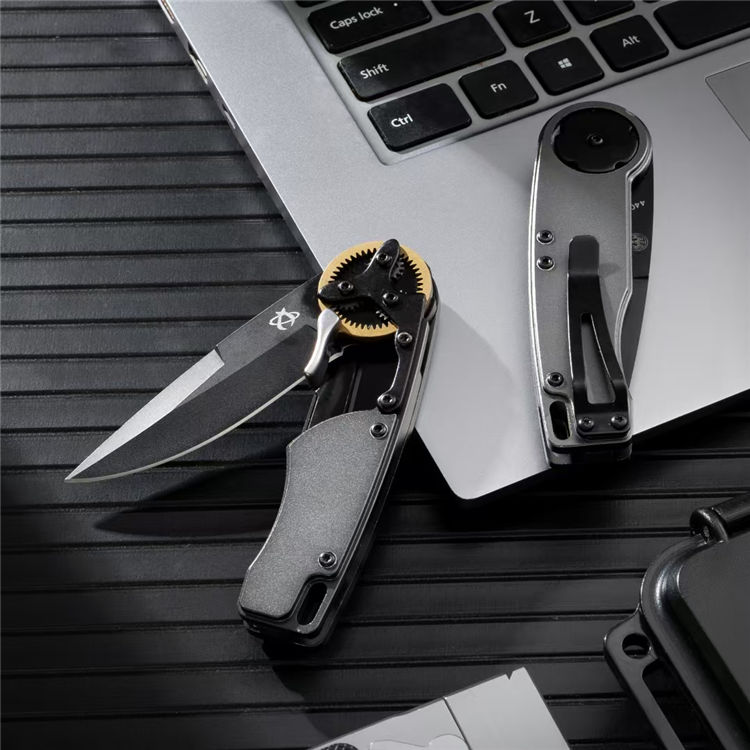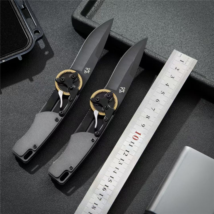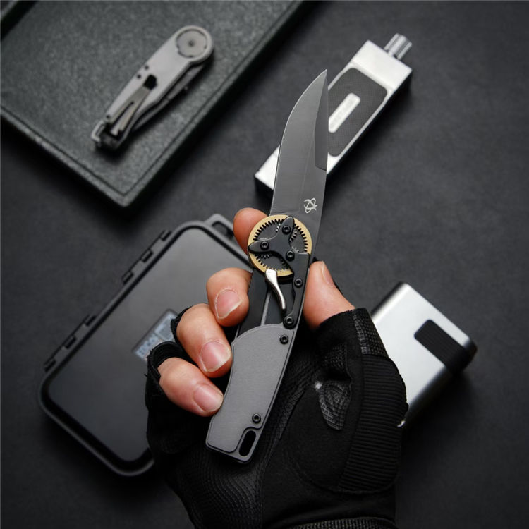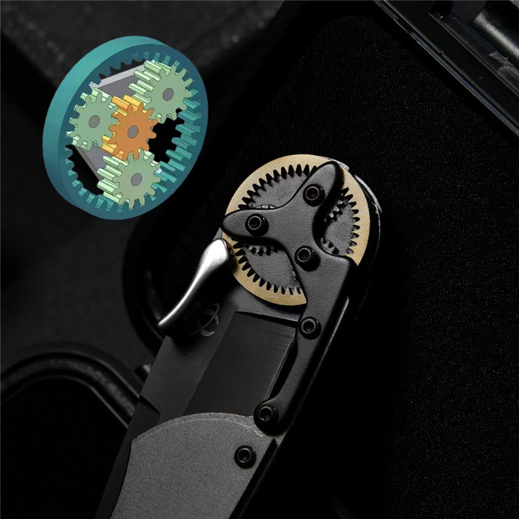 减速机系列齿轮折刀 全长:180mm 刃长:70mm 柄长:110mm 刃厚:2.7mm 硬度:58HRC 重量:103克 刃材:8CR13 柄材:航空铝+430钢 刀型:新款机械型折叠刀 工艺:数控CNC+数控研磨+精密线切割加工