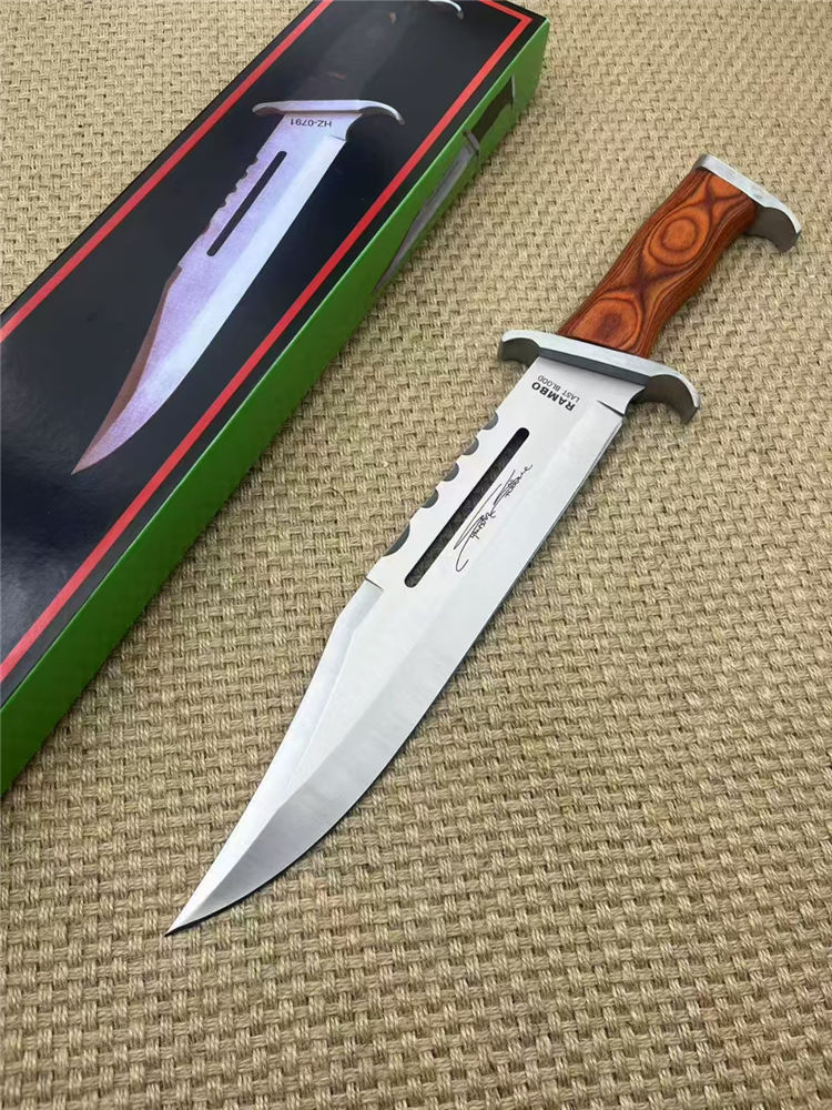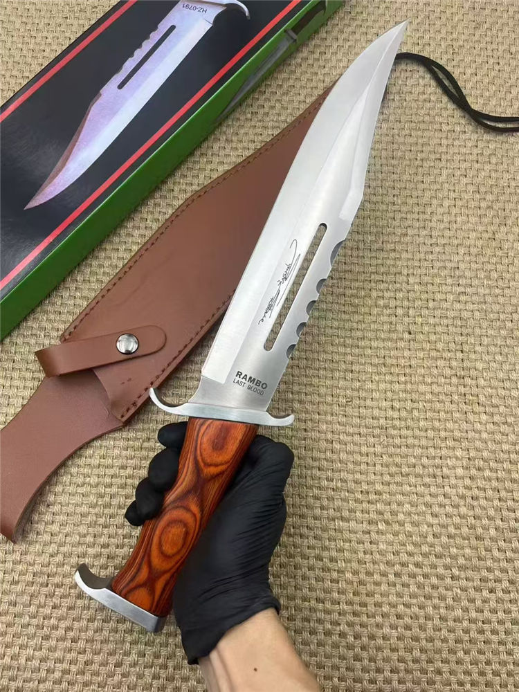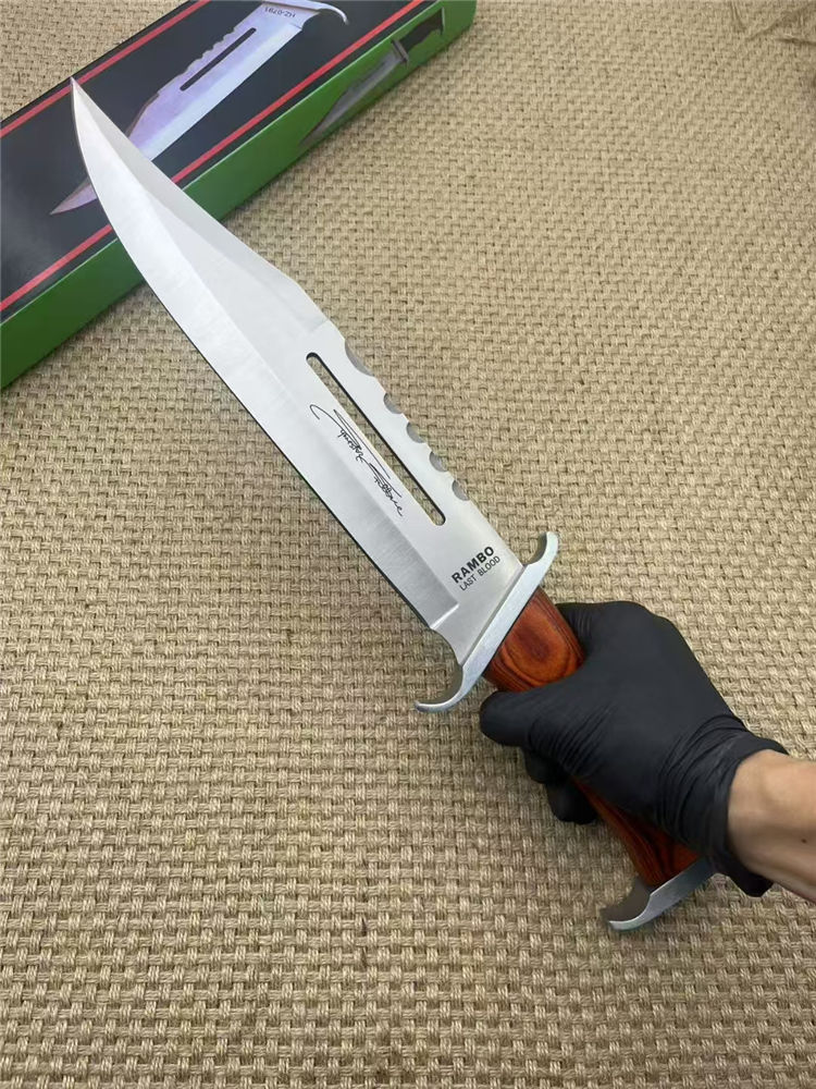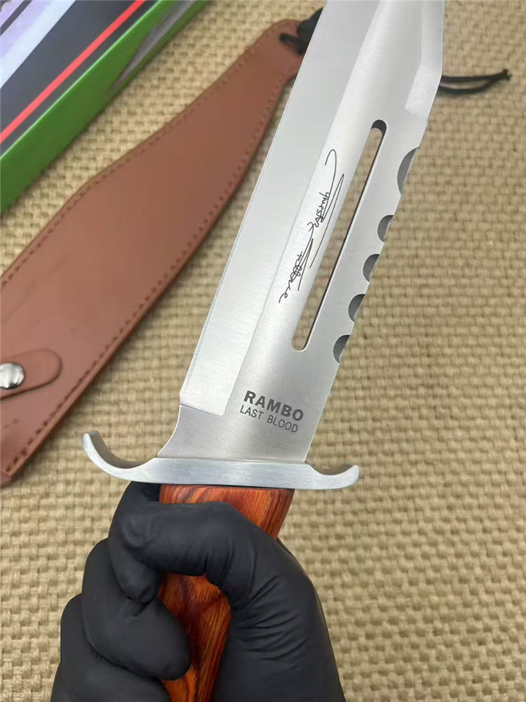 一体版兰博3号直刀 全长:40.5cm 刀刃:28cm 刃厚:6.0mm 刃宽:4.8CM 柄长:12.5cm 柄材:彩木 柄厚:2.3cm 材料:8cr13MOV 硬度:58HRC 净重:960克 毛重:1000克(包含盒子和皮套) 表面:纯手工砂光