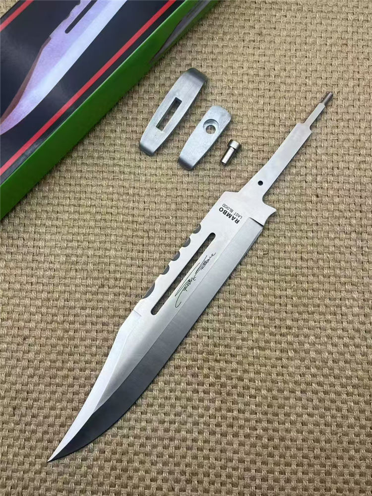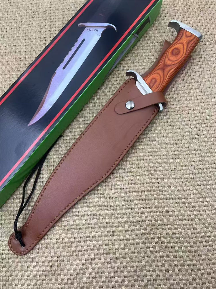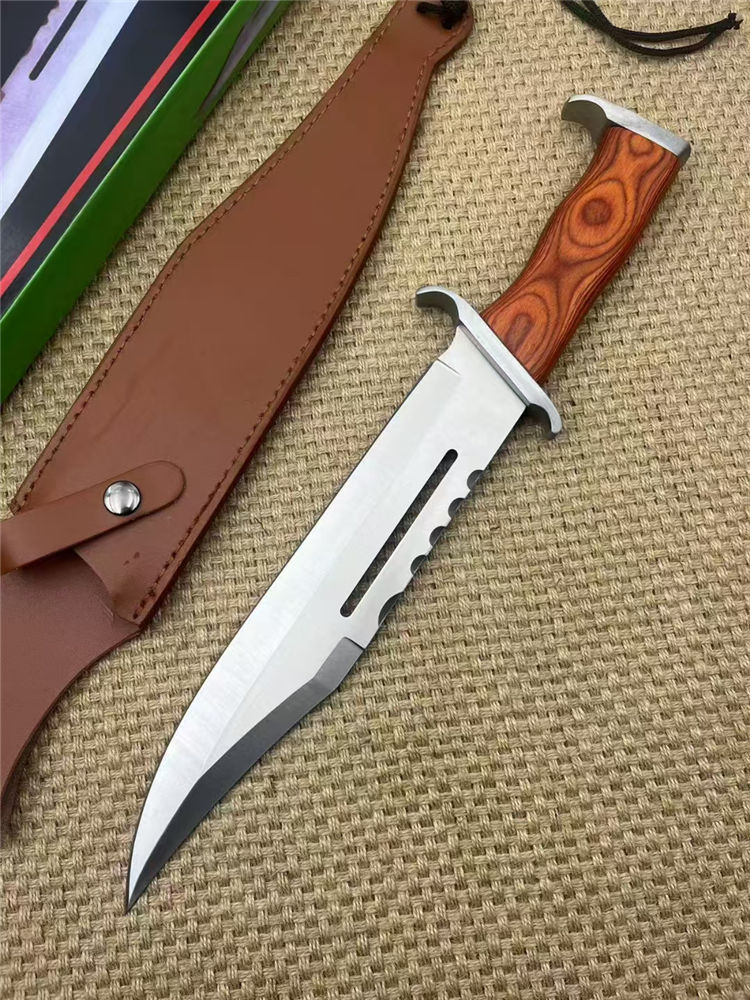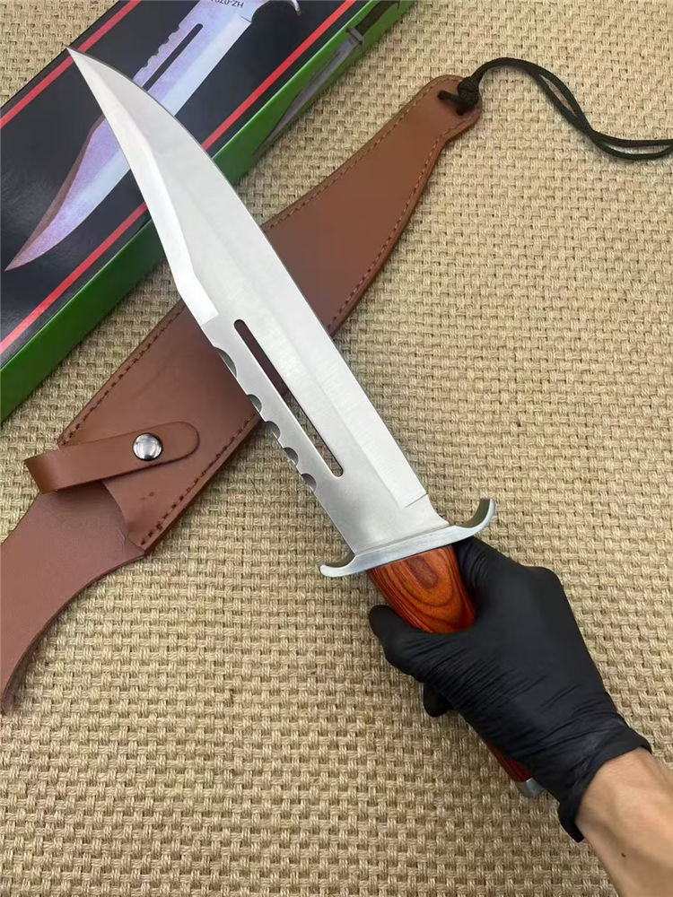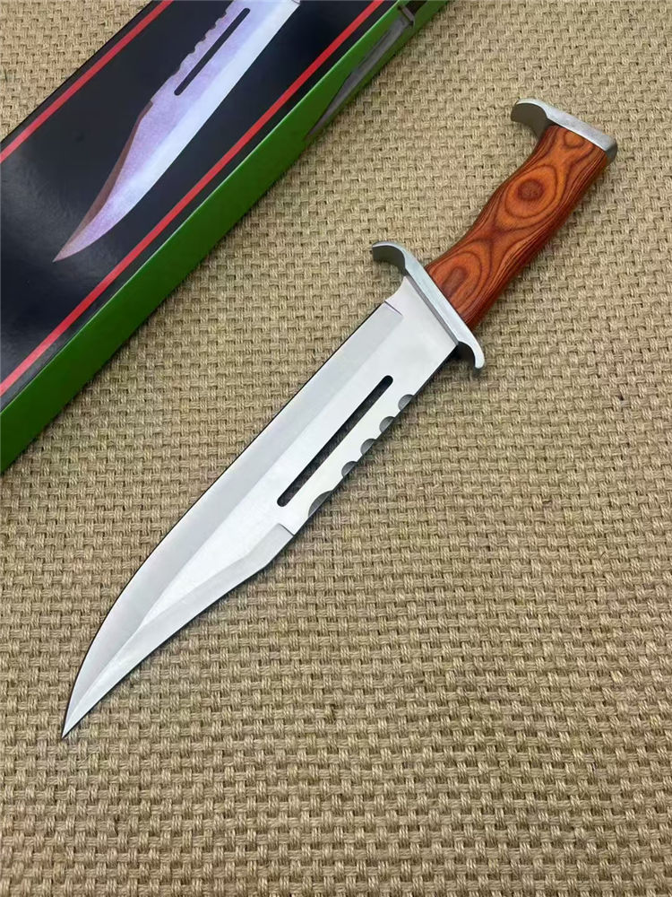 一体版兰博3号直刀 全长:40.5cm 刀刃:28cm 刃厚:6.0mm 刃宽:4.8CM 柄长:12.5cm 柄材:彩木 柄厚:2.3cm 材料:8cr13MOV 硬度:58HRC 净重:960克 毛重:1000克(包含盒子和皮套) 表面:纯手工砂光