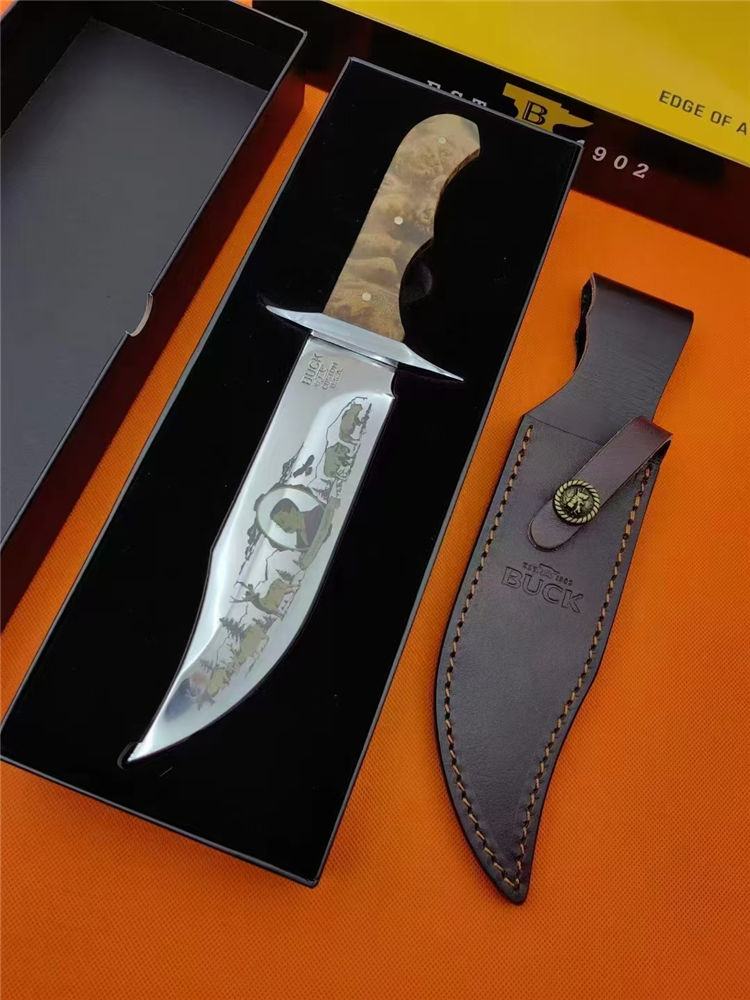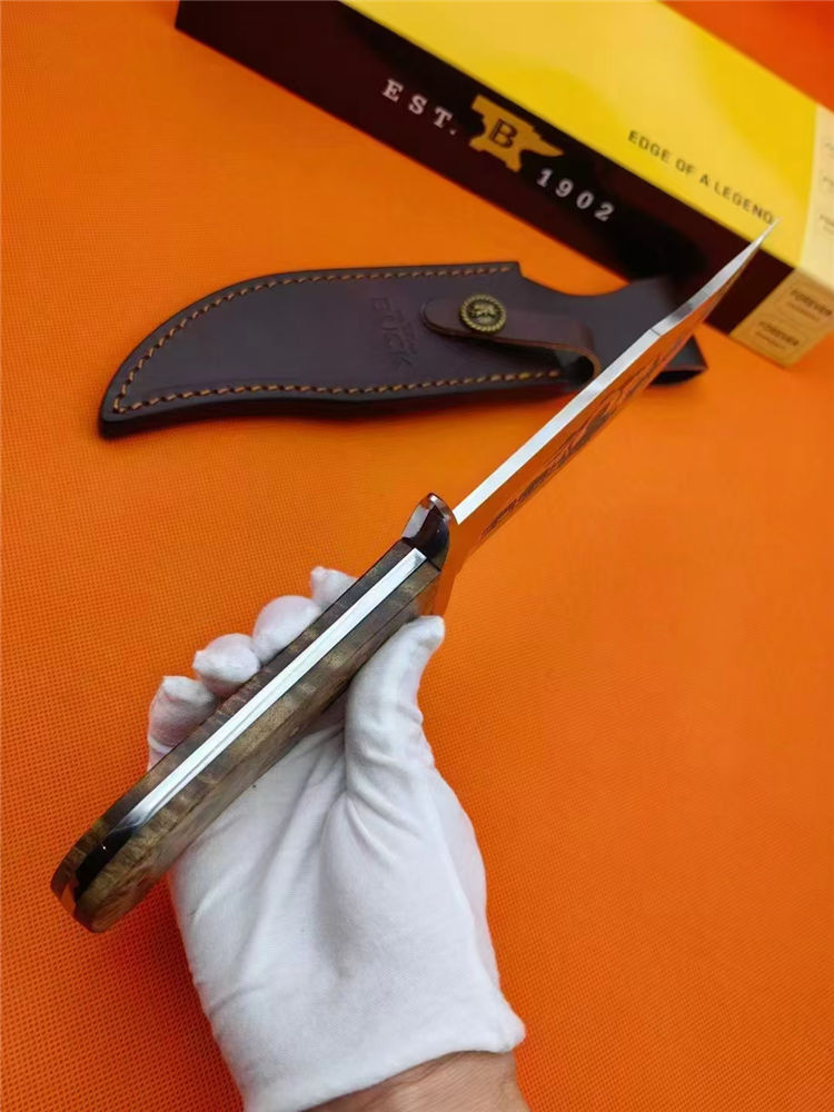 巴克001周年纪念版直刀 全长:31.5cm 刃长:17cm 刃厚:5mm 刃宽:4.3cm 刃材:420HC 硬度:59HRC 表面:数控精刻 镜面抛光 柄材:稀贵白影木材 刀重:326g