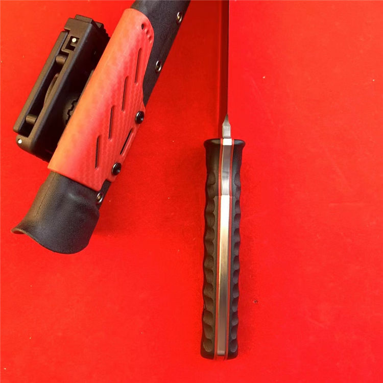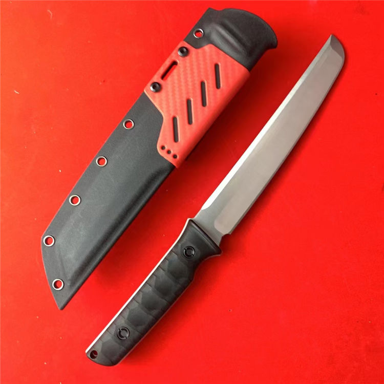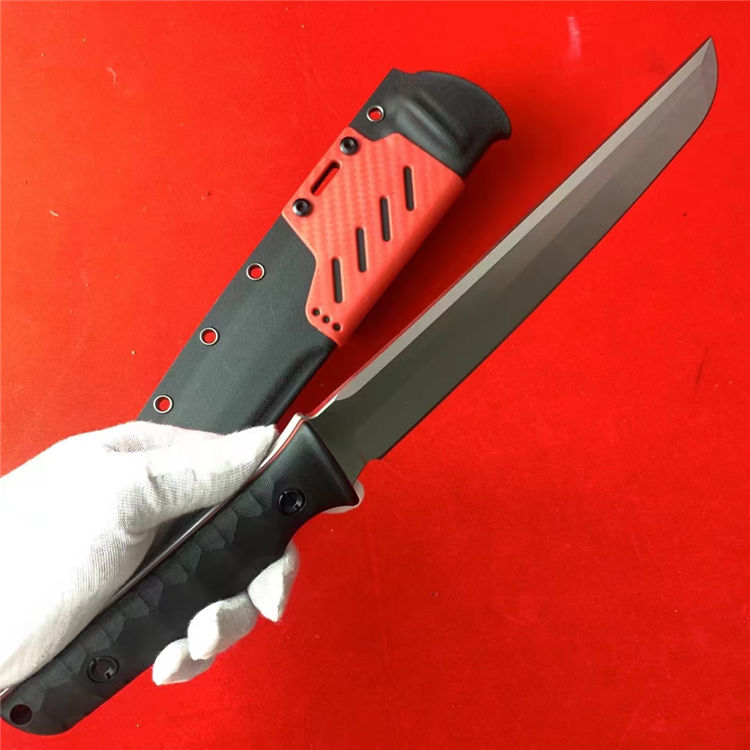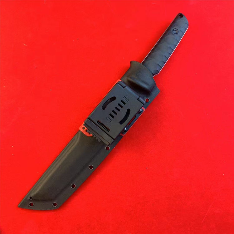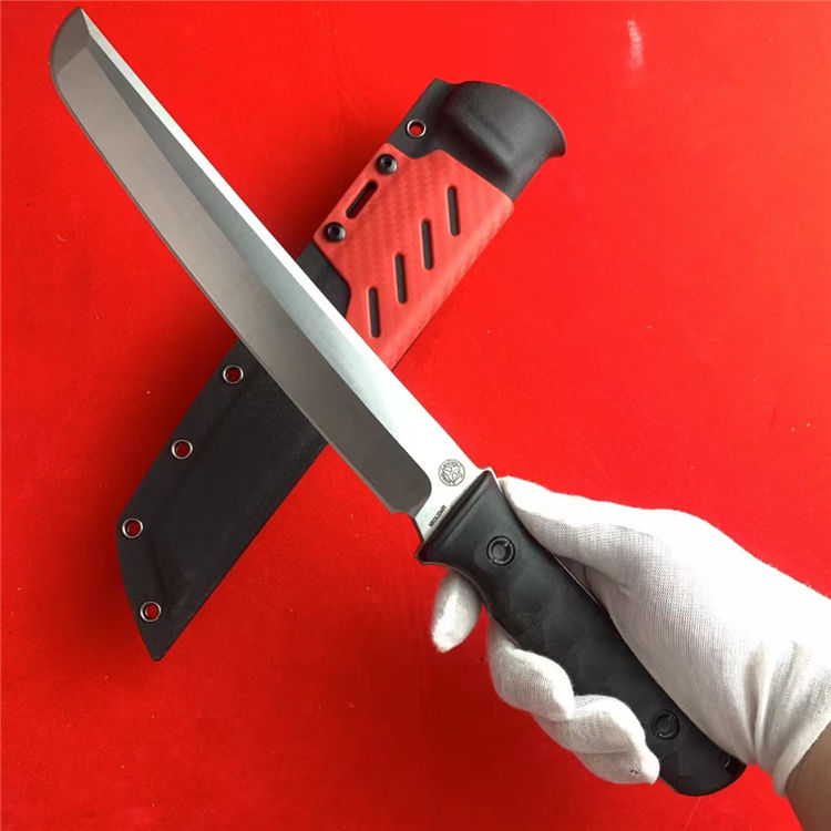 熊头联名防御大师武士直刀 总长:37cm 刃长:22.5cm 柄长:13.8cm 刃厚:5mm 刃宽:3.5cm 刃材:8Cr18MOV 柄材:双色尼龙玻璃钎维 硬度:59-60HRC 重量:451g(净重)640g(含K鞘)