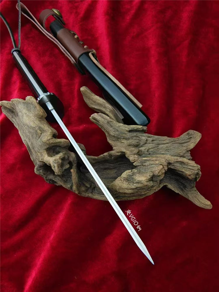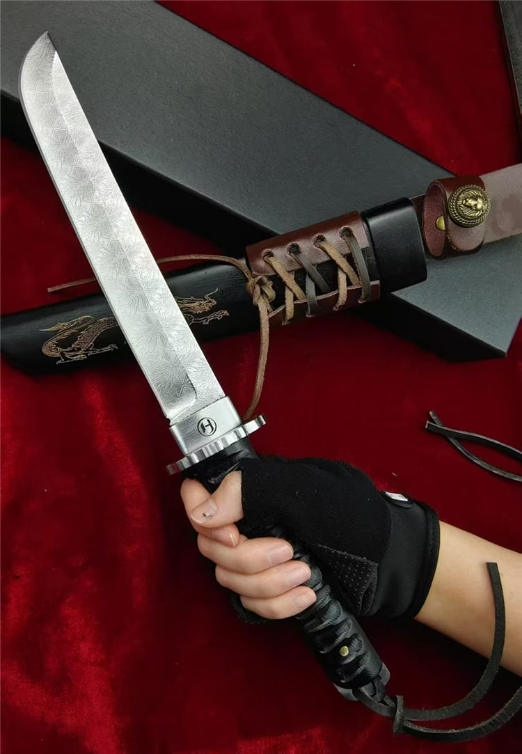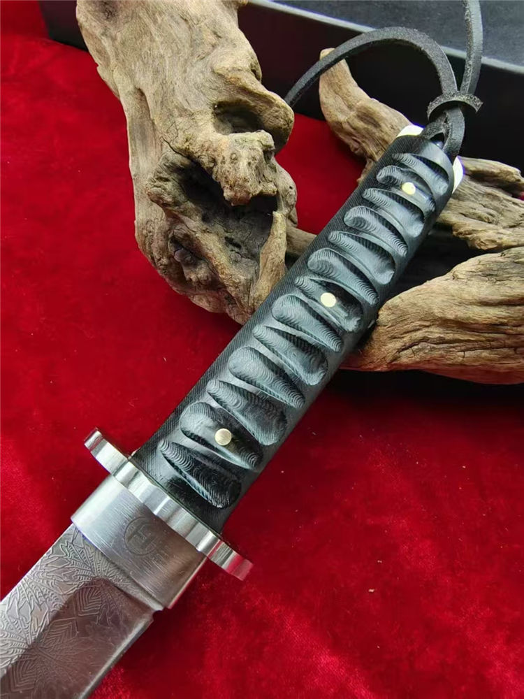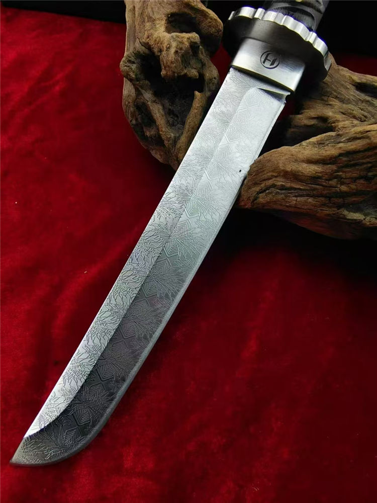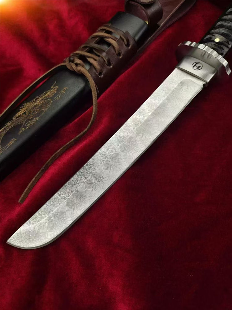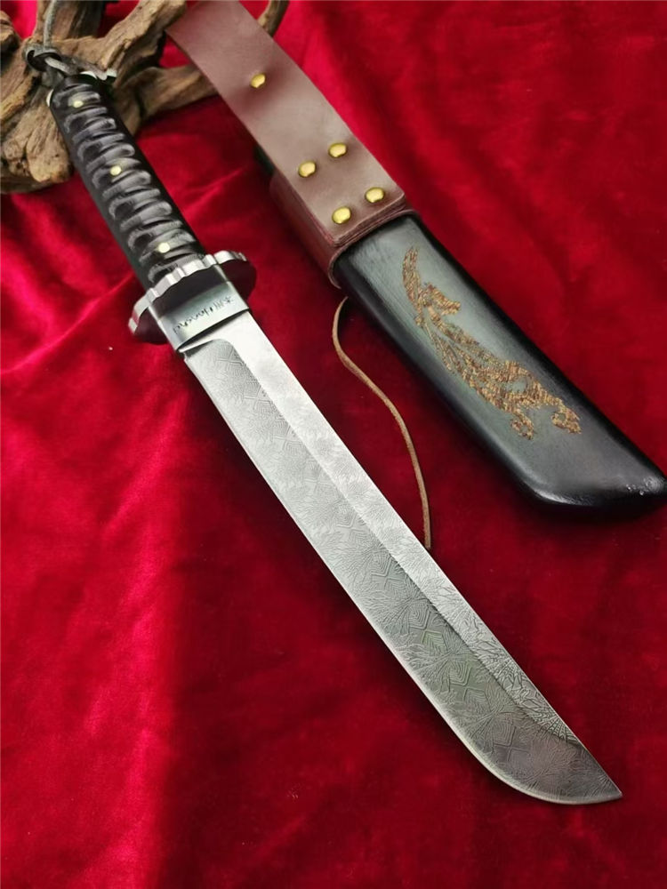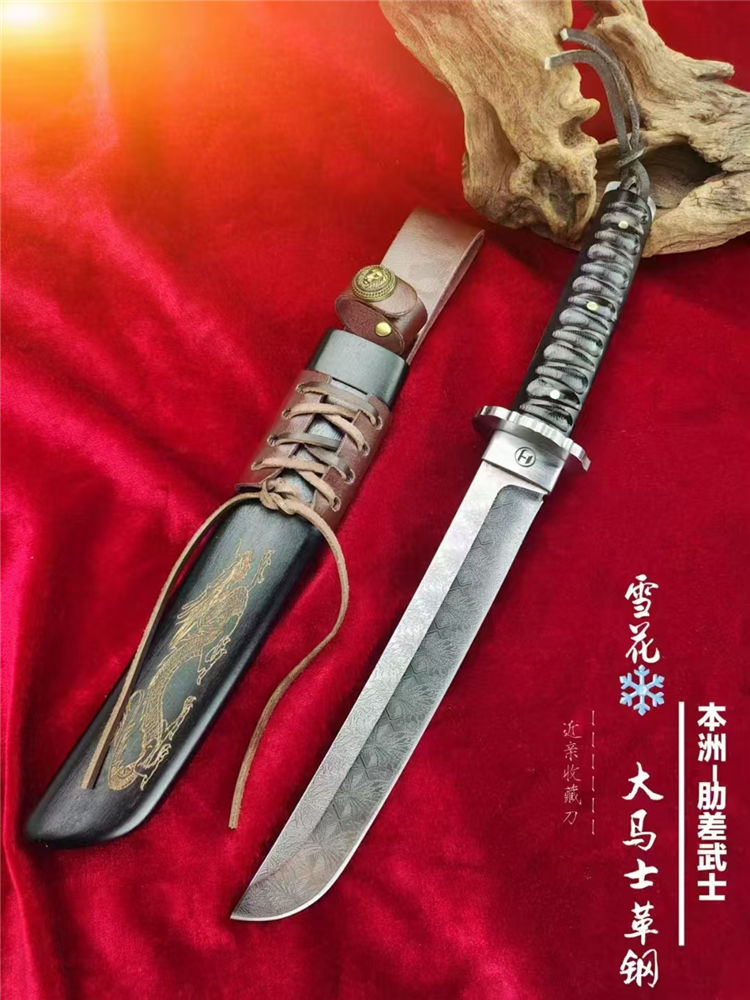 大马士革本州雪花武士直刀 全长:360mm 刃长:200mm 柄长:145m 刃宽:30mm最宽处 刃厚:5.2mm 刃材:进口瑞粉雪花❄️大马士革钢 刀重:460g 硬度:60-62HRC 表面:镜光大平面磨,原钢材雪花纹 柄材:印属进口黑檀木材料 结构:一体龙骨贯穿 配套:印尼进口黑檀木,手工CNC电脑雕刻龙凤图腾木鞘 包装:高端黑礼盒