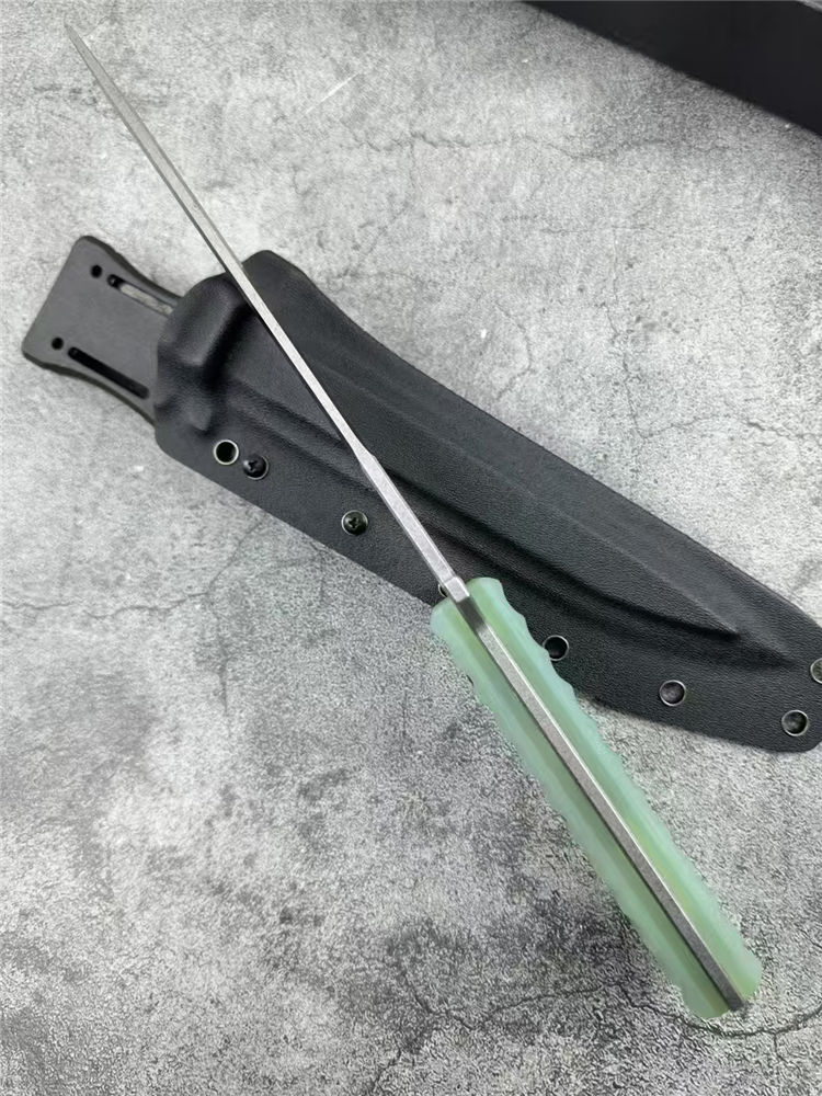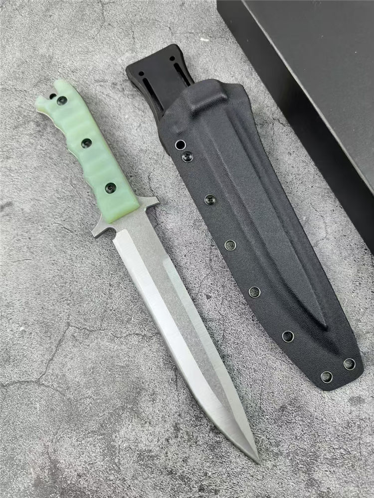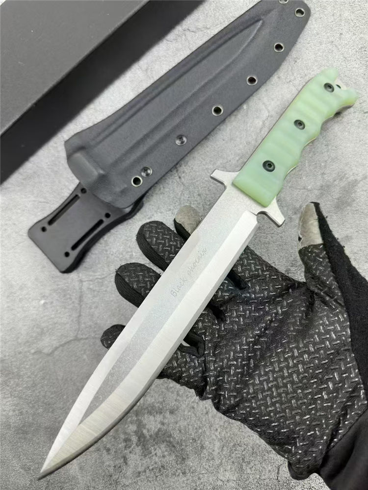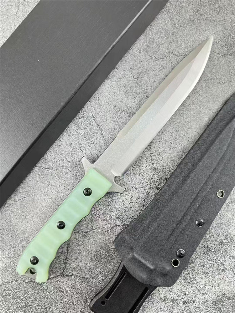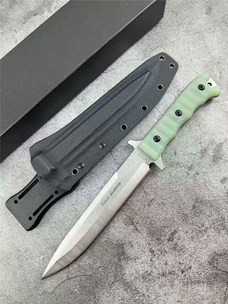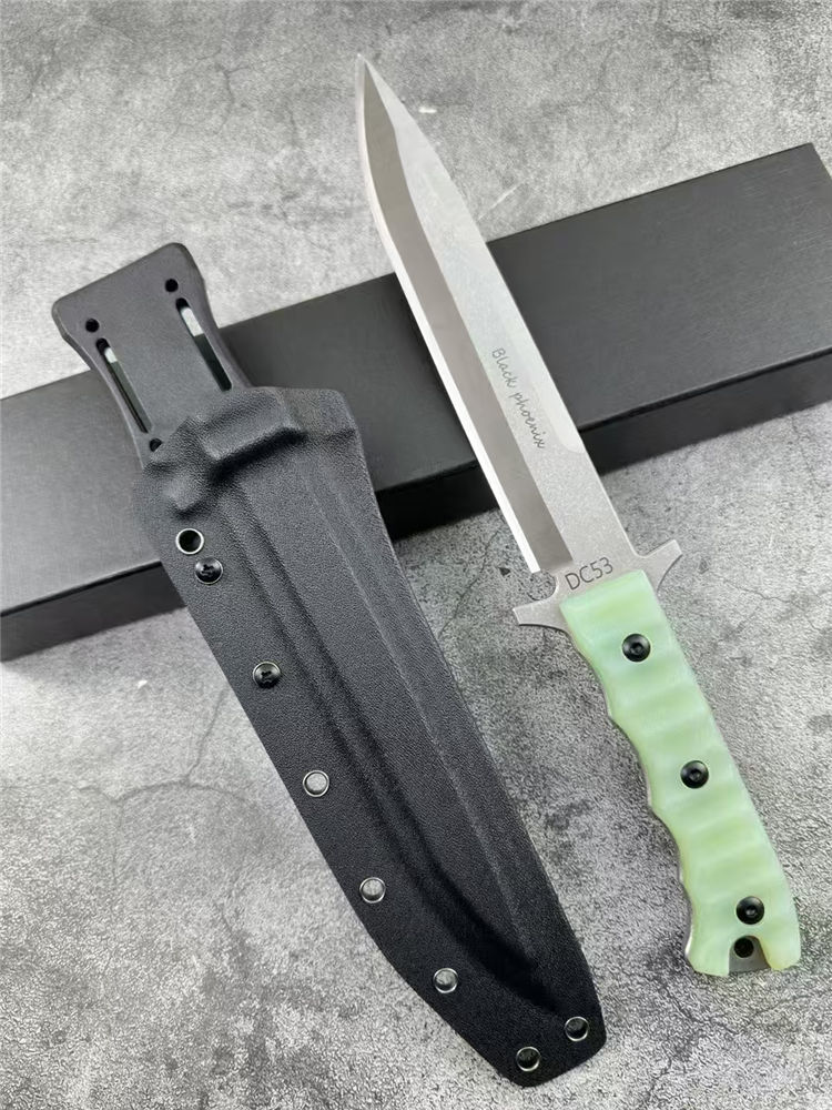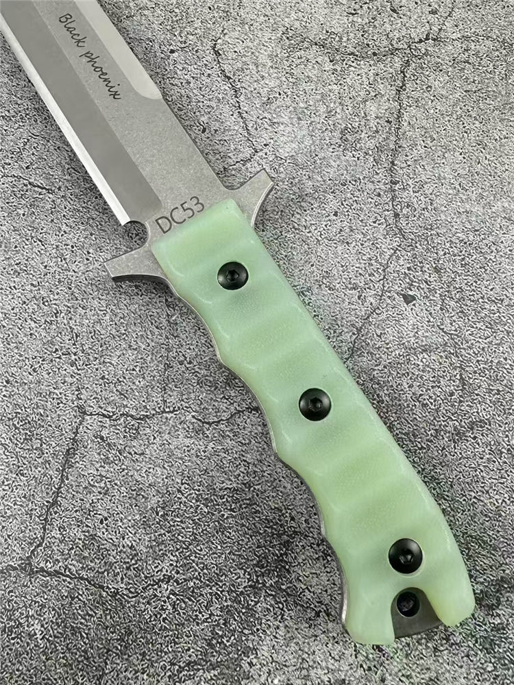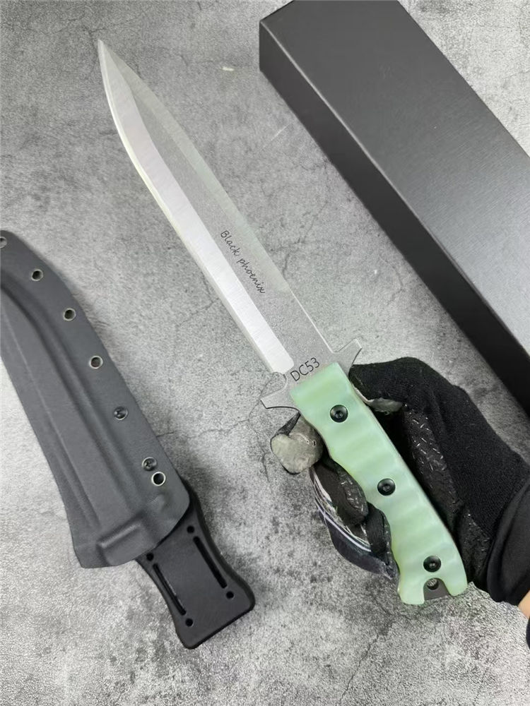 DC53俄罗斯凤凰直刀 全长:33.6cm 刃宽:3.5cm 厚度:6mm 刃长:19.3cm 刃材:DC53钢 裸重:440克(不含鞘),含包装盒鞘重:710克 硬度:60HRC(真空深冷处理) 手柄:CNC雕刻进口G10材料 表面:砂光效果 刀鞘:美国进口Kydex板材