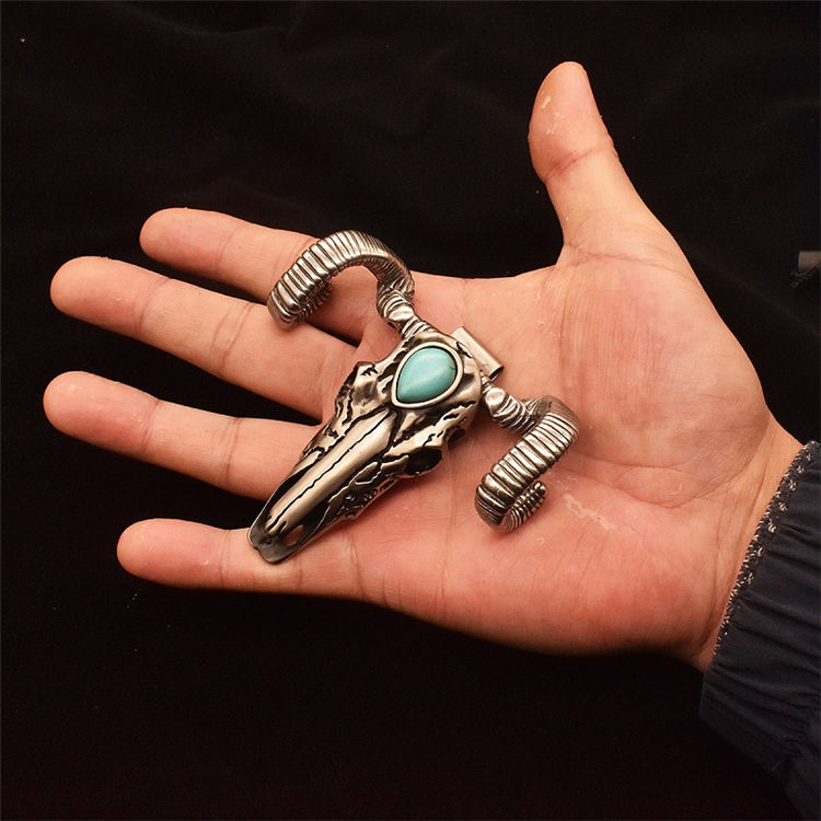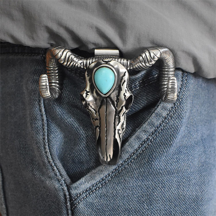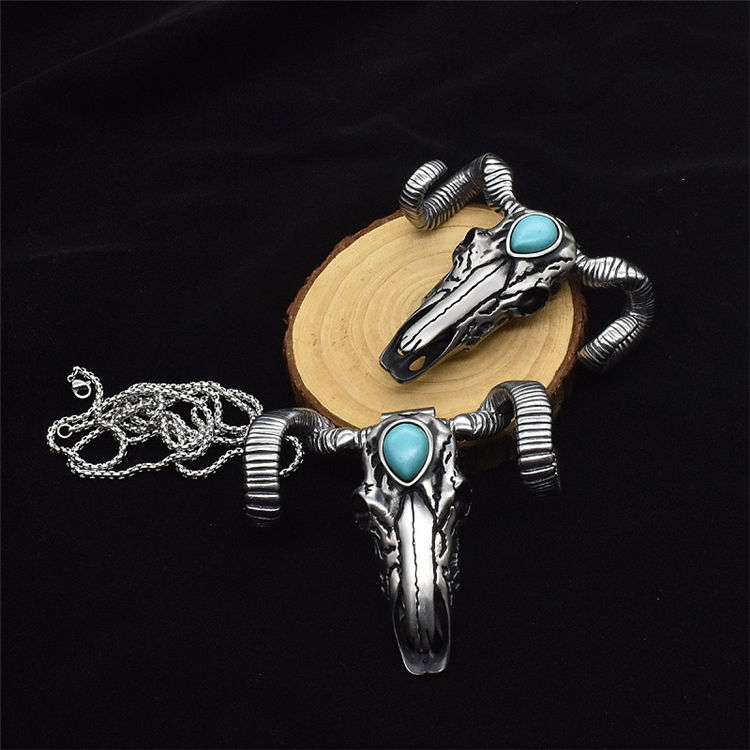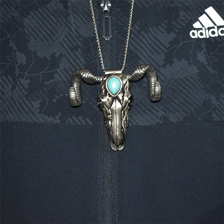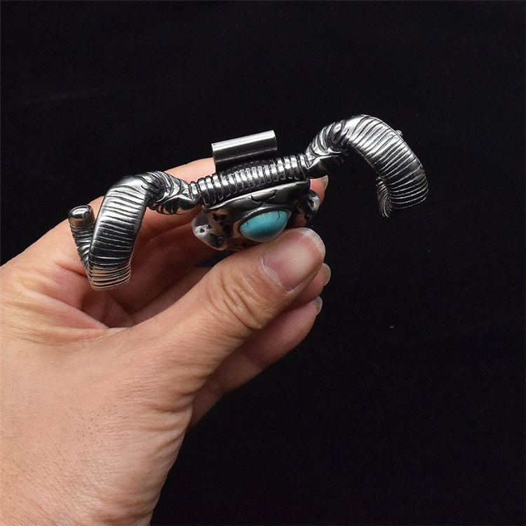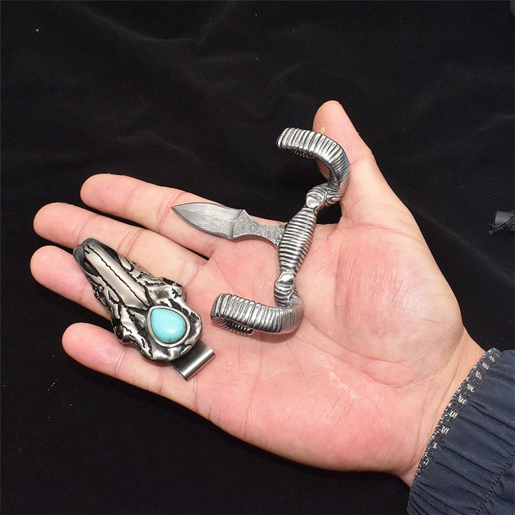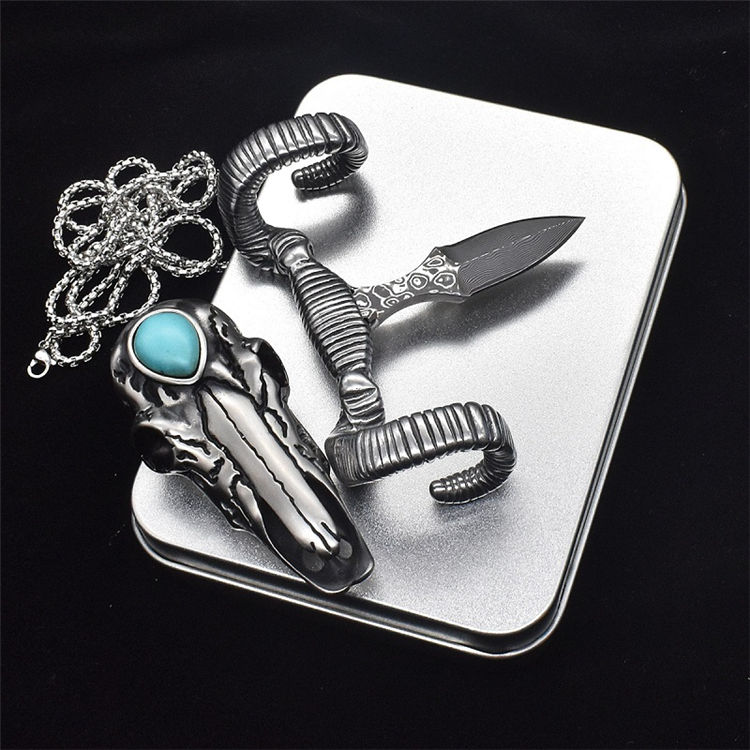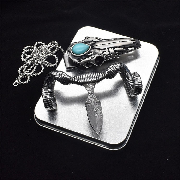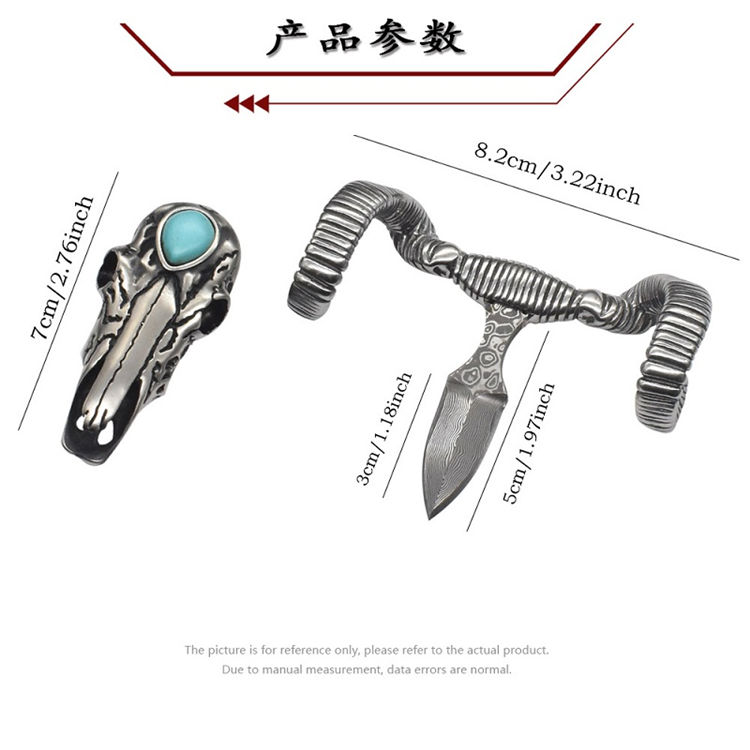 大马士革绿松石羊头手刺 全长:7cm 头宽:8.2cm 刃长:5cm 头材:316不锈钢+绿松石 刃材:VG10大马士革钢 重量:134克