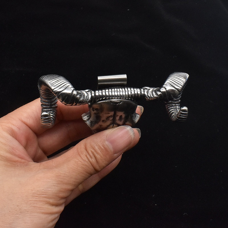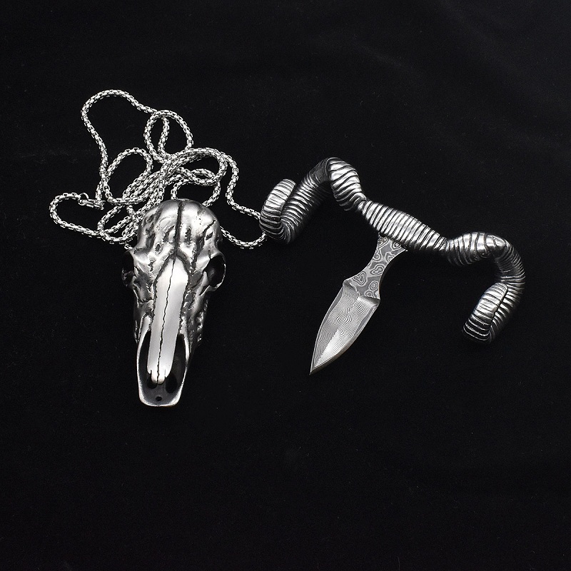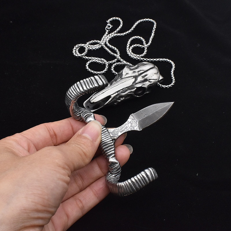 大马士革羊头手刺 全长:7cm 头宽:8.2cm 刃长:5cm 头材:316不锈钢 刃材:VG10大马士革钢 重量:127克