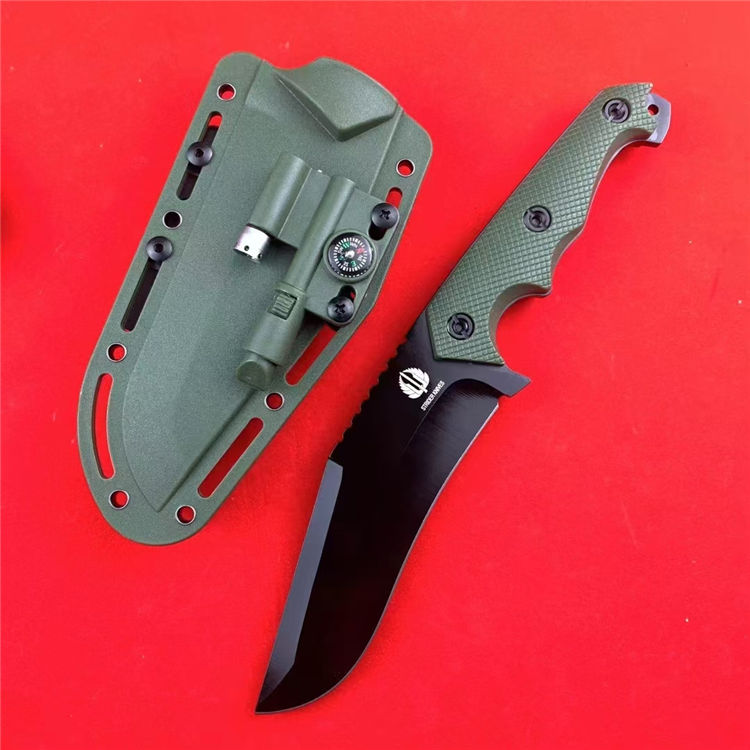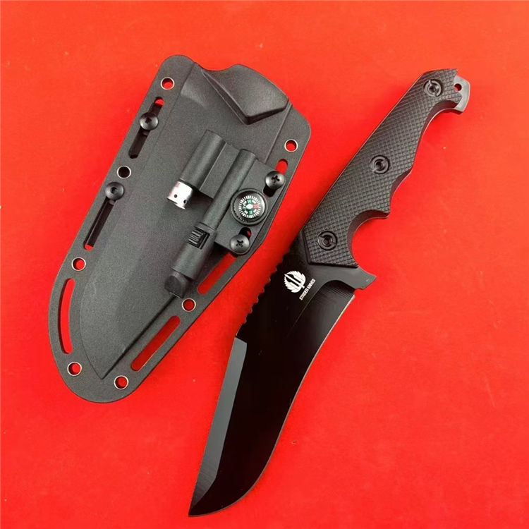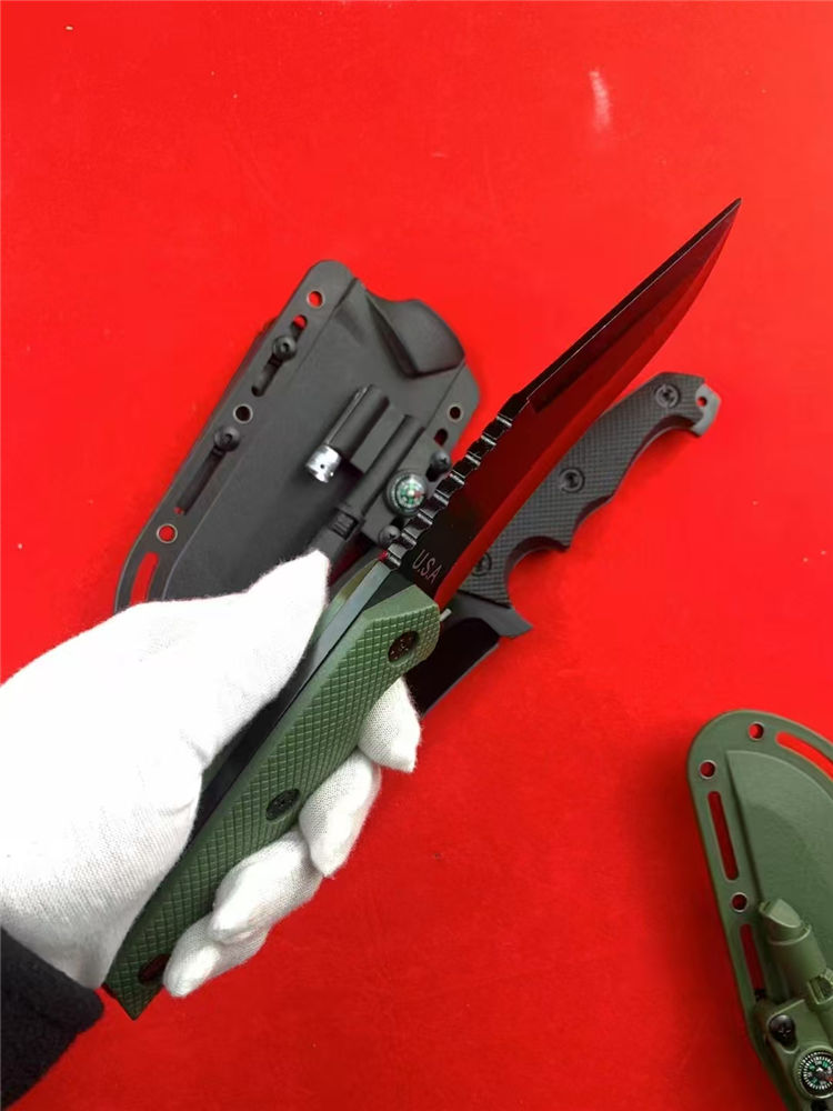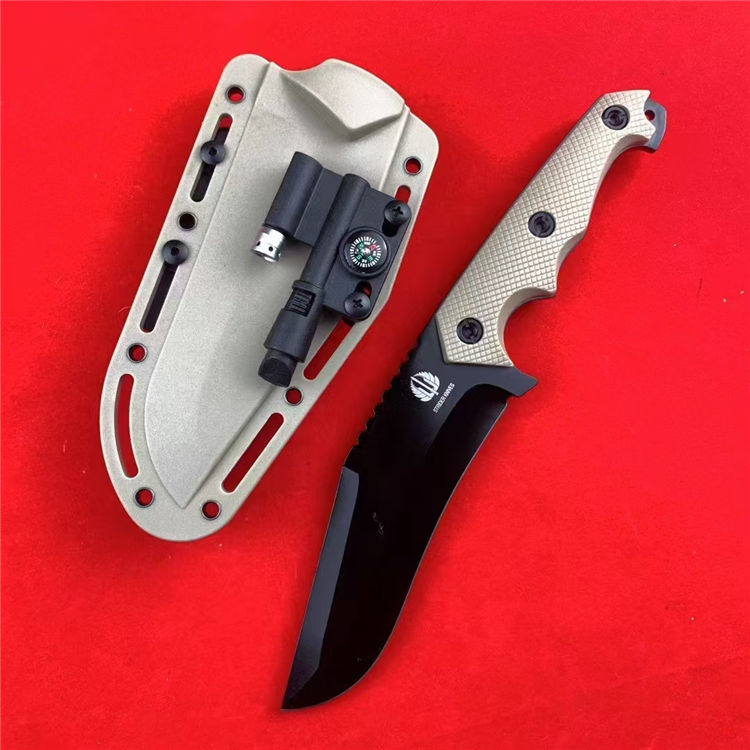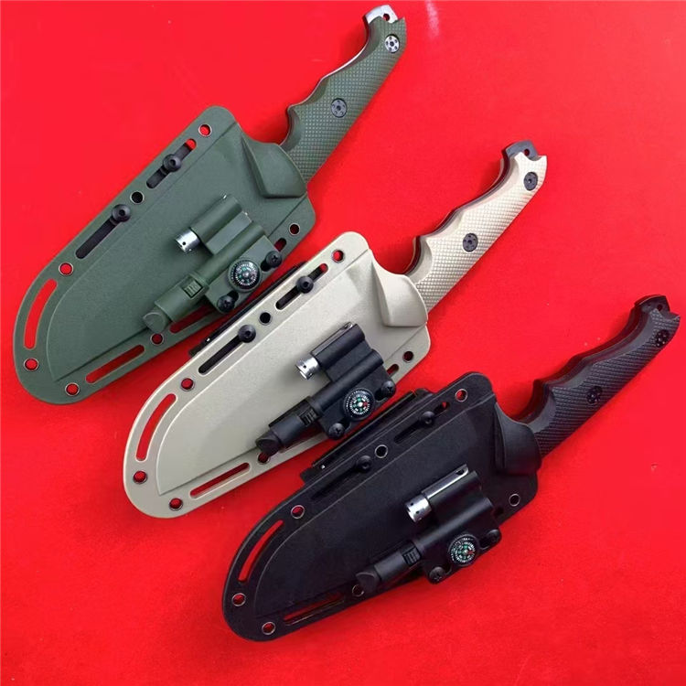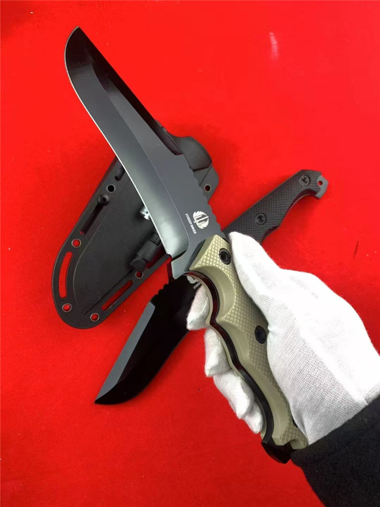 挺进者改款小弯直刀 总长:26.5cm 刃长:14cm 柄长:12.5cm 刃宽:4.3cm 刃厚:5mm 刃材:7CR13MVO 柄材:尼龙玻璃钎维 硬度:58-59HRC 重量:297g(净重)415g(含K鞘) 配置:K鞘,小灯,打火石