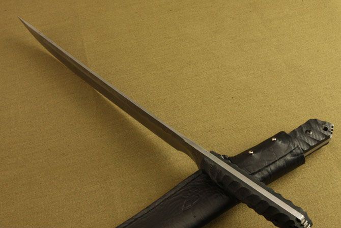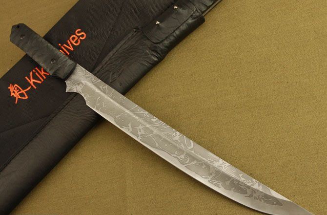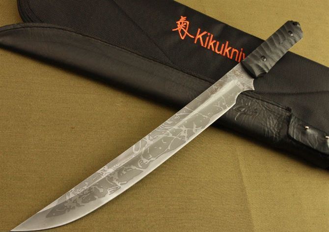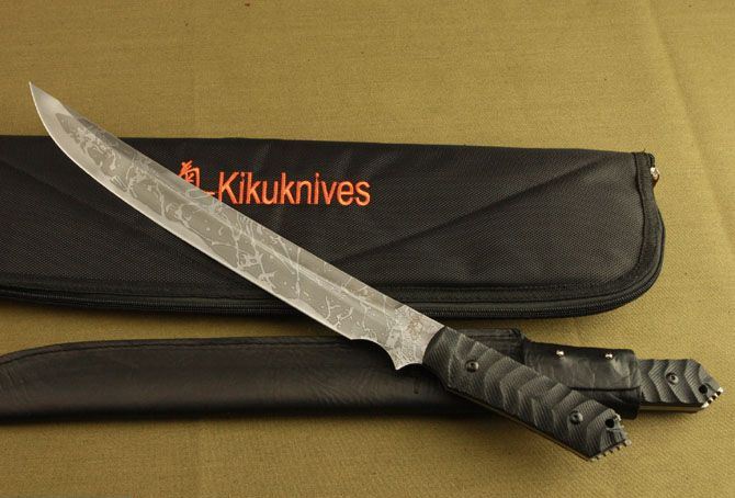 松田菊男之长刀1号 全长:48CM 刃长:34CM 刃材:7Cr17 硬度: 60HRC 刃厚: 0.6 CM 刃宽:4.4CM (最宽处) 柄长: 13CM 柄材: 米卡塔 刀鞘:皮套 刀重:520g 重量:800g
