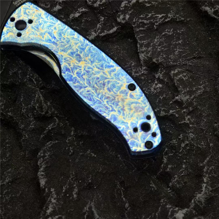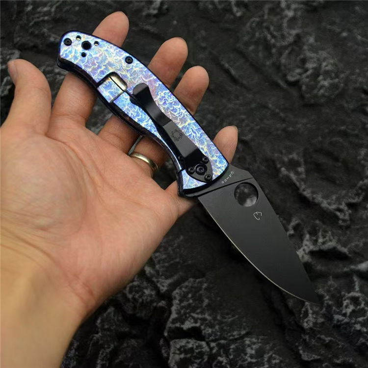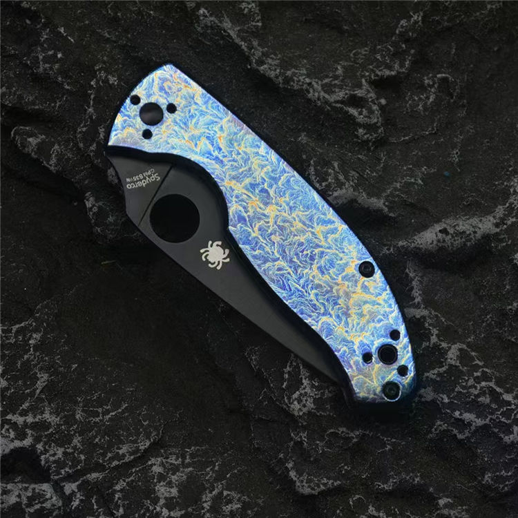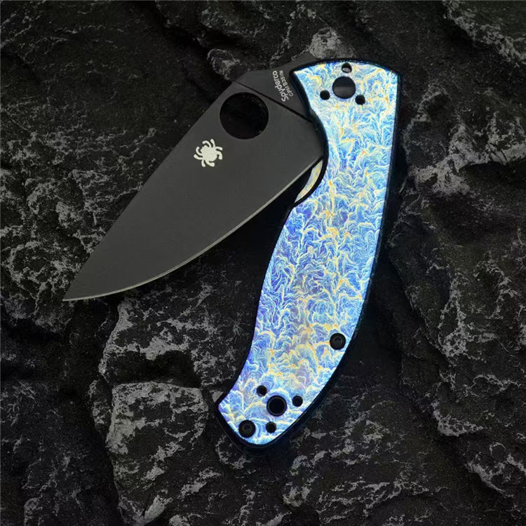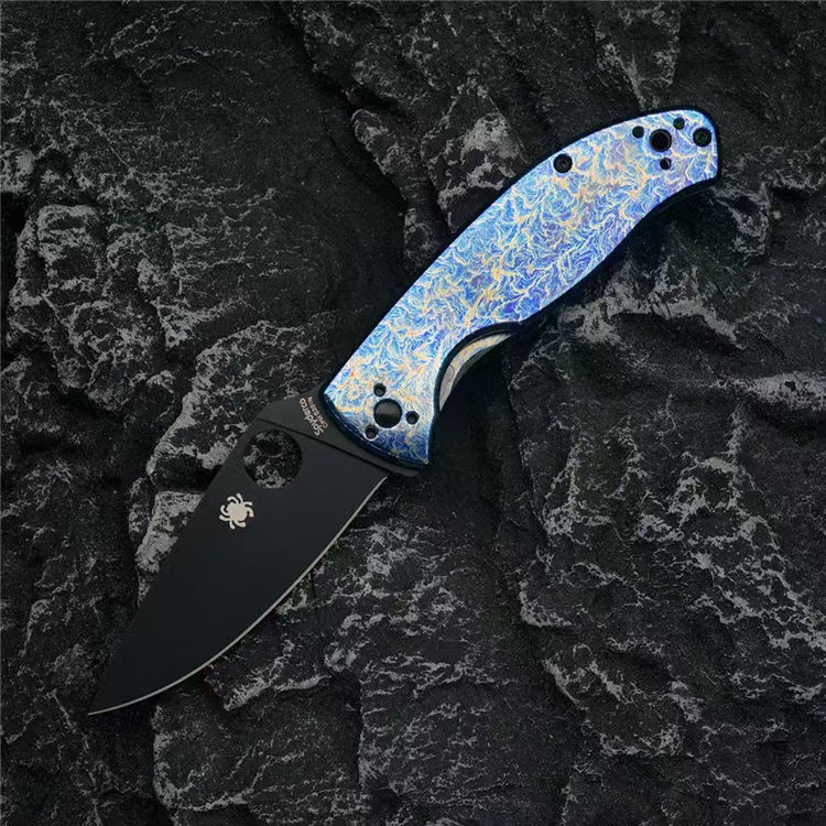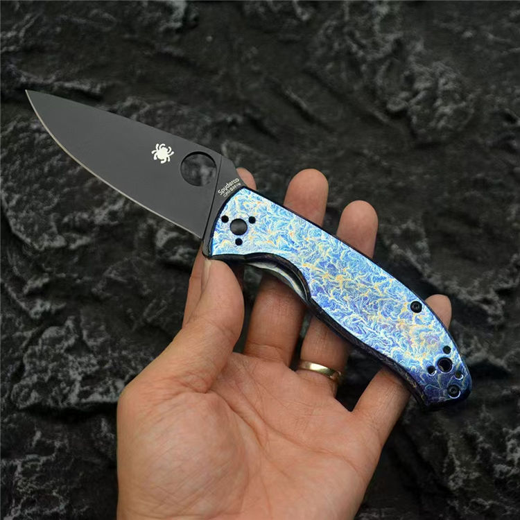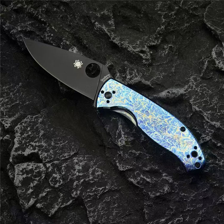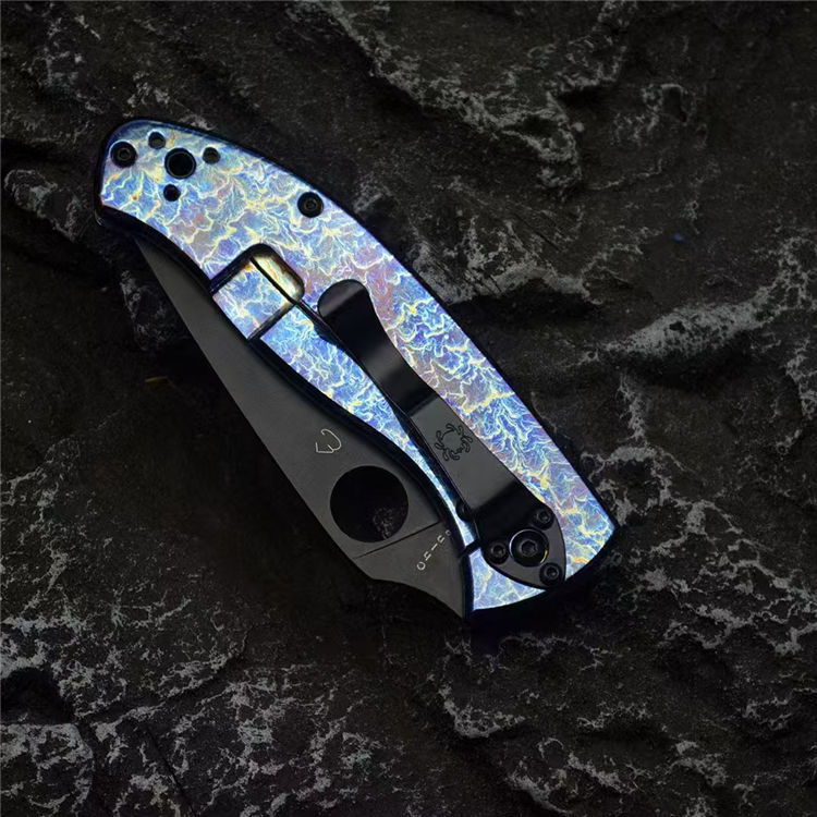 蜘蛛C122雷电纹折刀 总长:19.7cm 刃长:8.5cm 柄长:11.2cm 刃宽:3.3cm 刃厚:3mm 刃材:CPM S35V 柄材:钛合金 重量:118g(含包装) 硬度:59-60HRC 配置:彩盒,说明书 工艺:镀钛,CNC电脑啰数控制作