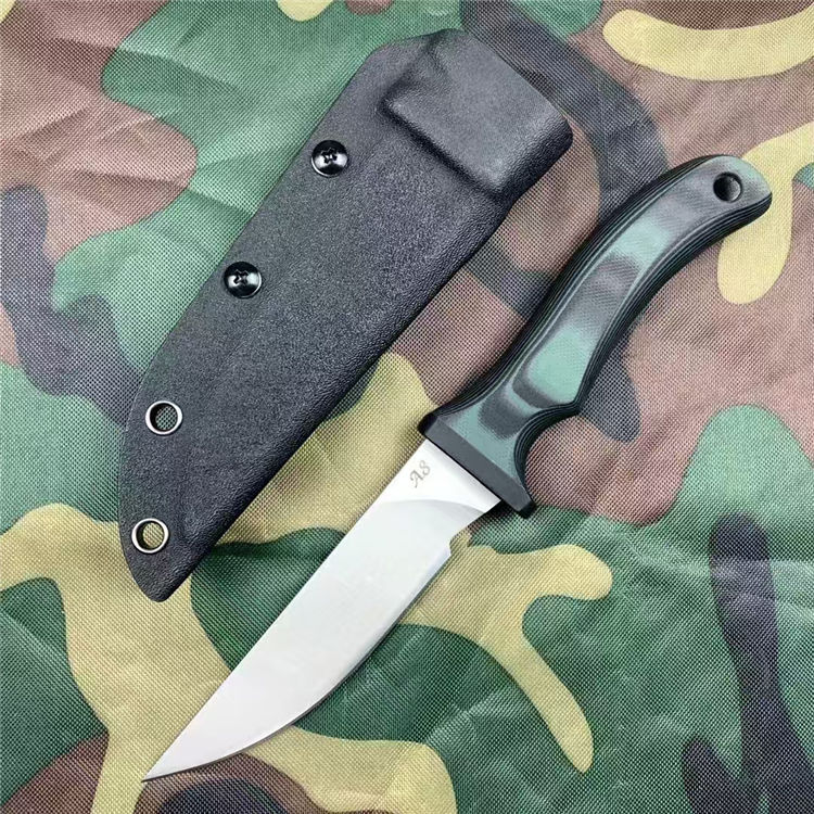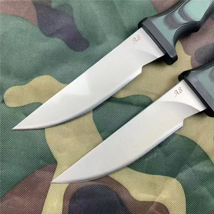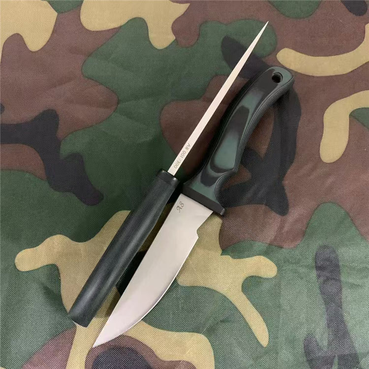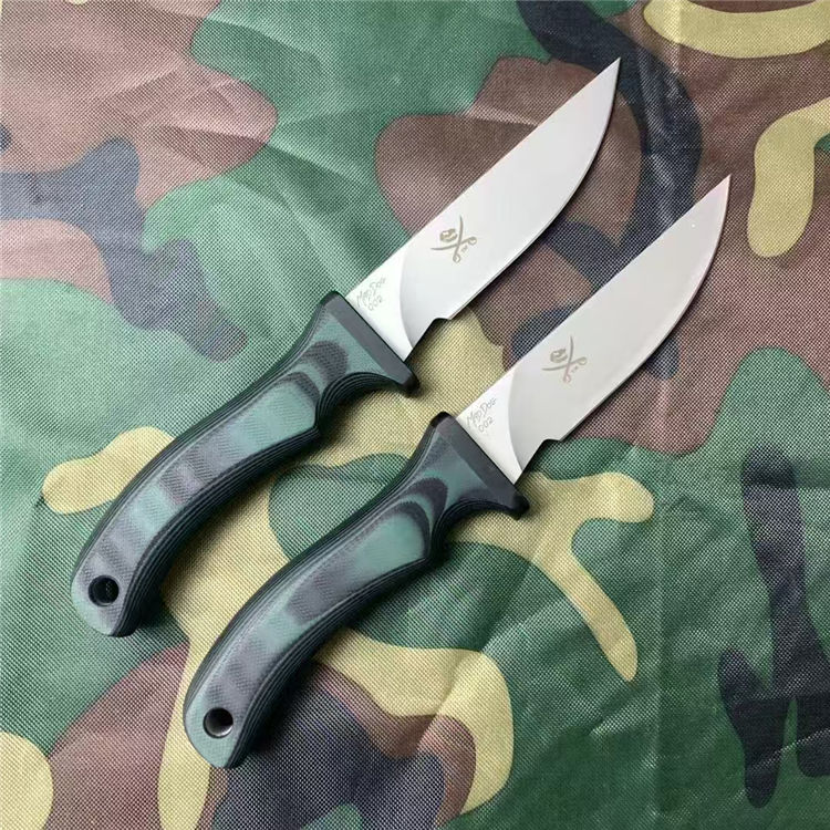 疯狗跳羚直刀 总长:22.7cm 刃长:9.6cm 刃厚:5mm 刃宽:2.6cm 钢材:进口A8合金模具钢 硬度:60-62HRC 重量:216g(含k鞘) 热处理:专业真空热处理油淬,3次低温回火 表面:银色石洗,耐刮花复古工艺 柄材:进口双色黑绿G10复合材质 工艺:一体龙骨钢材入柄内固定 刀套:进口K板 包装:黑色盒子包装