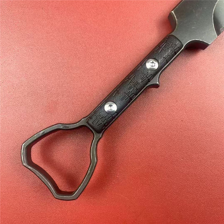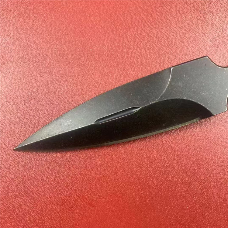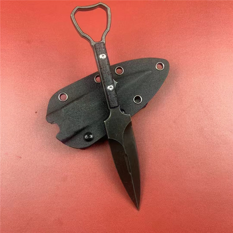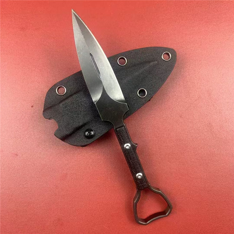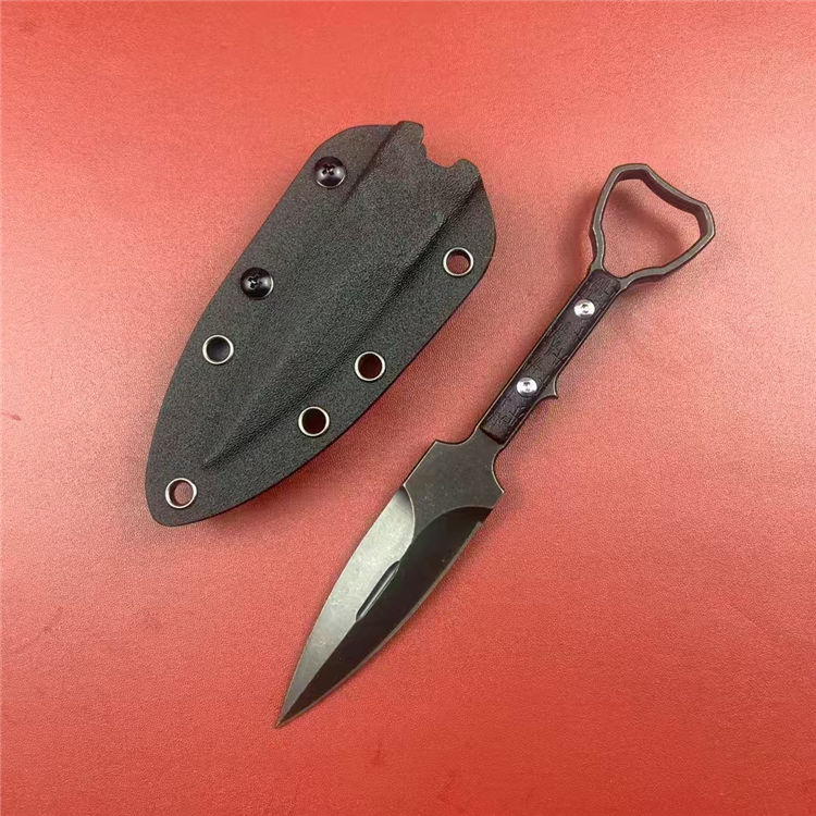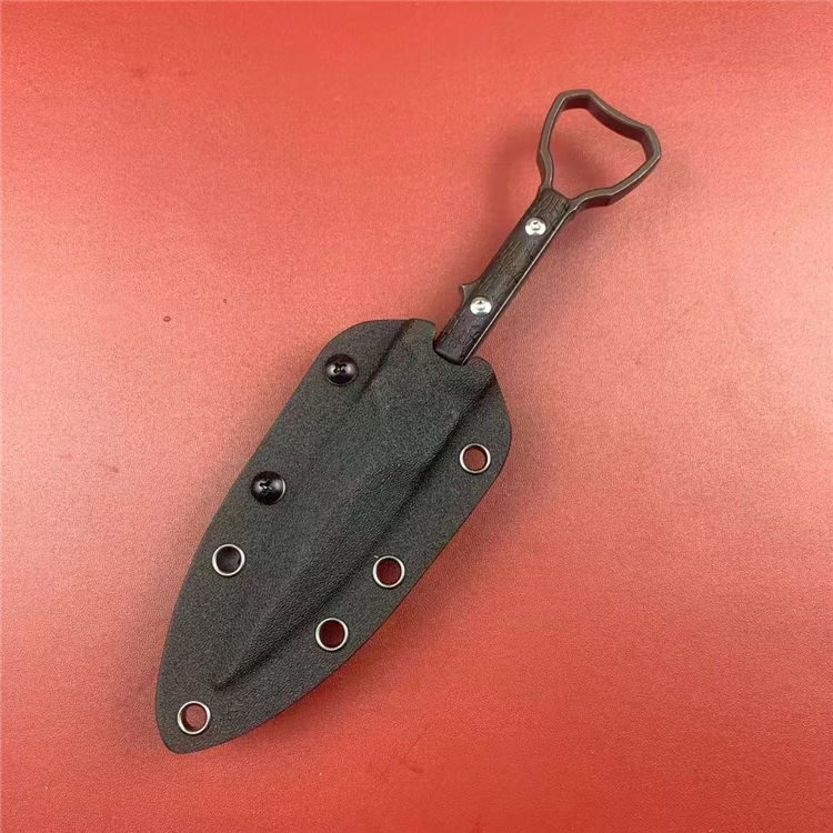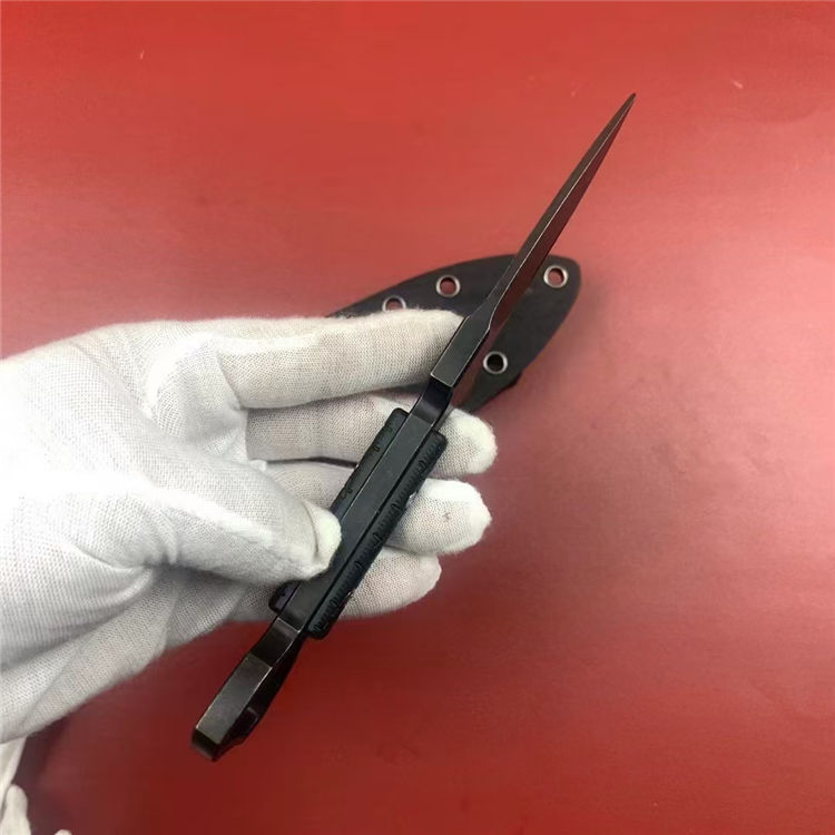 外贸版异型手刺 总长:19.7cm 刃长:9.6cm 刃宽:2.6cm 刃厚:7mm 刃材:DC53 柄材:G10 硬度:59-61HRC 重量:200g(含K鞘) 配置:K鞘 工艺:发黑石洗,CNC电脑锣精密加工制作