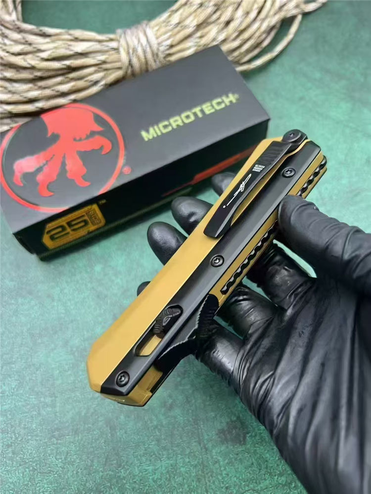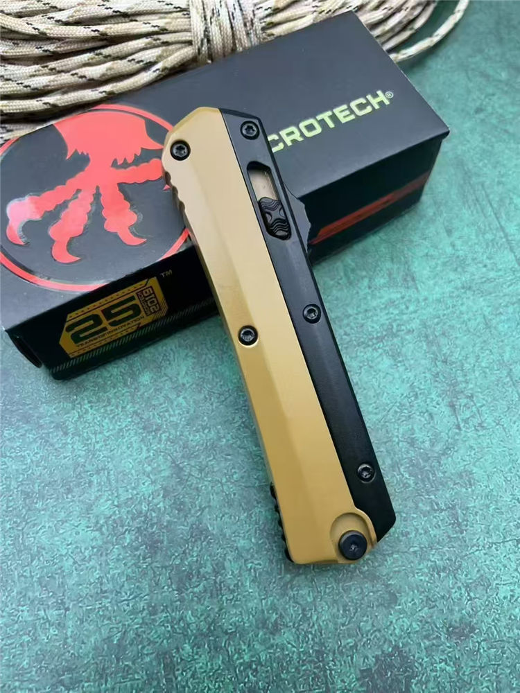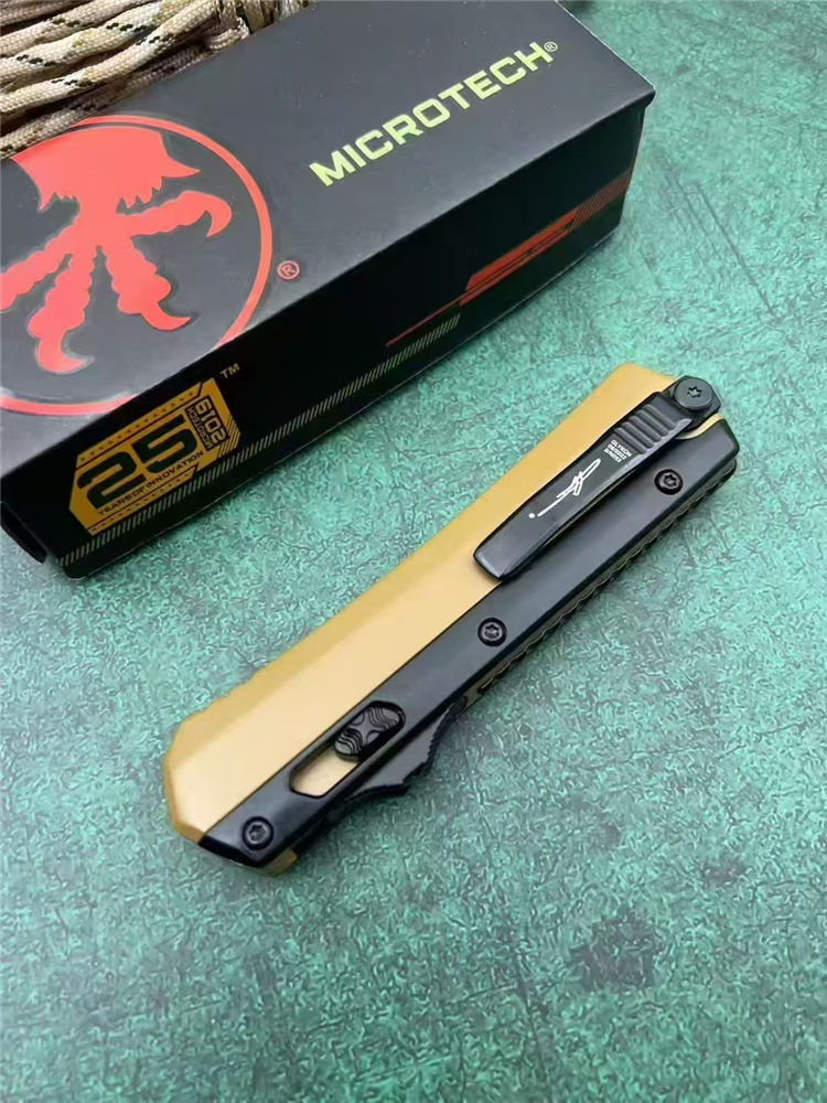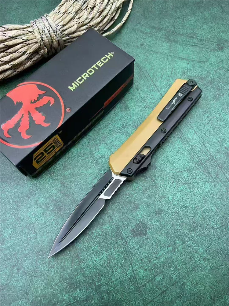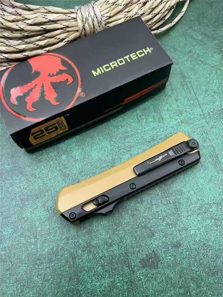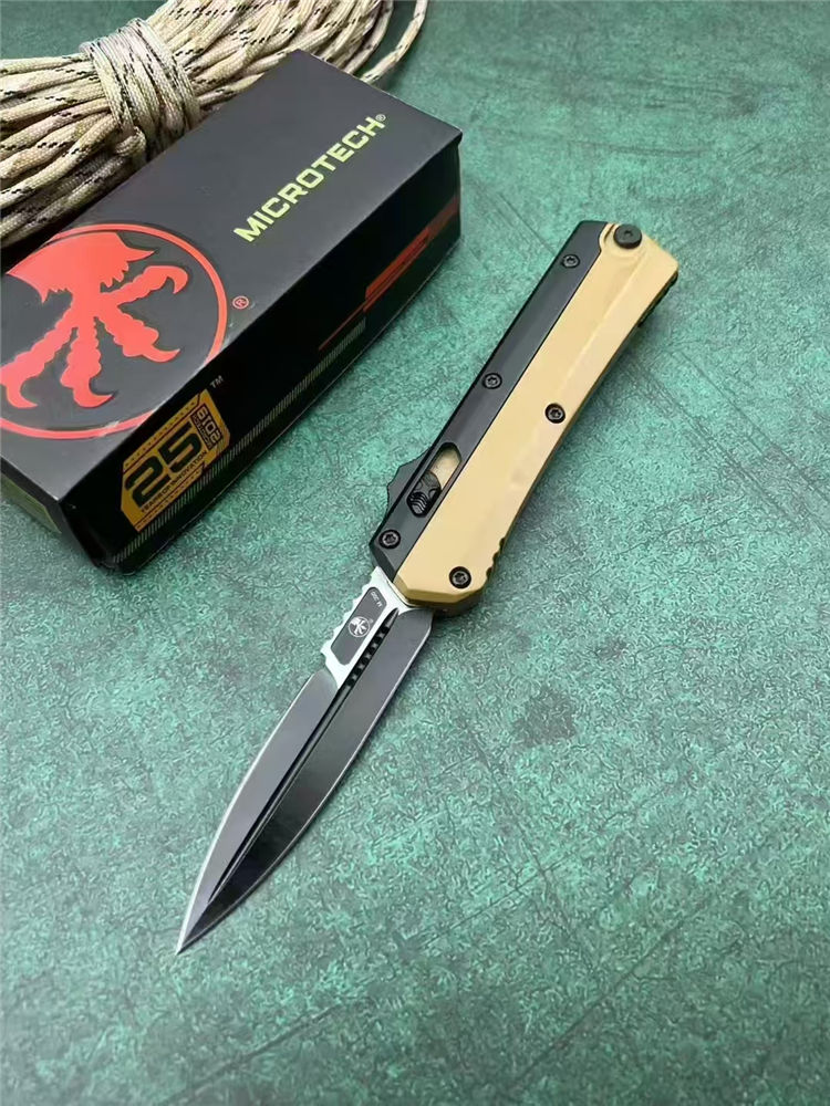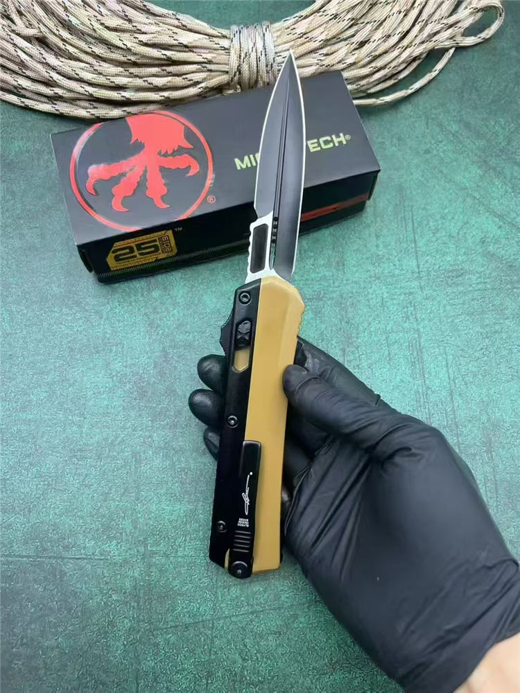 微技术定制版驼色蛇神直出跳刀 总长:22cm 刃长:9cm 柄长:13cm 刃厚:3mm 刃材:7Cr15Mov(标M390) 柄材:锌铝合金 表面:黑钛 硬度:58HRC 重量:269g(含包装) 包装:尼龙套+彩盒
