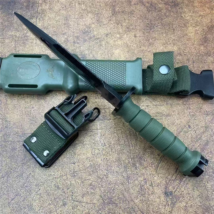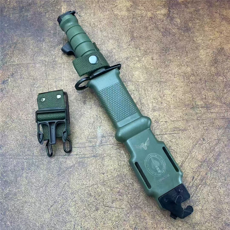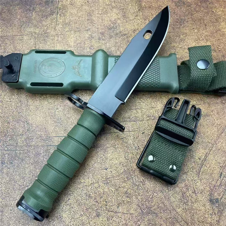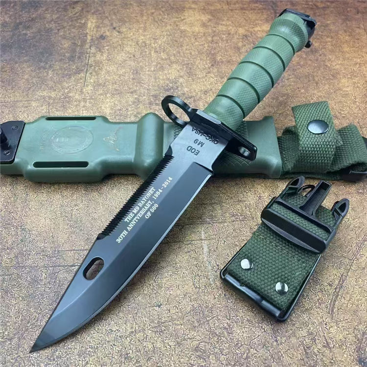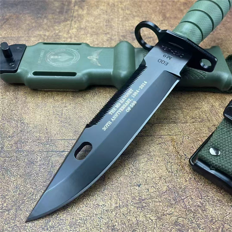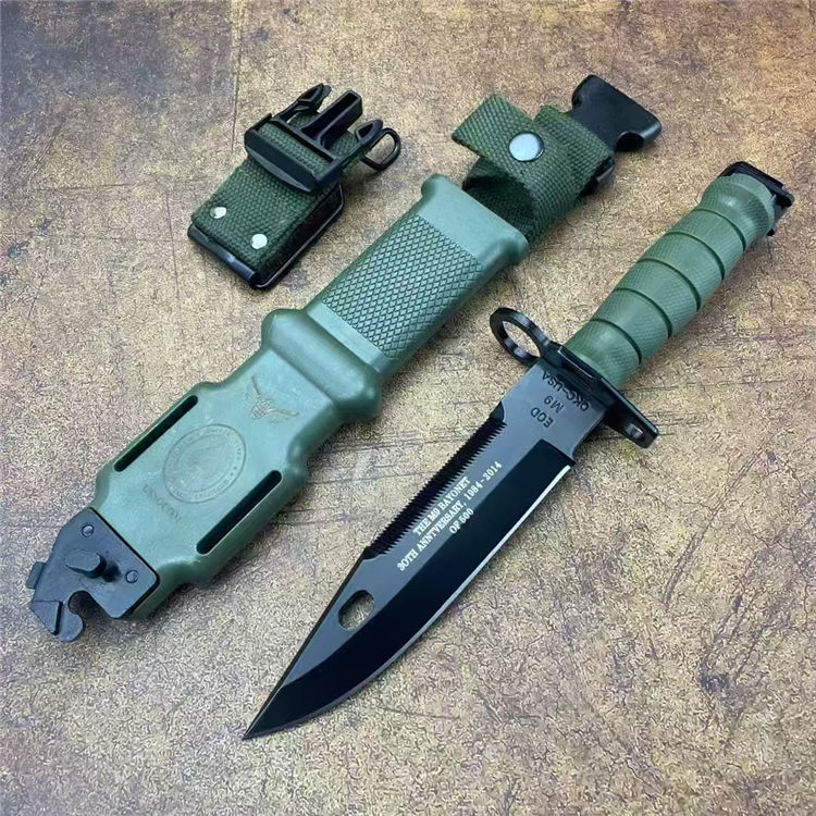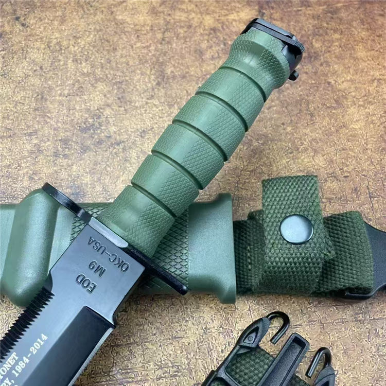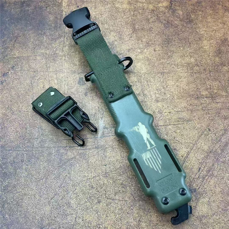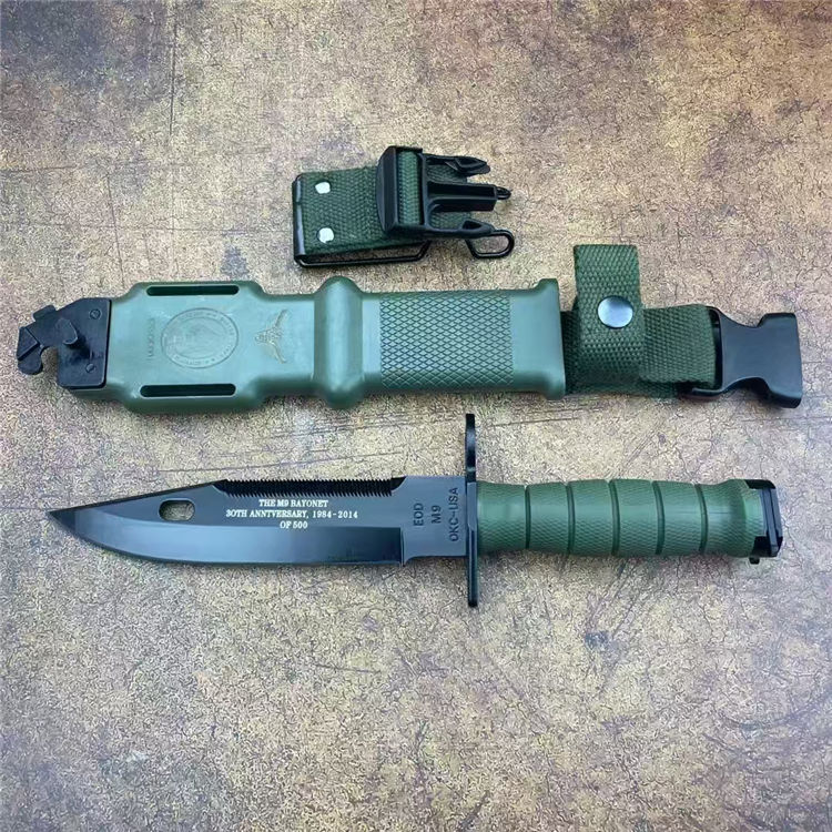 安大略30周年纪念版M9军刺 全长:310mm 刃材:440C 深冷热处理 表面镀黑钛处理 硬度:58-60HRC 刃厚:6.0mm 刃长:179mm 刃最宽处:37mm 柄长:129mm 柄材及处理:尼龙+玻璃纤维,黑绿两种颜色 总重量:约810g。 刀身重:约413g 刀鞘重:约397g 配战术刀鞘