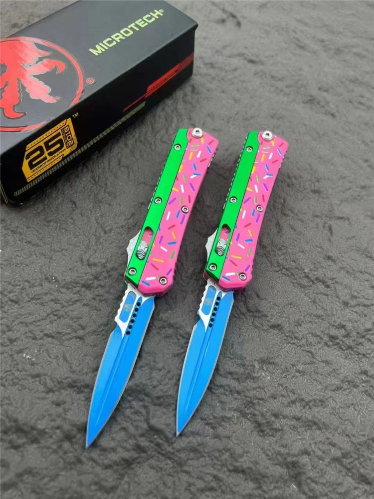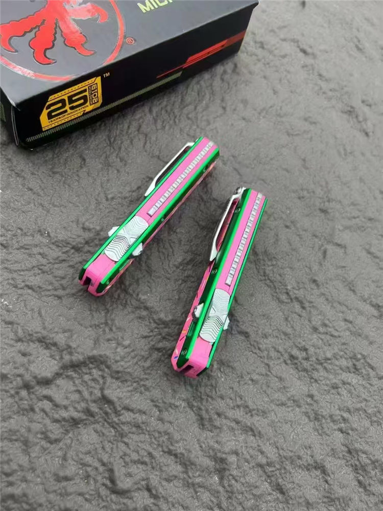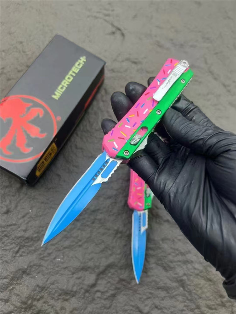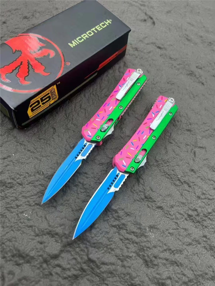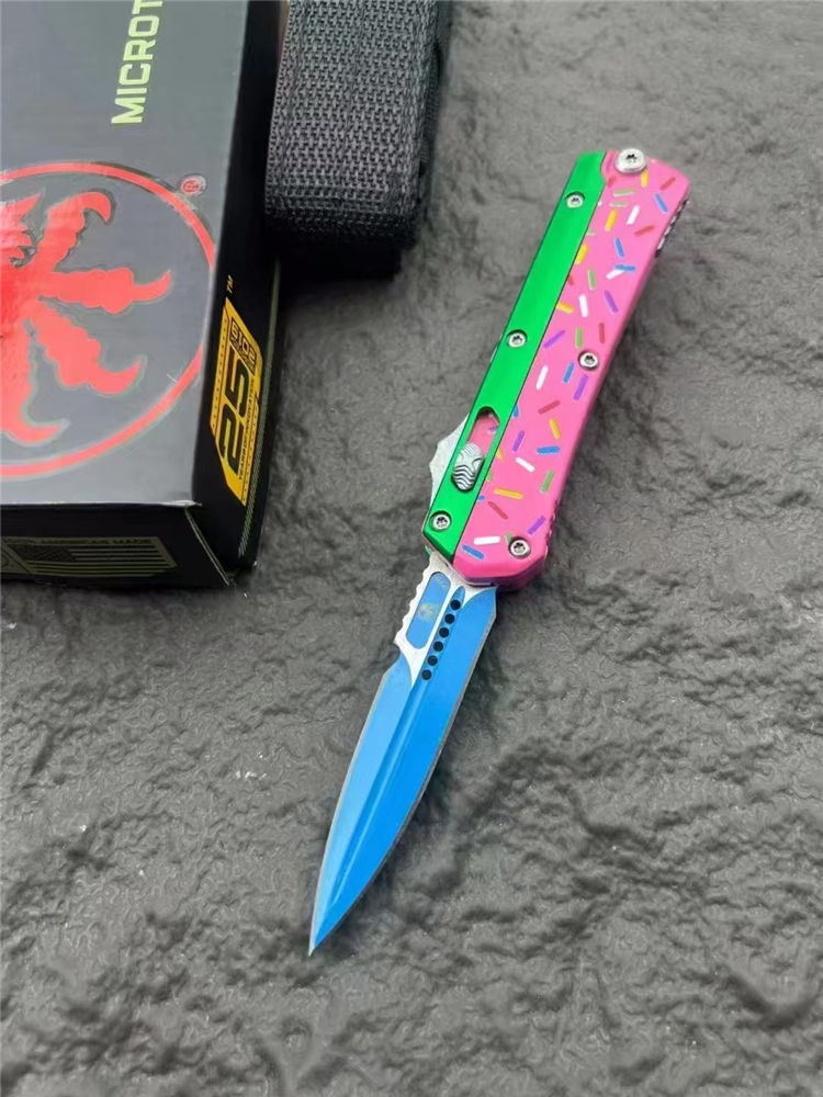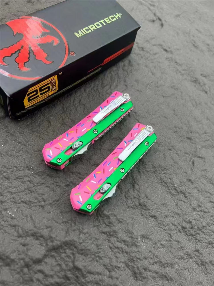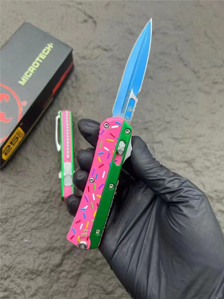 微技术甜甜圈版蛇神直出跳刀 总长:17cm 刃长:6.9cm 柄长:10cm 刃宽:1.7cm 刃材:D2 柄材:铝合金 硬度:59-60HRC 重量:126g(裸刀)