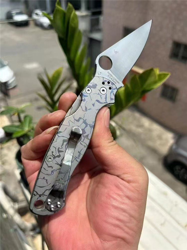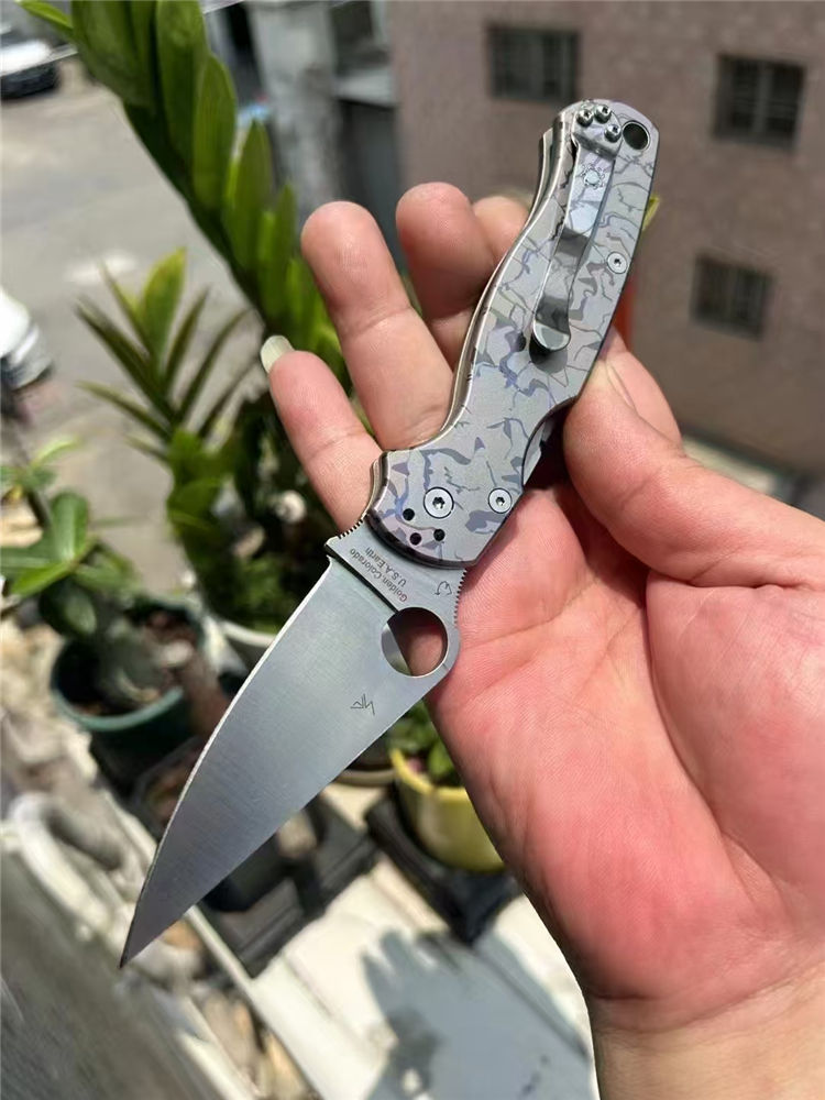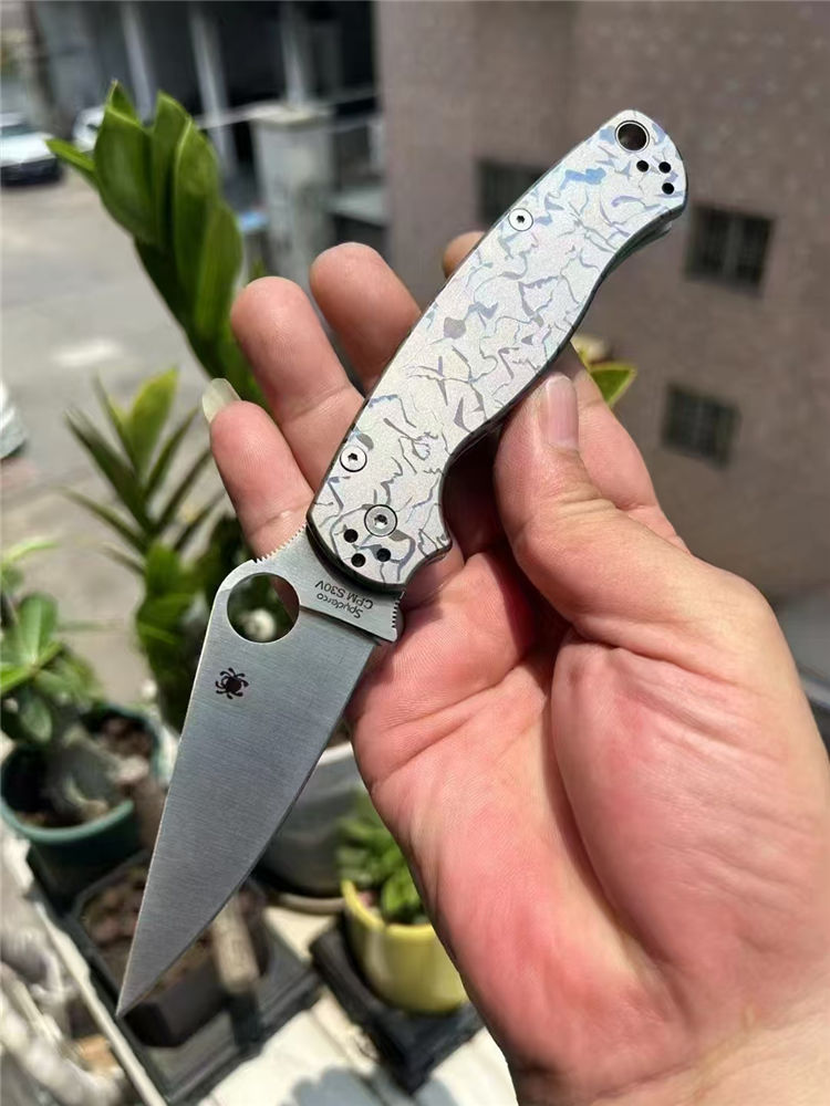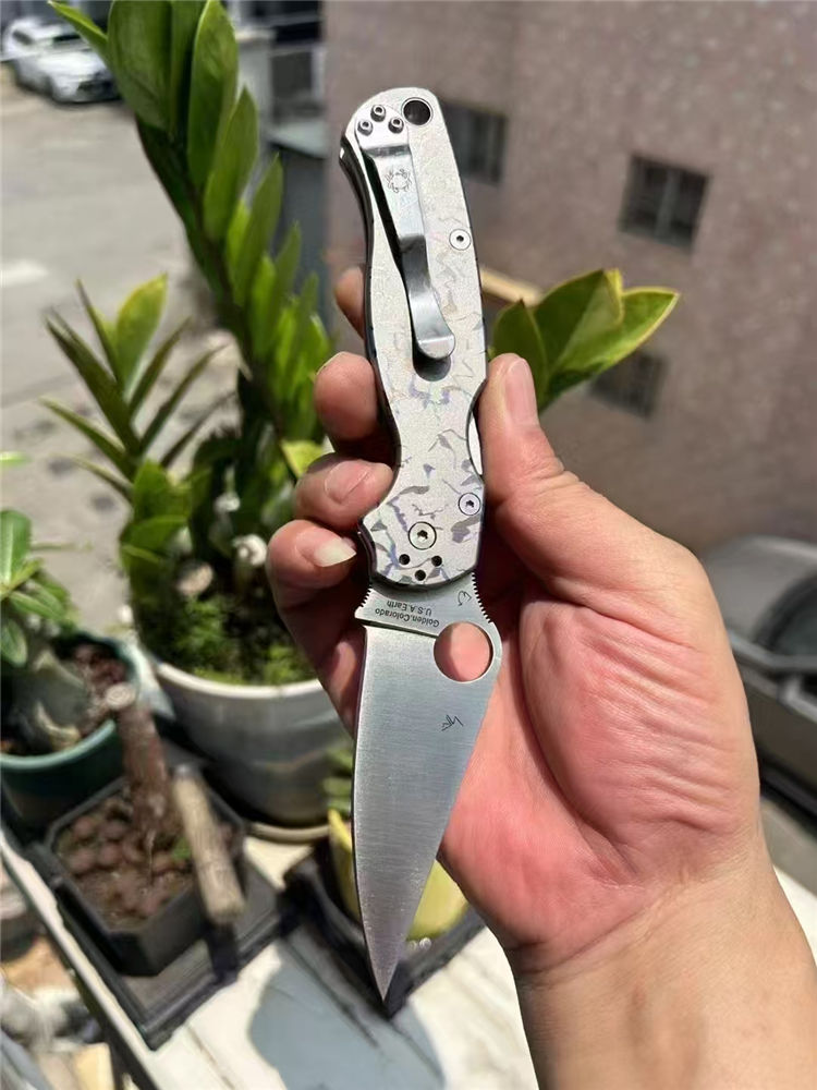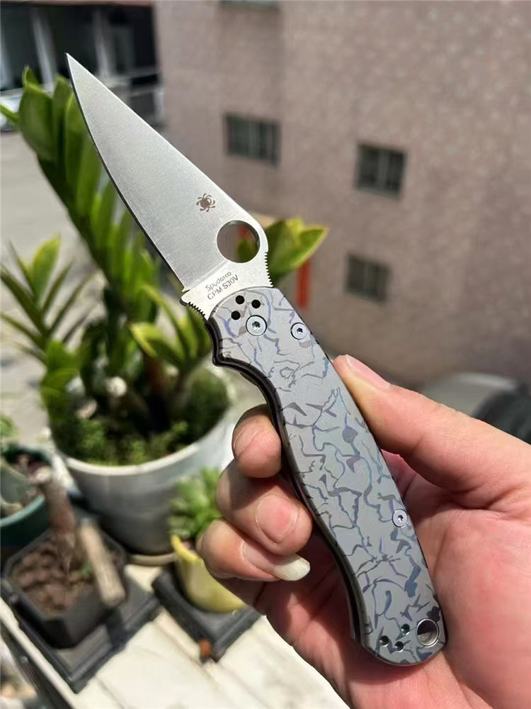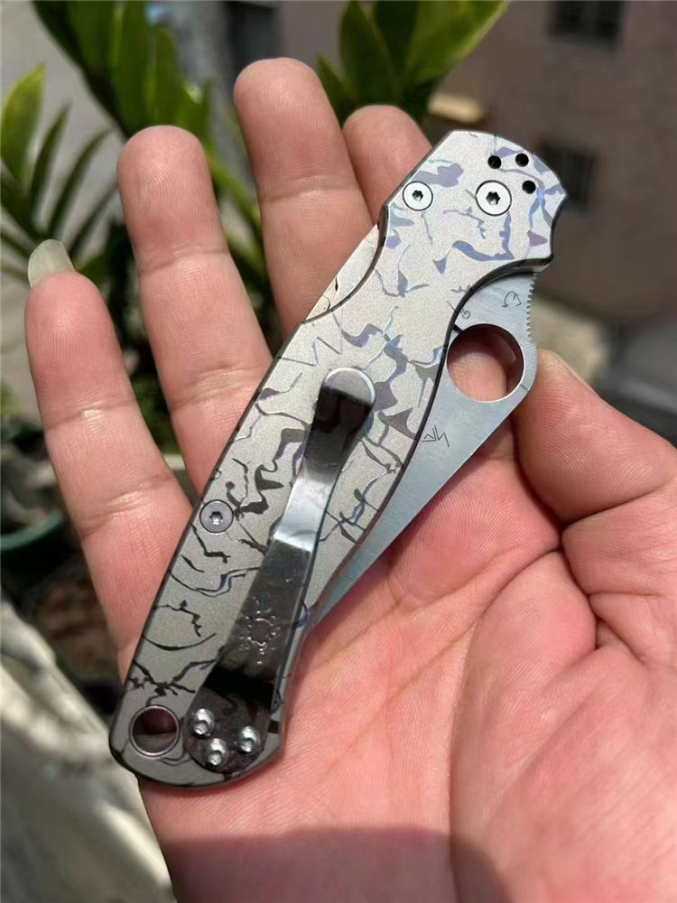 订制版蜘蛛C81折刀 总长:210mm 刃长:80mm 闭合:125mm 刃厚:3.2mm 材料:CPM-S30V 表面:缎面砂光 系统:轴承系统 柄材:TC4钛,420钢背夹子 硬度:58-60HRC 刀重:135g(钛合金手柄减重) 包装:蜘蛛彩盒