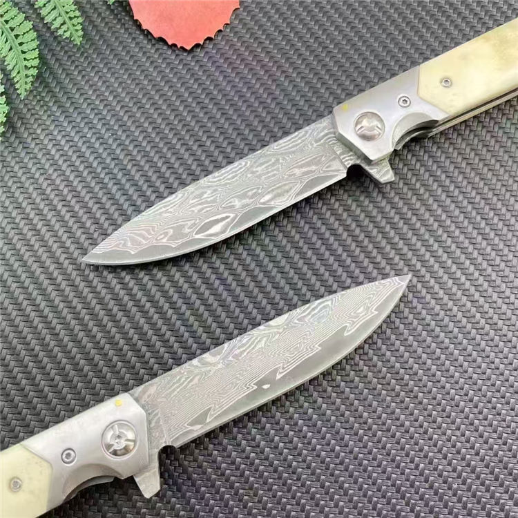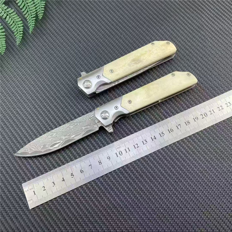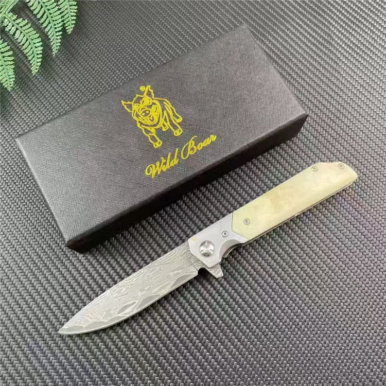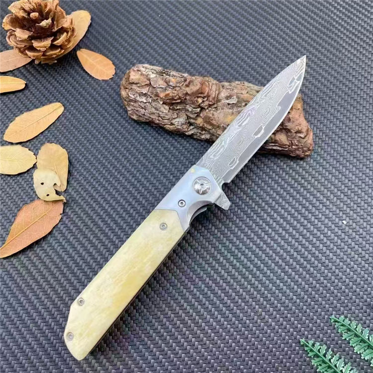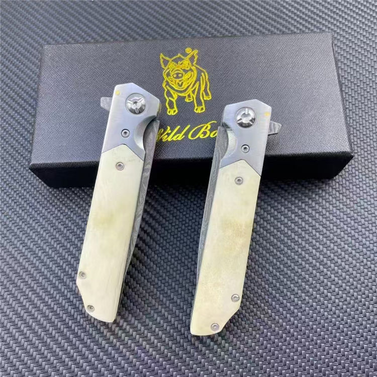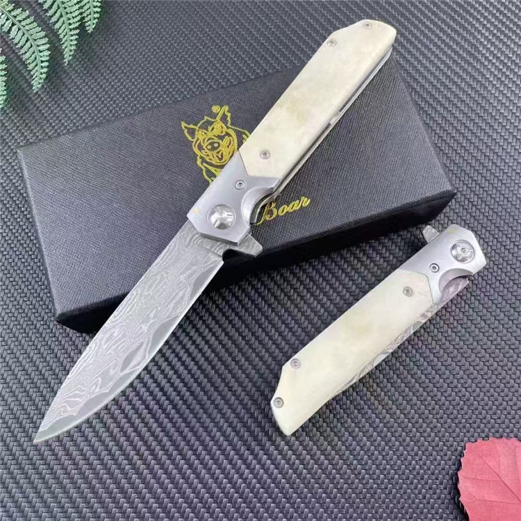 大马士革山猪牛骨折刀 全长:20.3cm 刃长:9cm 柄长:11.3cm 刃宽:2.2cm 刃厚:2.8mm 刃材:大马士革 刀重:137G 毛量:210G 硬度:58-60HRC 柄材:牛骨+钢头 包装:布袋+盒子