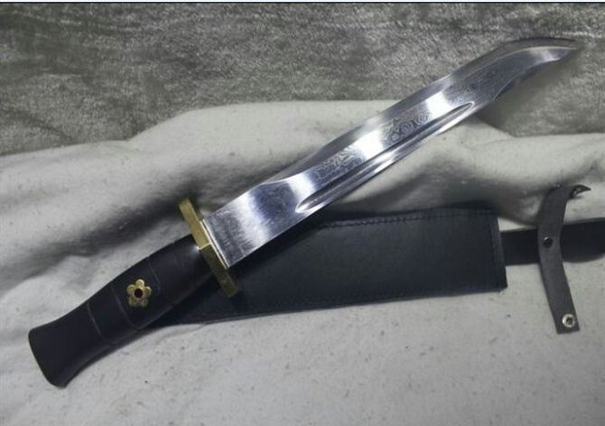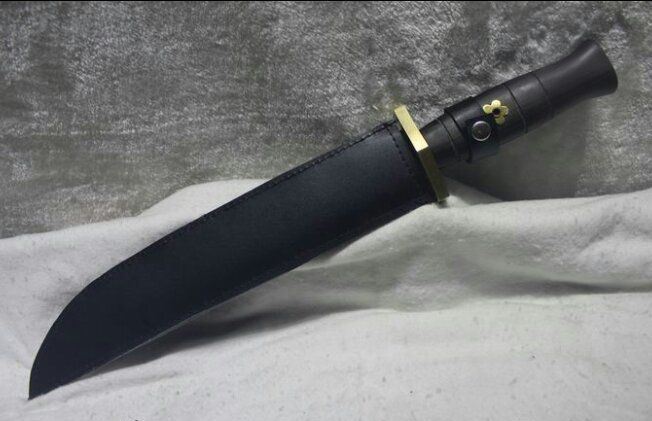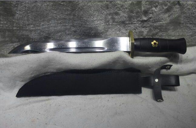 TL010百炼花纹钢猎刀 全长:45 cm 刃长:27 cm 柄长:15 cm 刃宽:3.5 cm 刃材:百炼花纹钢研磨 装材:铜配件,黑檀手柄 硬度区间:60HRC 性能:全开锋,削纸断竹砍铁 备注:手工产品存在误差,规格仅供参考,请以实物为准!