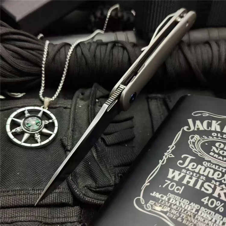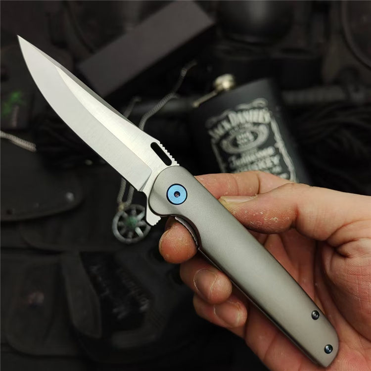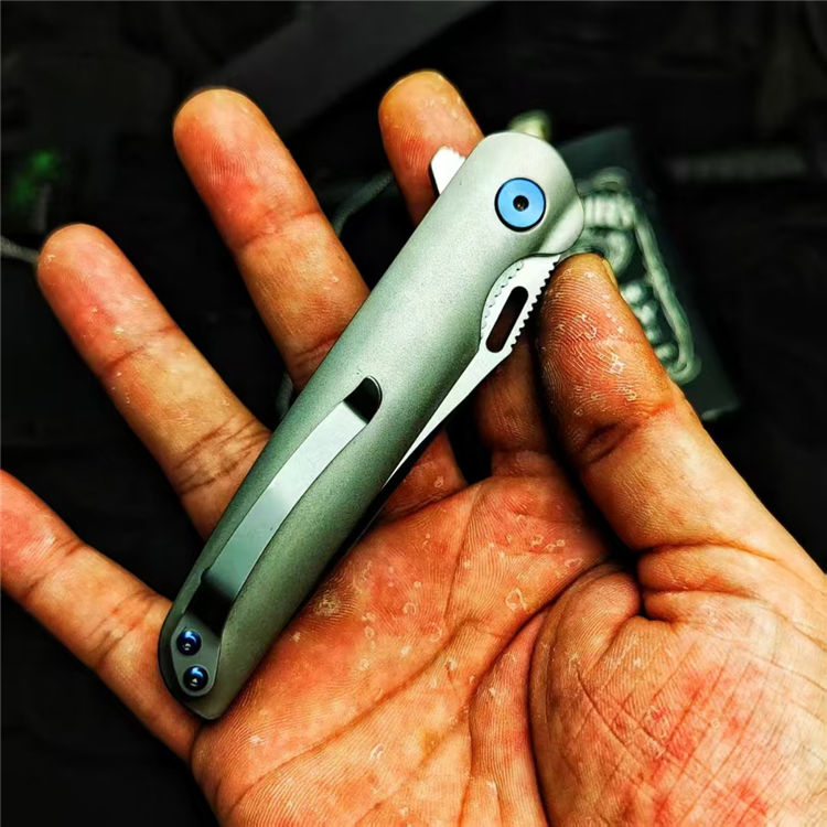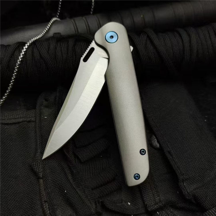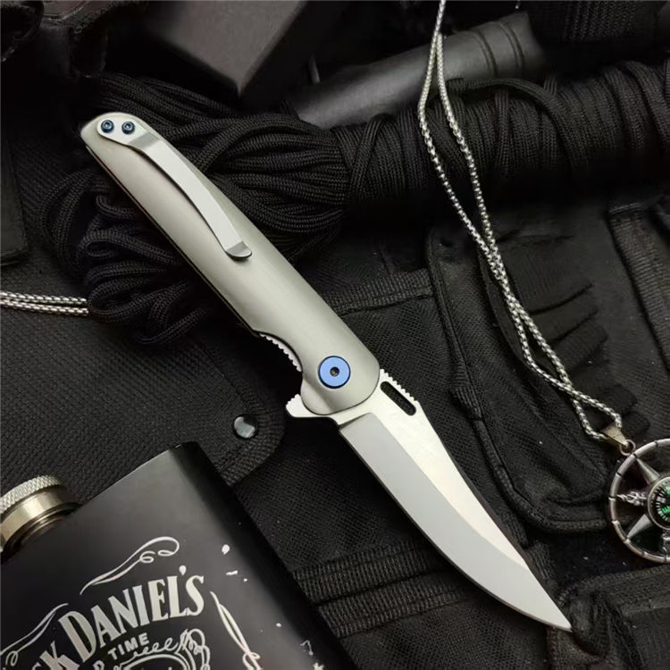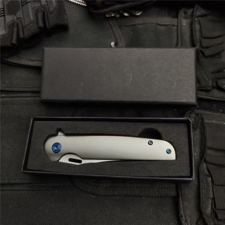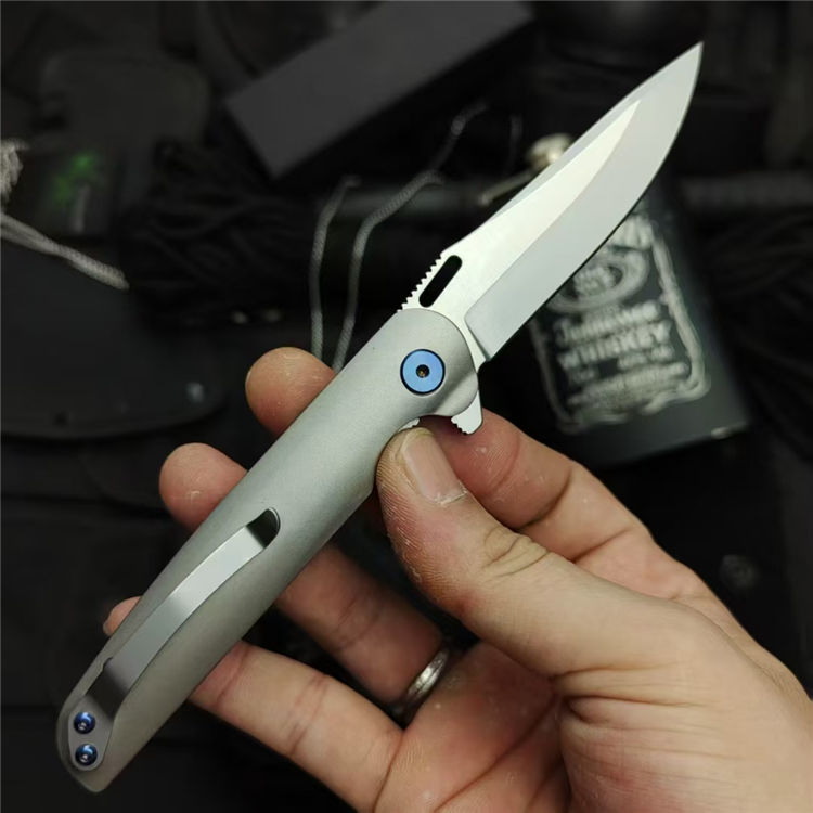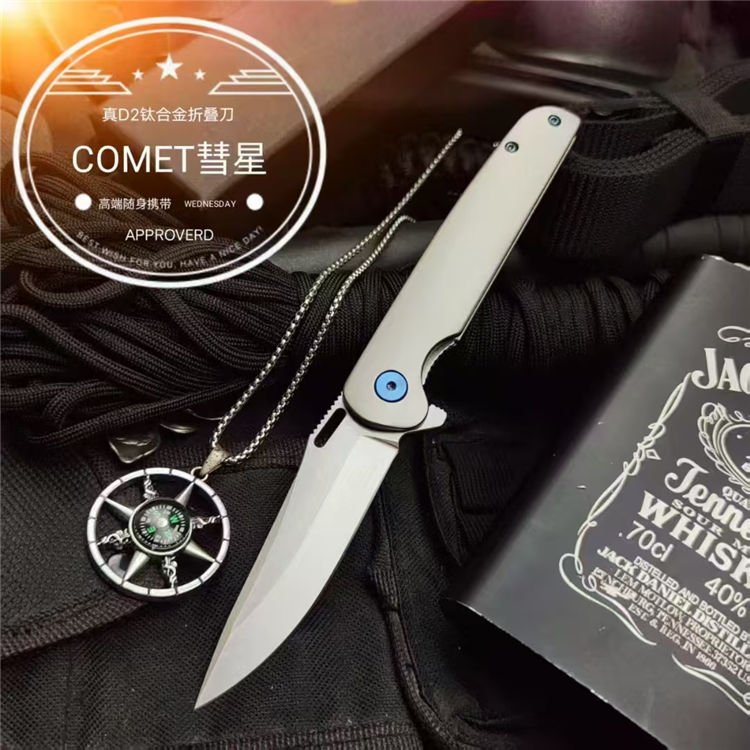 彗星口袋折刀 全长:195mm 刃长:80mm 柄长:110mm 刃材:D2 刃厚:3.5mm 表面:精细砂光/数控拉丝 柄材:TC4钛合金 硬度:59-60HRC 净重:108g 毛重:500g(含包装) 包装:黑色EVA礼品盒
