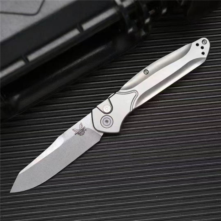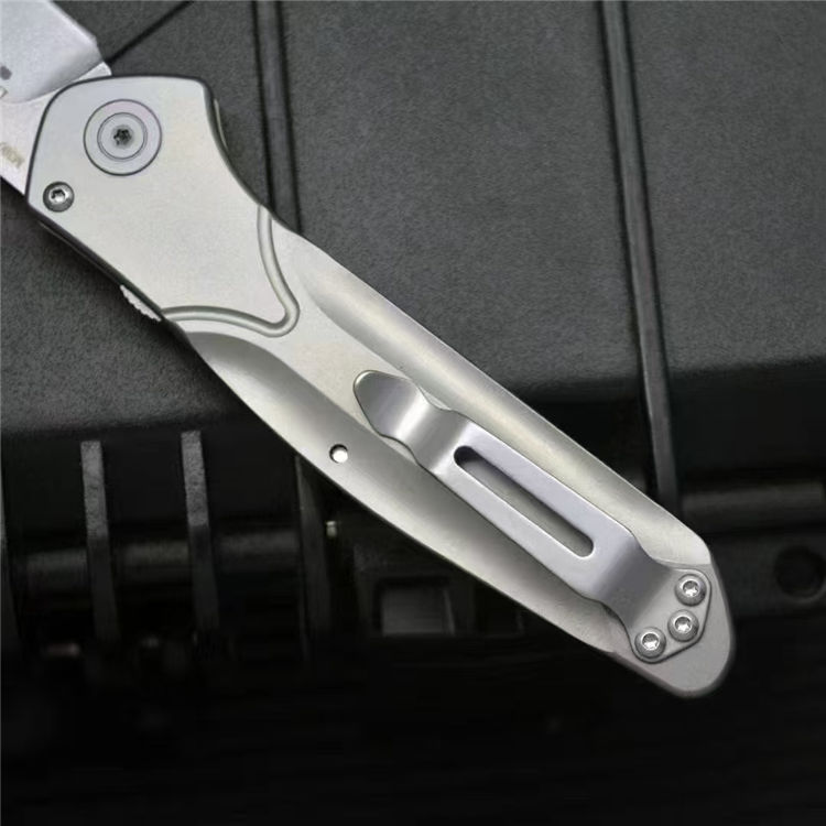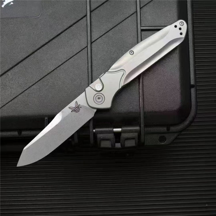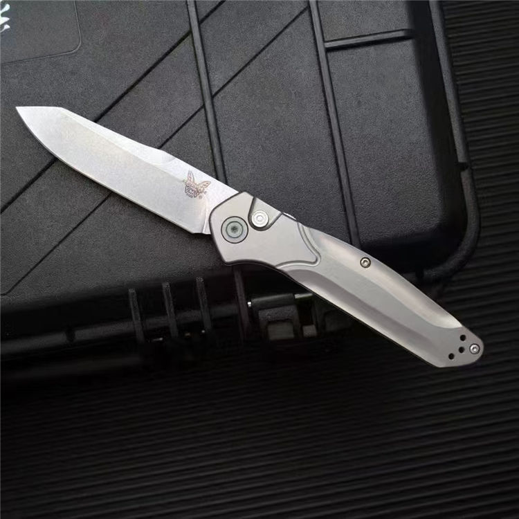 蝴蝶BM9400钛合金侧开跳刀 全长:198mm 刃长:83mm 闭合:115mm 钢材:m390钢 刃厚:3mm 表面:石洗 硬度:60HRC 重量:108g 柄材:TC4钛合金经CNC电脑锣成型,极度精密 包装:原装黑彩盒,说明书,绒布袋