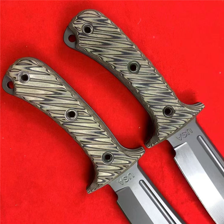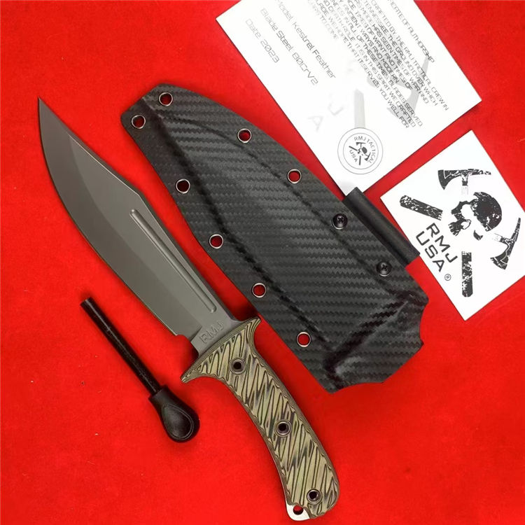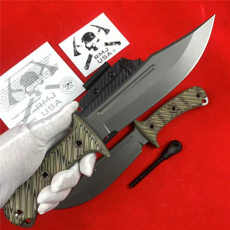 RMJ中型博伊直刀 总长:31cm 刃长:18.1cm 柄长:12.7cm 刃宽:4.5cm 刃厚:5mm 刃材:USA-10钢 柄材:双色G10 硬度:59-61HRC 重量:445g(裸刀)603g(含K鞘) 工艺:镀钛,CNC电脑锣精密加工制作 配置:碳纤纹K鞘,美棒打火石,证书