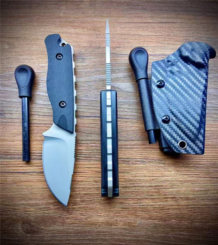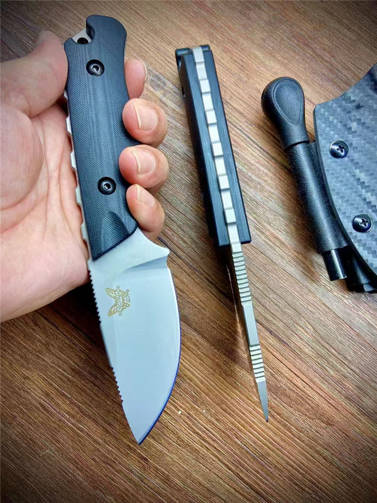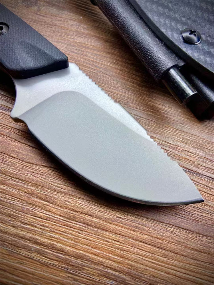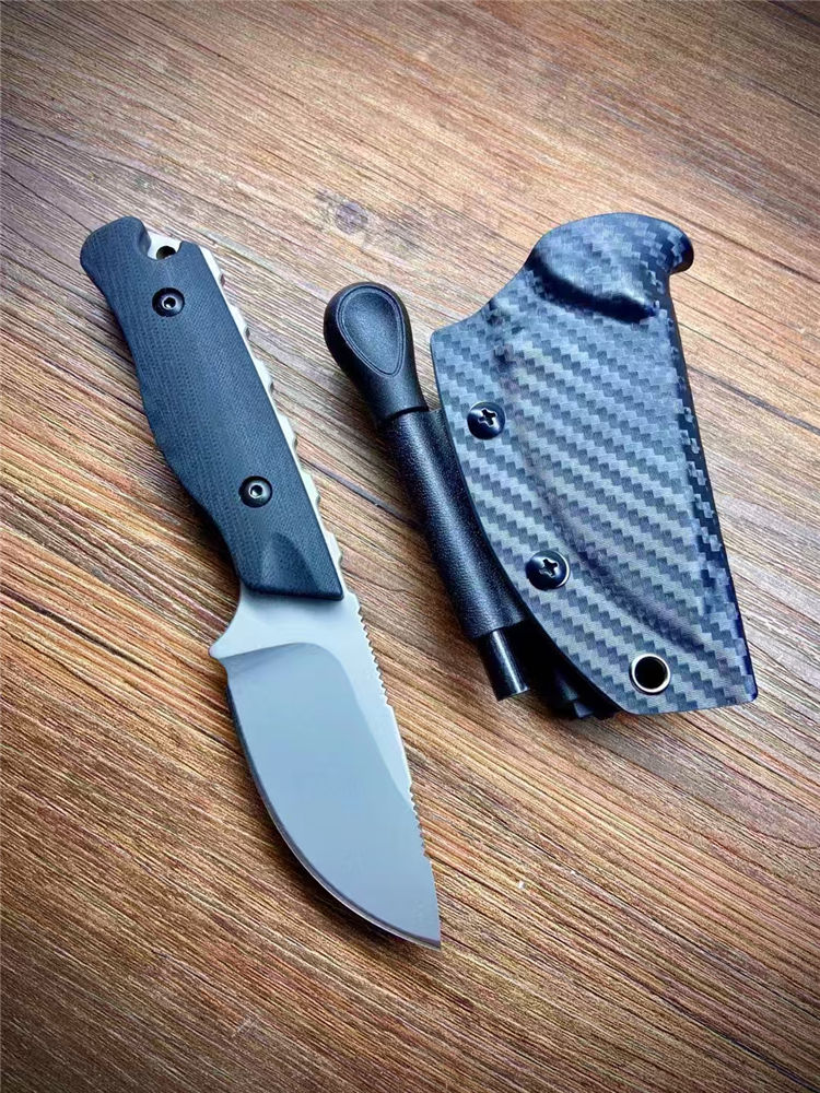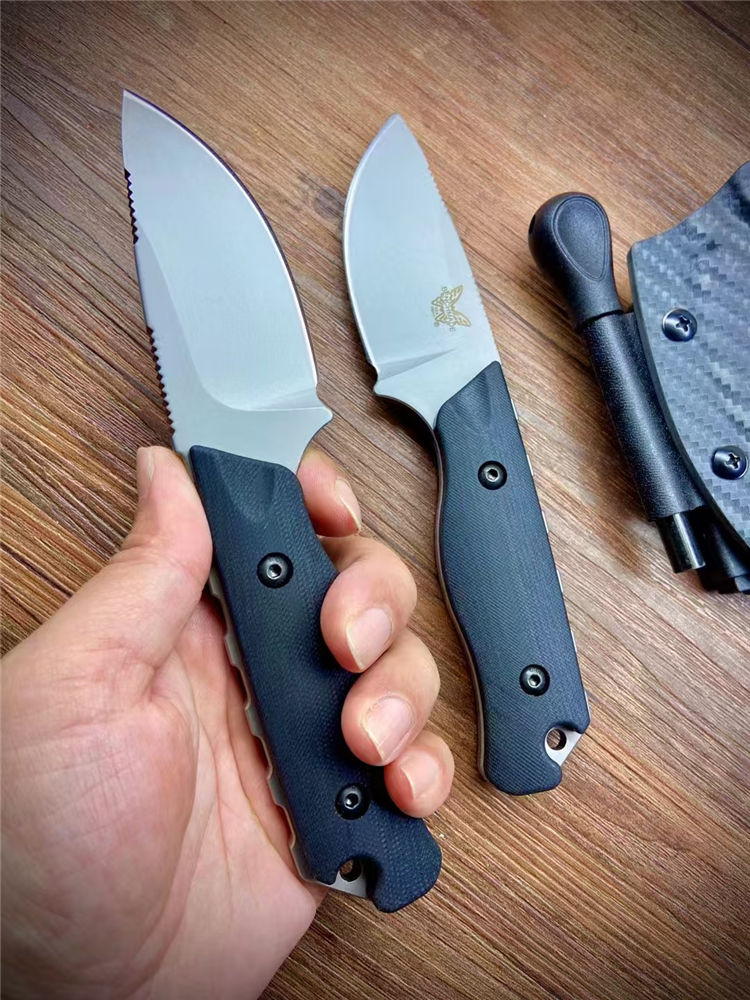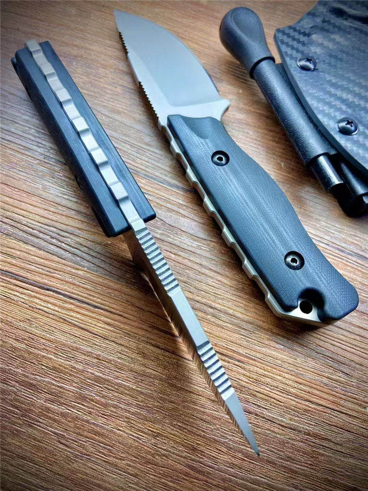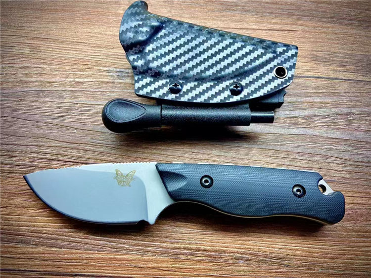蝴蝶05017直刀 全长:190mm 刃长:85mm 柄长:105mm 材质:DC53钢材 柄材:黑色G10手柄+钢钉 热处理:真空热处理 刀鞘:碳纤维K鞘 净重:223.5克
