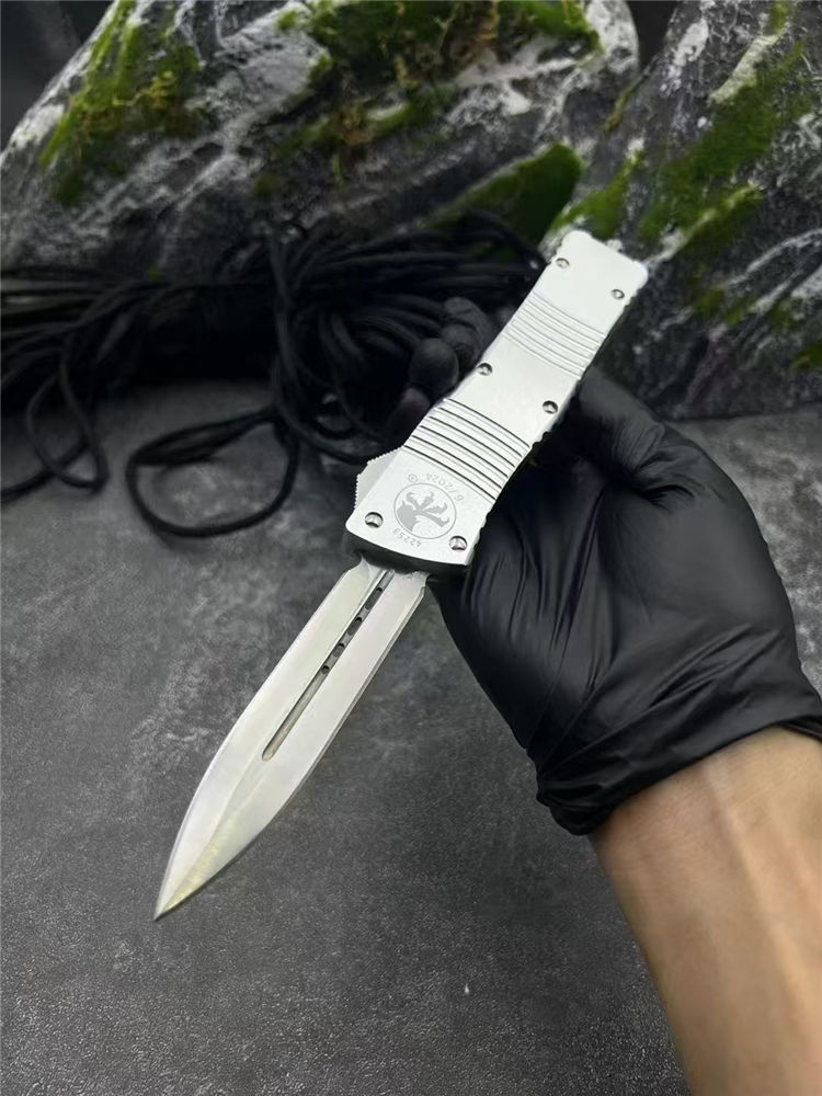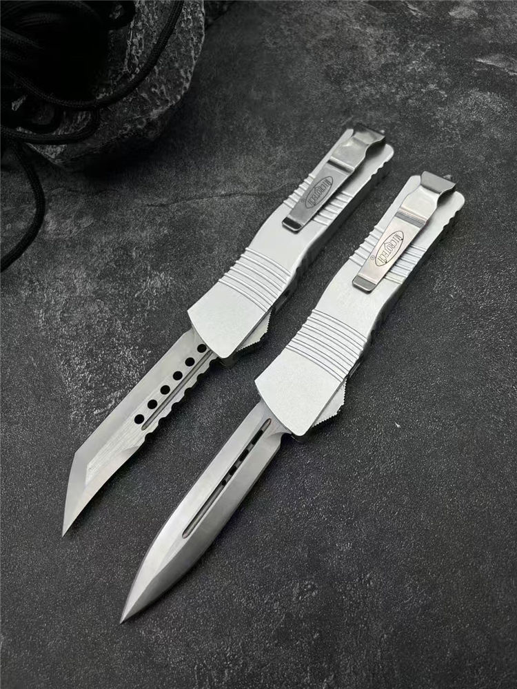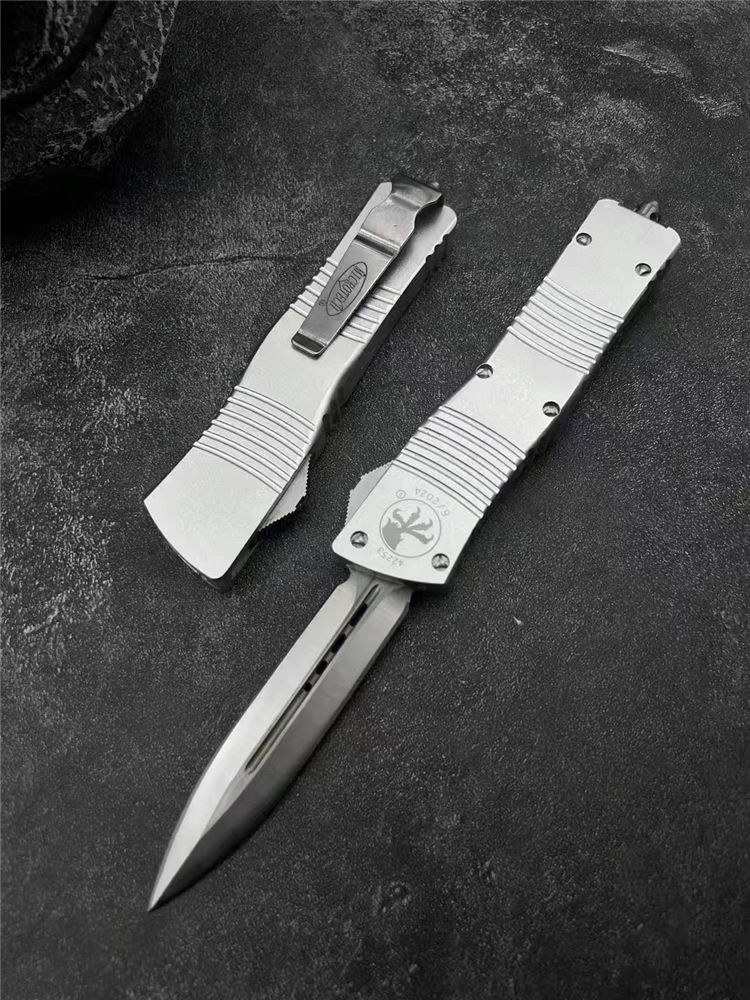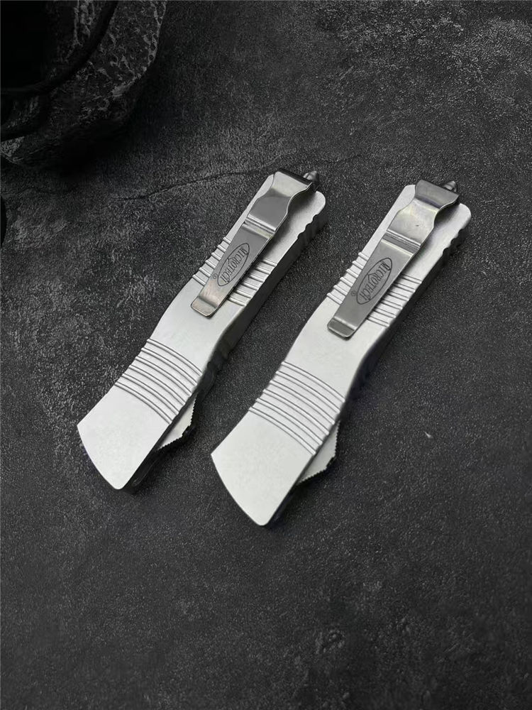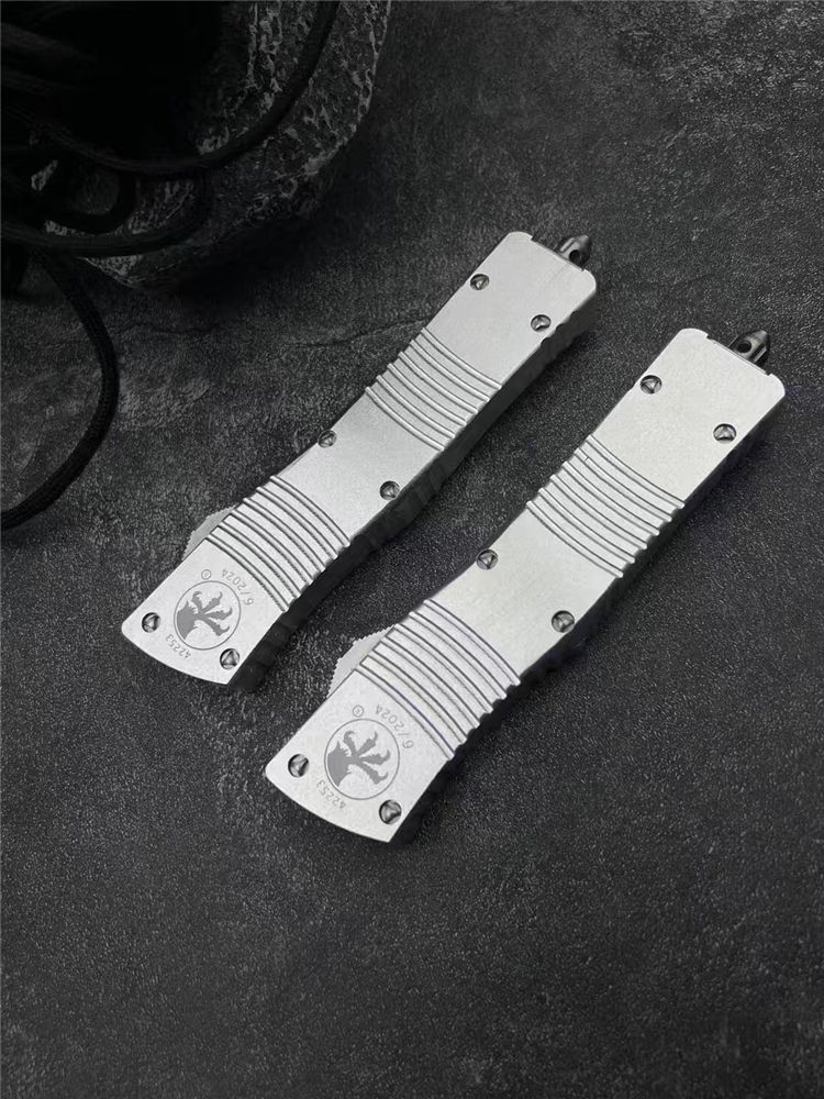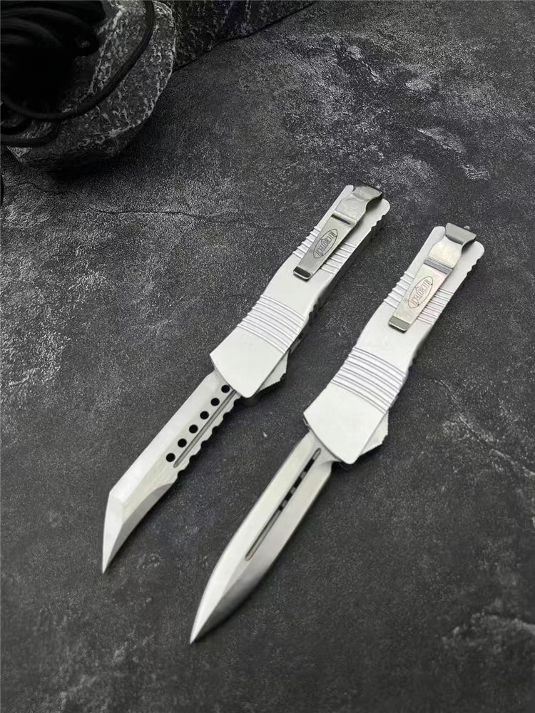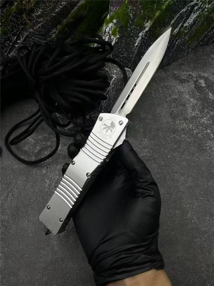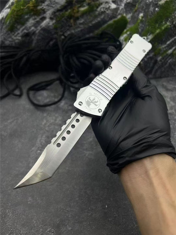 微技术大龙白龙马直出跳刀 总长:24.5cm 刃长:8.3cm 柄长:14.5cm 刃厚:2mm 材质:D2工具钢 柄材:铝合金 表面:拉丝 硬度:58HRC 重量:119裸刀,187含盒子尼龙套 包装:尼龙套+彩盒