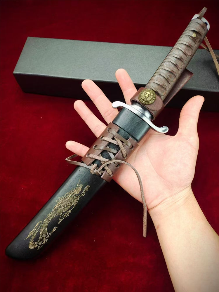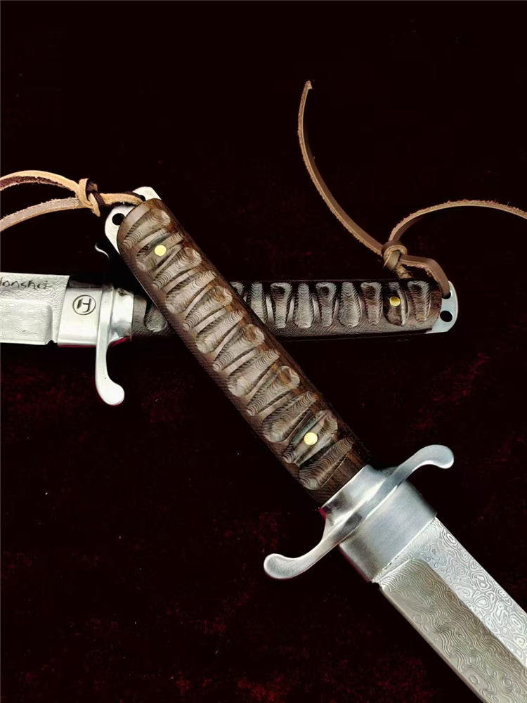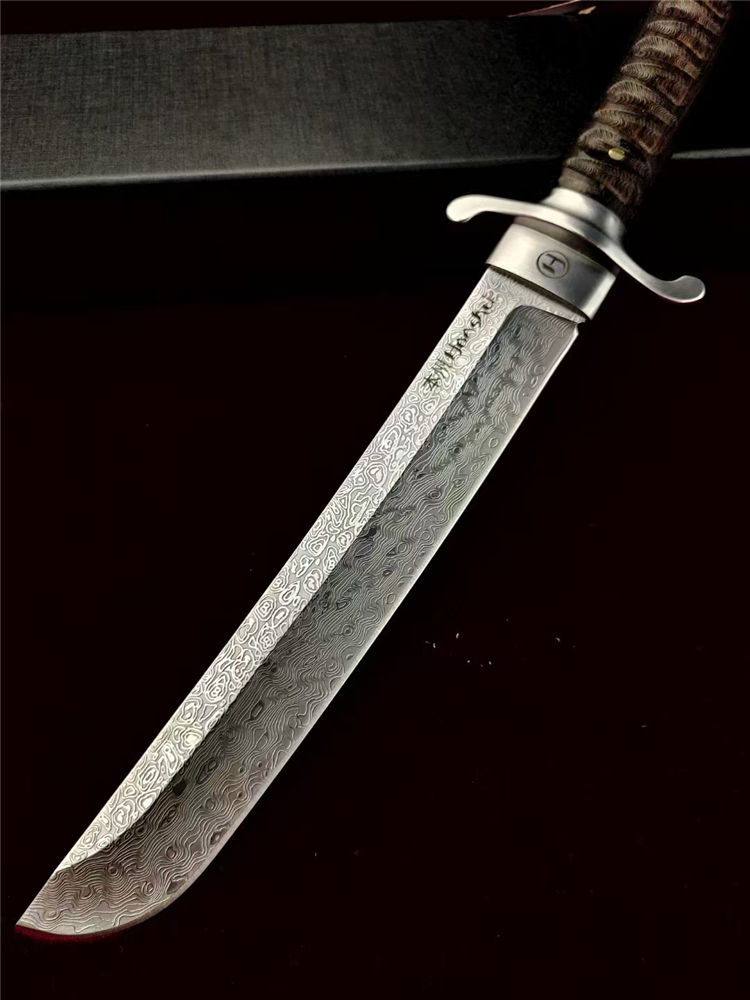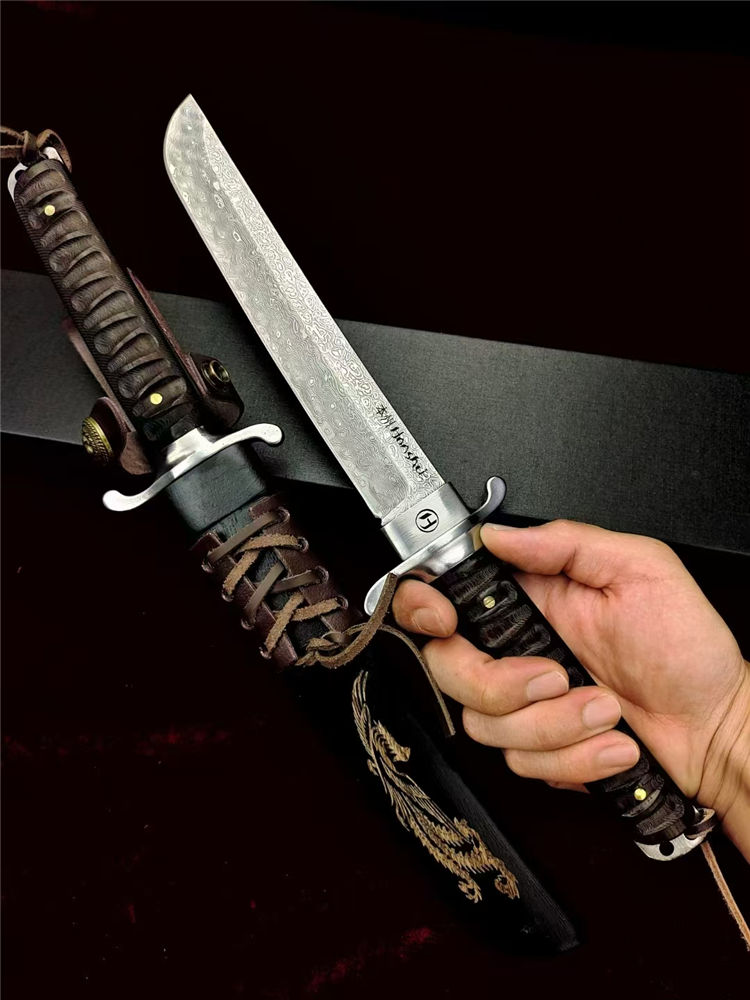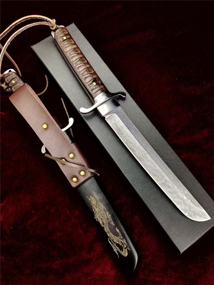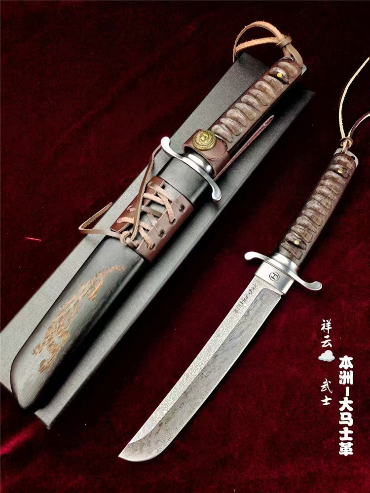大马士革本州祥云武士直刀 全长:360mm 刃长:200mm 柄长:145m 刃宽:30mm最宽处 刃厚:5.2mm 刃材:进口瑞粉祥云大马士革钢 刀重:460g 硬度:60-62HRC 表面:镜光大平面磨,原钢材雪花纹 柄材:印属进口黑檀木材料 结构:一体龙骨贯穿 配套:印尼进口黑檀木,手工CNC电脑雕刻龙凤图腾木鞘 包装:高端黑礼盒