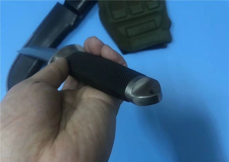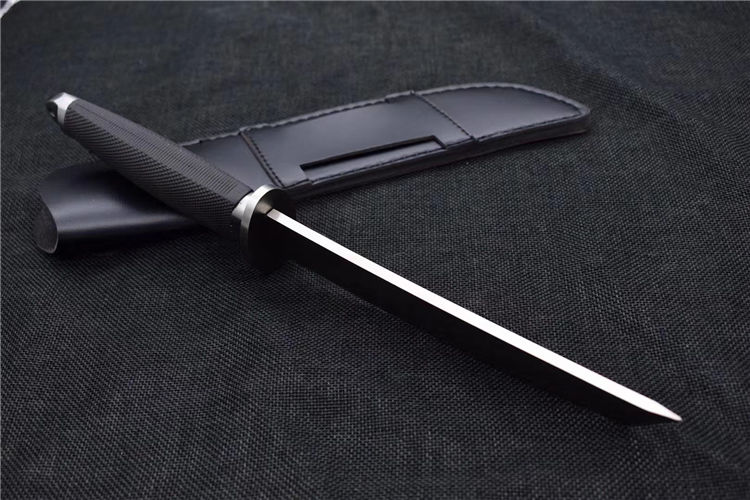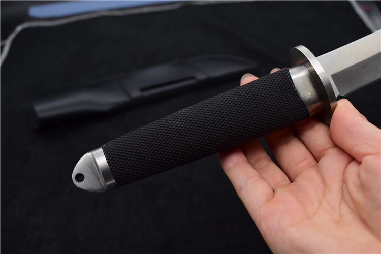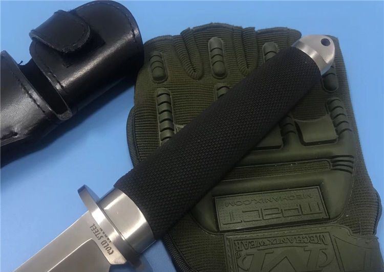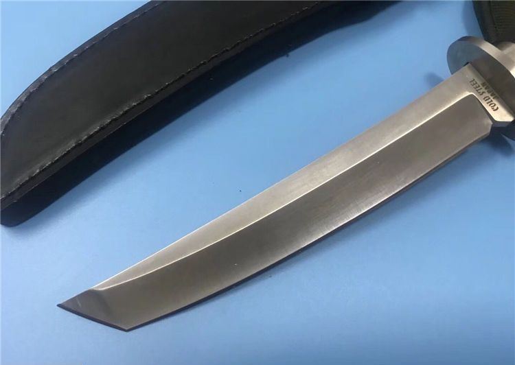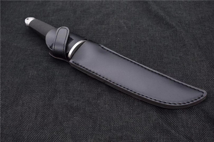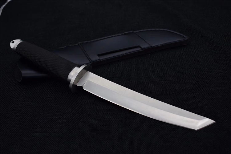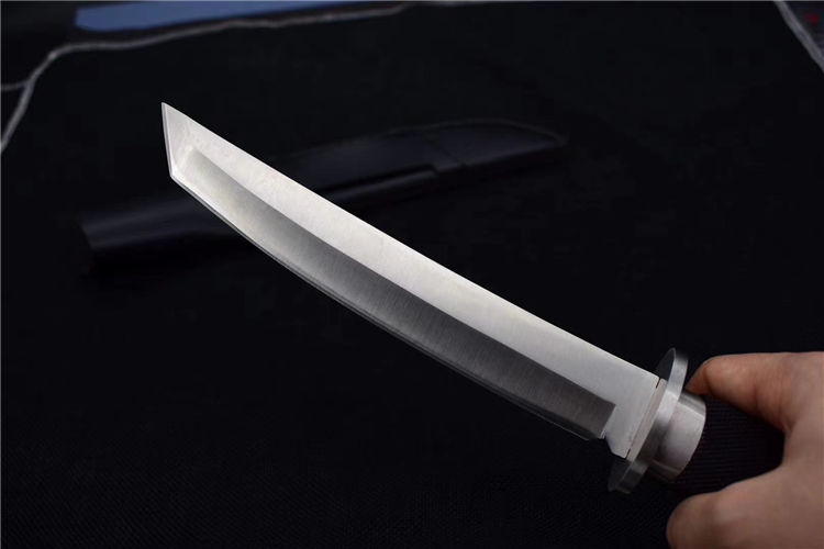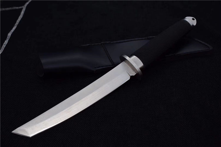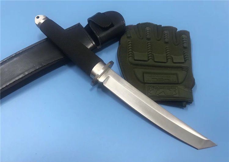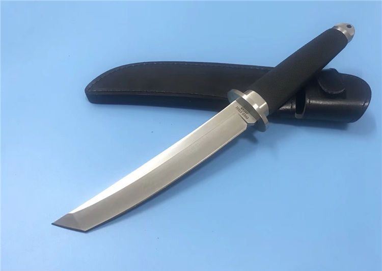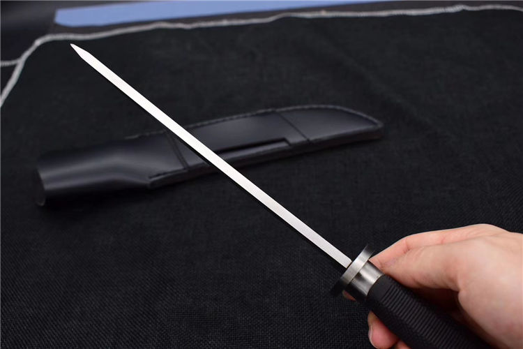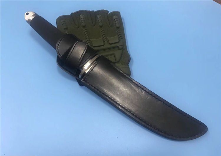 小号三美武士(真皮鞘) 全 长: 33cm 刃 长: 19cm 刃 厚: 5mm 重 量: 320克 刃 材: 440 硬 度: 56HRC 表 面: 抛光 柄 材: 橡塑 刀 鞘: 牛皮