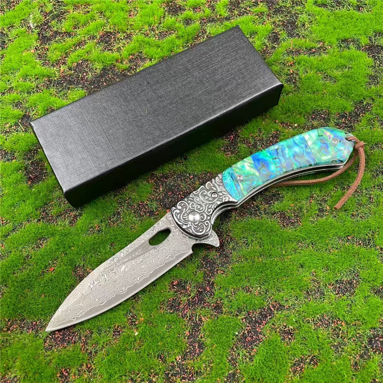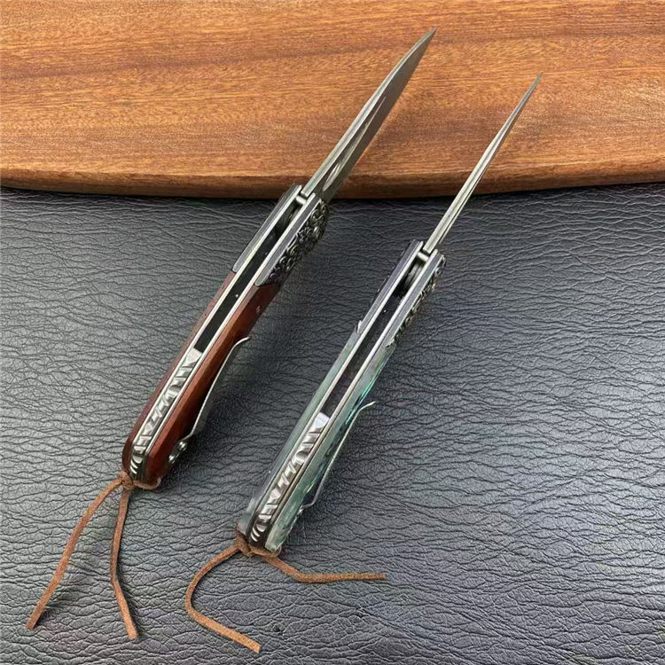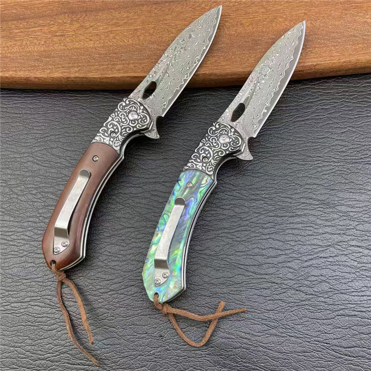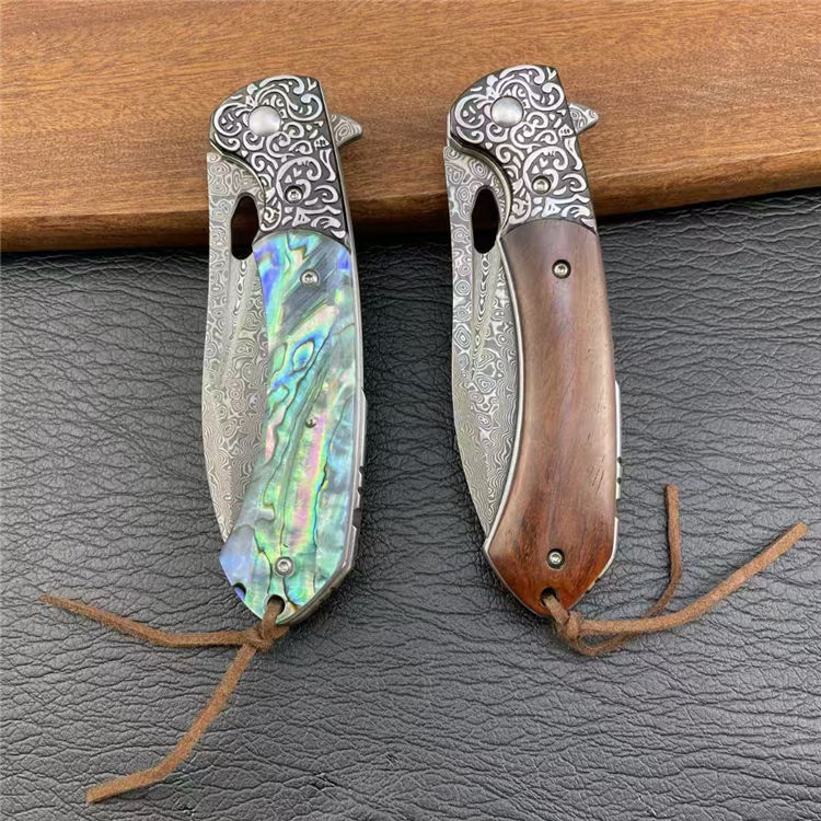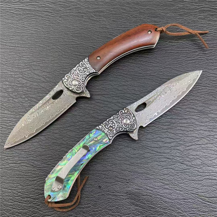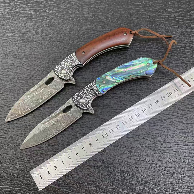大马士革海蛇折刀 全长:20.5cm 刃长:8.8cm 柄长:11cm 刃宽:2.8cm 刃厚:3mm 刃材:大马士革纹 柄材:花纹钢头+红檀木,鲍贝 刀重:153G 毛量:183G 硬度:58-60HRC 包装:盒子