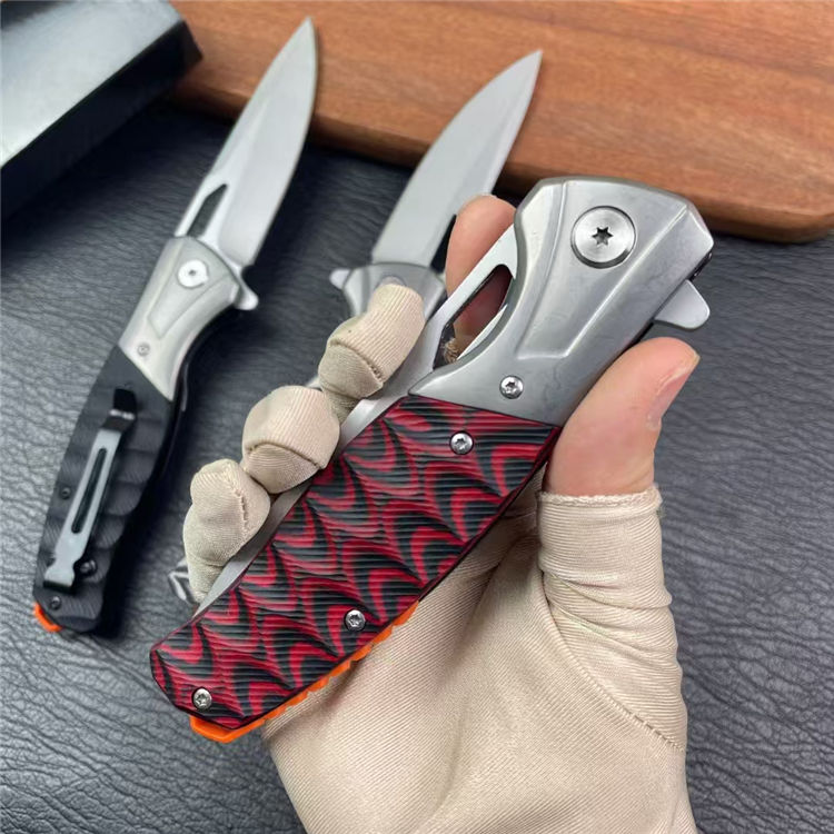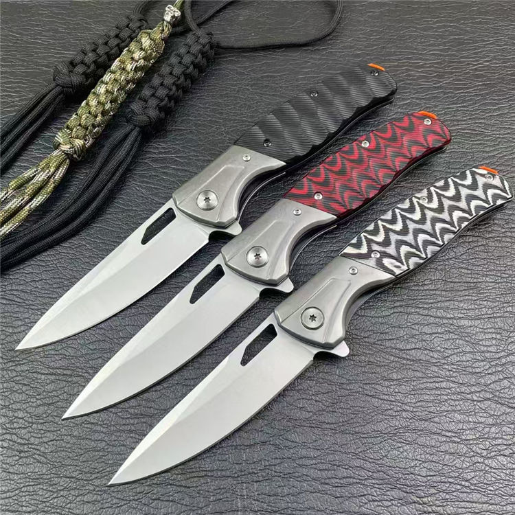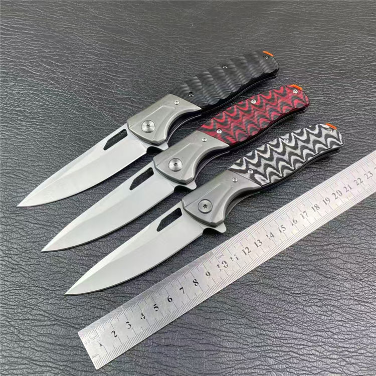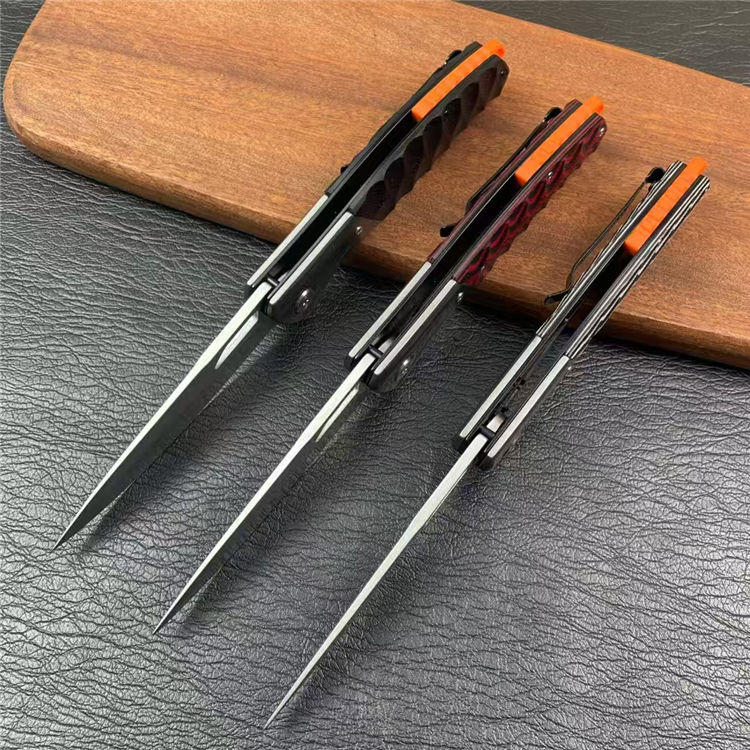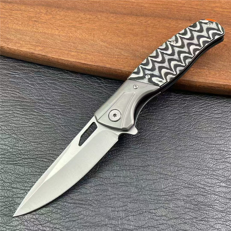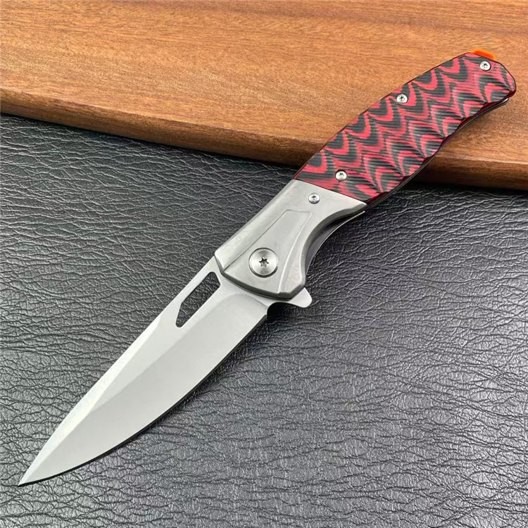 慕斯折刀 全长:22.5cm 刃长:9.8cm 柄长:13cm 刃宽:2.8cm 刃厚:4mm 刃材:8CR13MOV 柄材:钢头+G10 刀重:175G 毛量:194G 硬度:58-60HRC