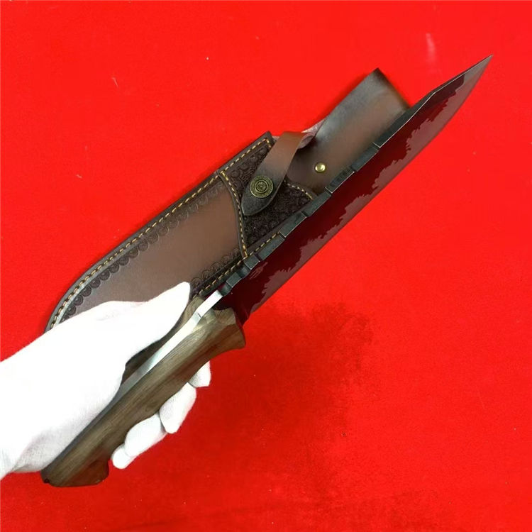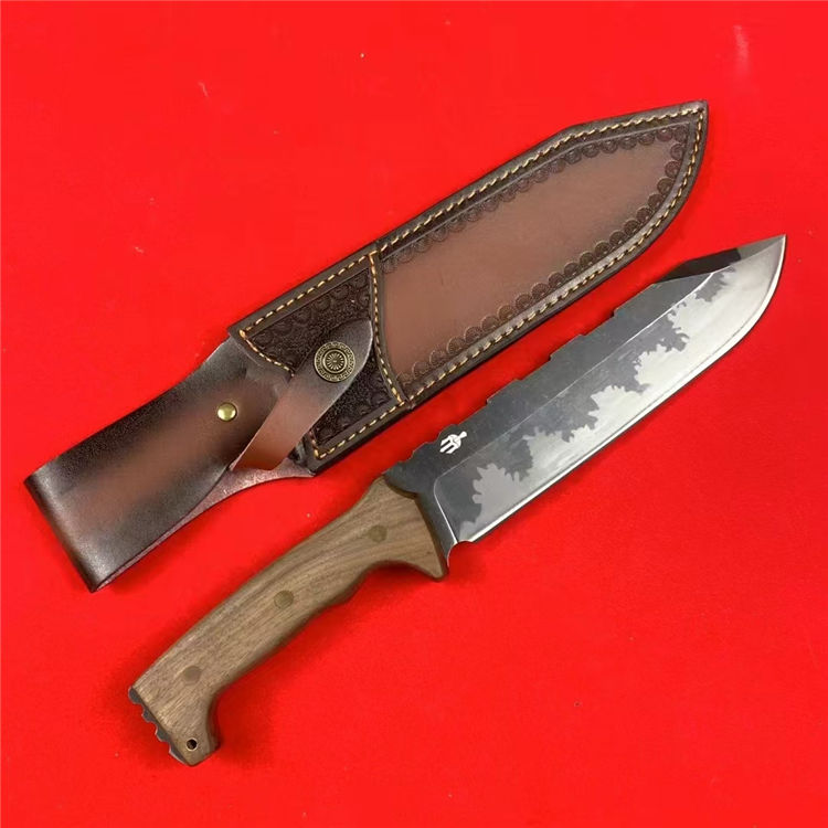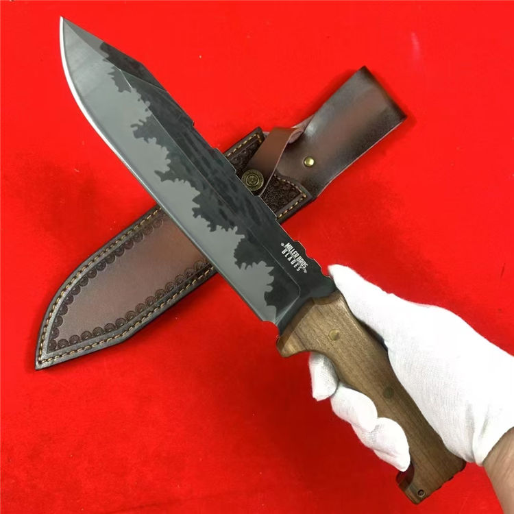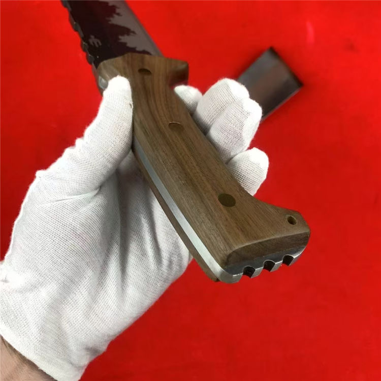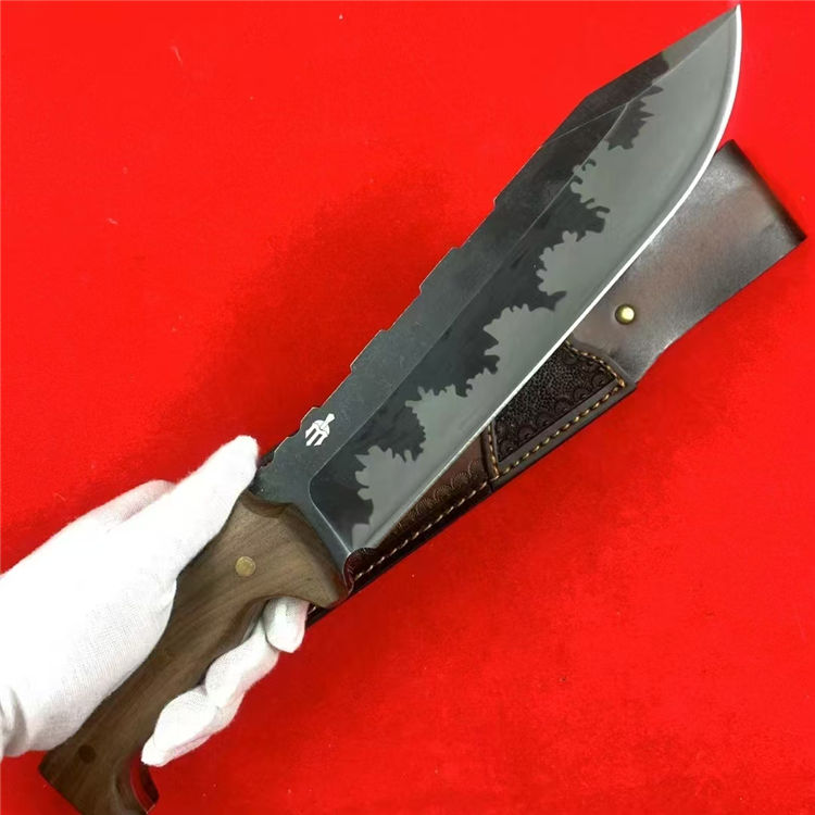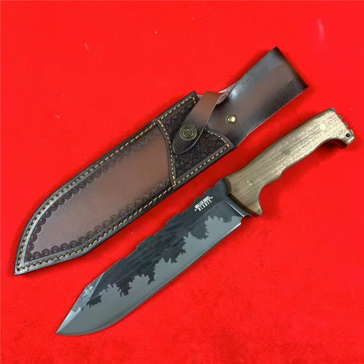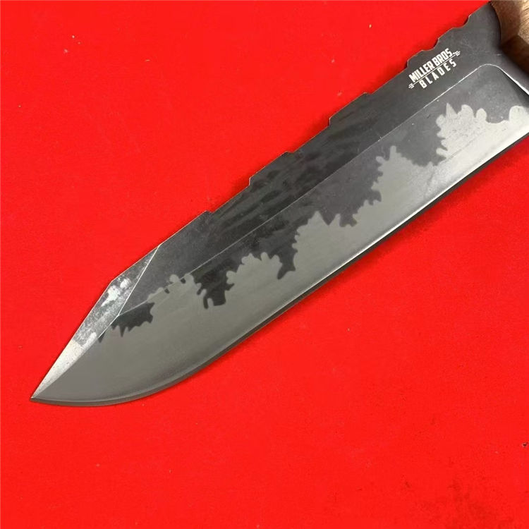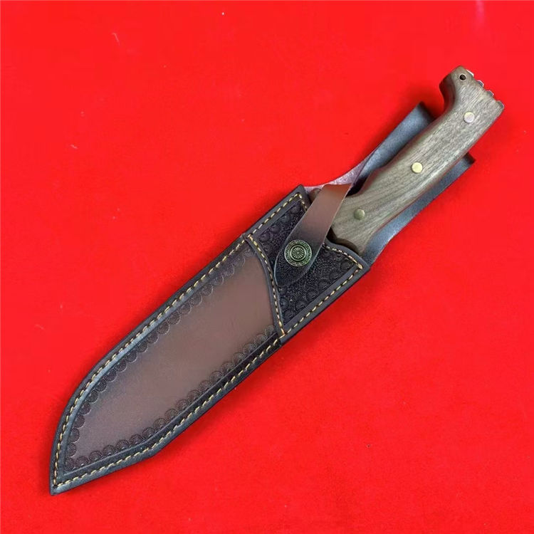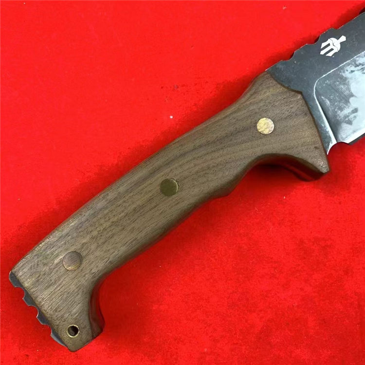 米勒C8直刀 总长:35.8cm 刃长:21.3cm 柄长:14.4cm 刃宽:4.9cm 刃厚:6mm 刃材:DC53 柄材:黄檀木 硬度:57-59HRC 重量:675g(含皮套)