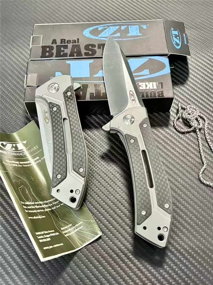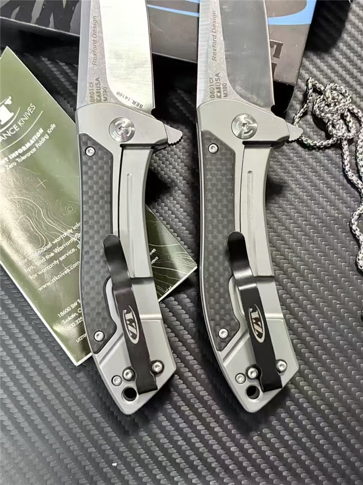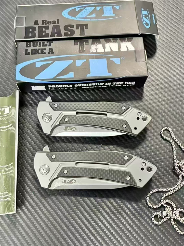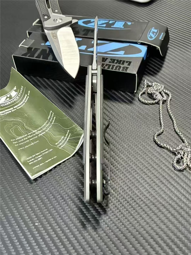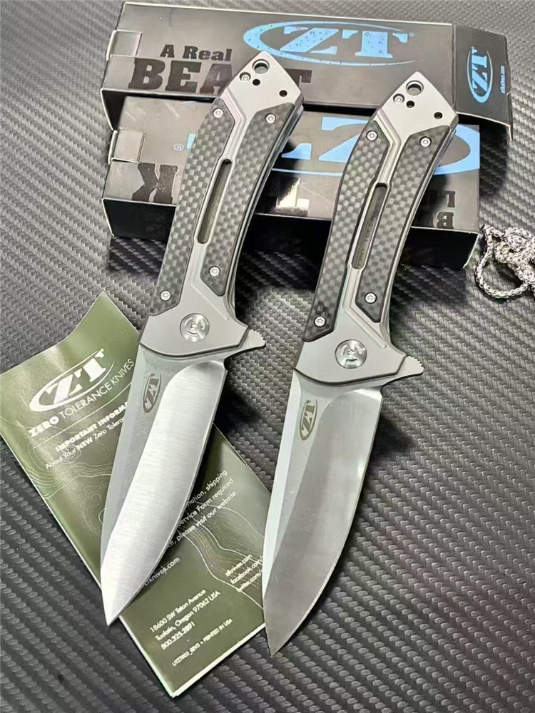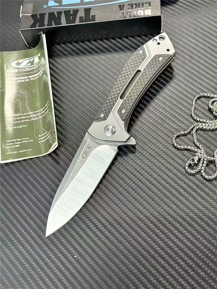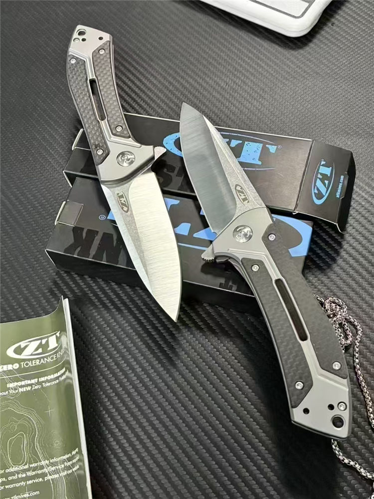 ZT零误差0801折刀 总长:20.8cm 刃长:8.9cm 刃宽:3.1cm 刃厚:3.6mm 刃材:M390 柄材:420钢+碳纤 柄长:12.1cm 柄宽:27.2mm 柄厚:12.5mm 重量:207G,含包装刀鞘总重量:225G