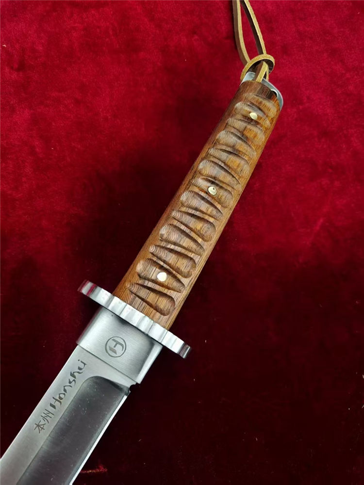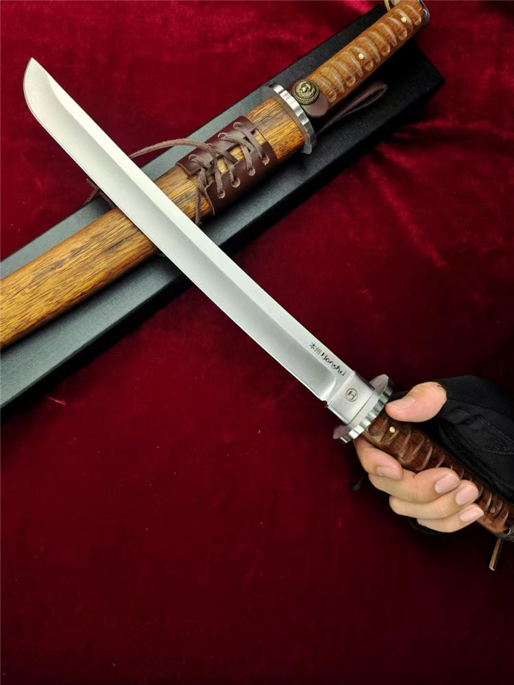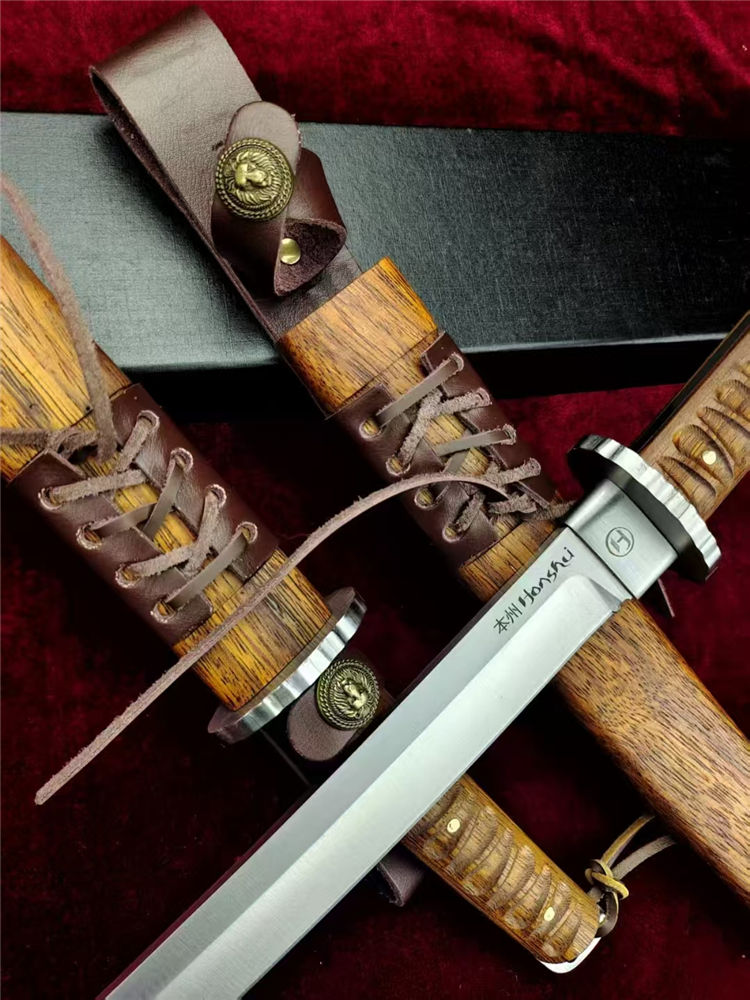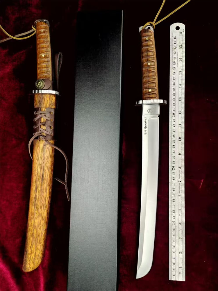 本州极能武士刀 全长:460mm 刃长:300mm 柄长:145m 刃材:进口A8高硬度合金钢 刃面: 拉丝细砂工艺 重量:740g,盒子重:212g 硬度:59-60HRC 柄材:印尼印茄木 刀鞘:木鞘CNC电脑精雕印茄木 包装:黑礼盒