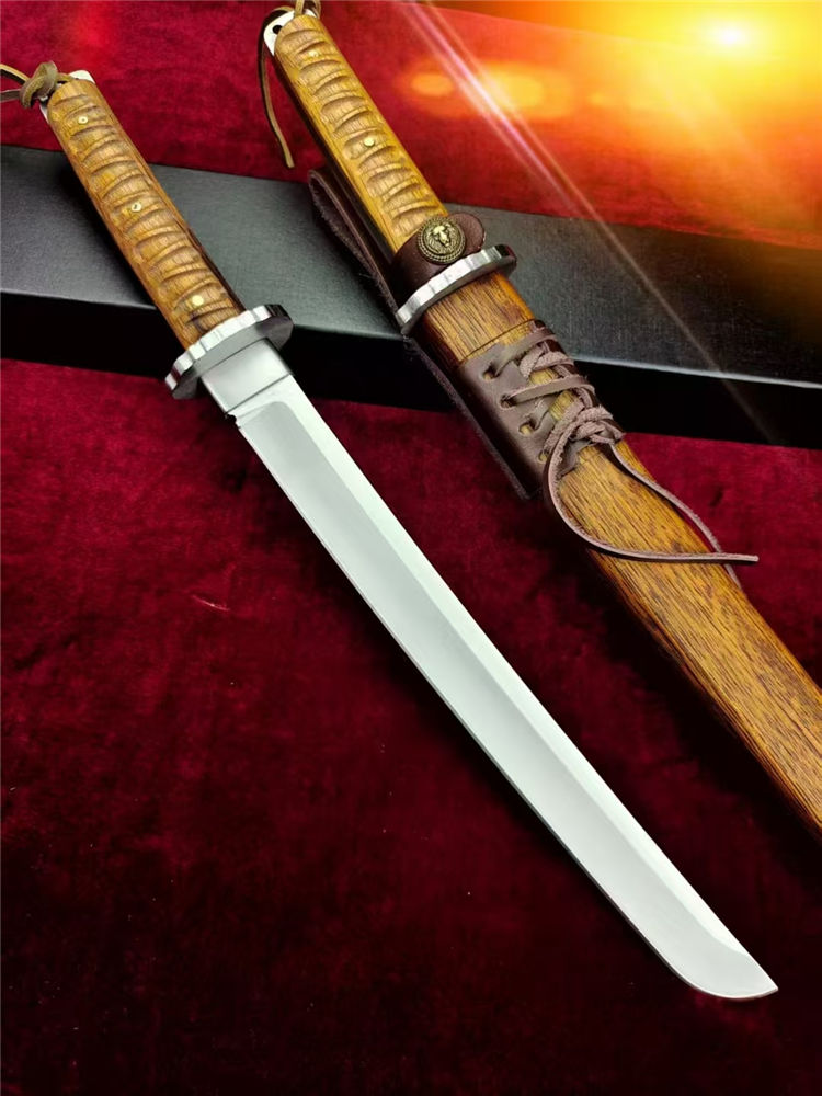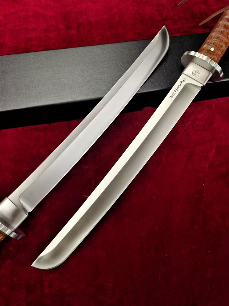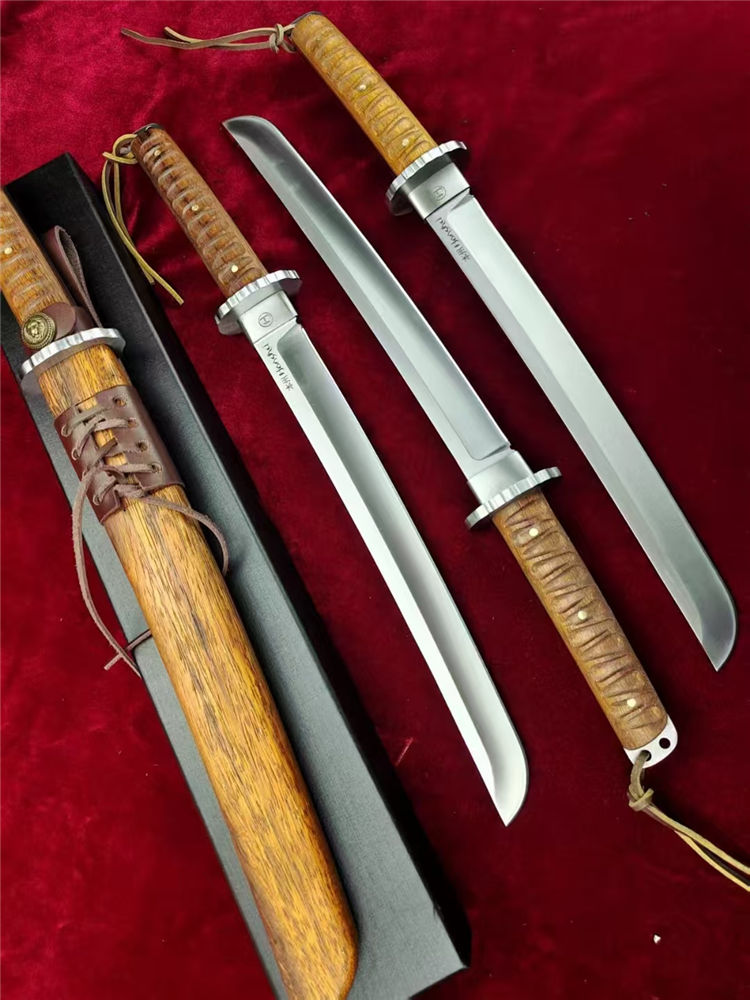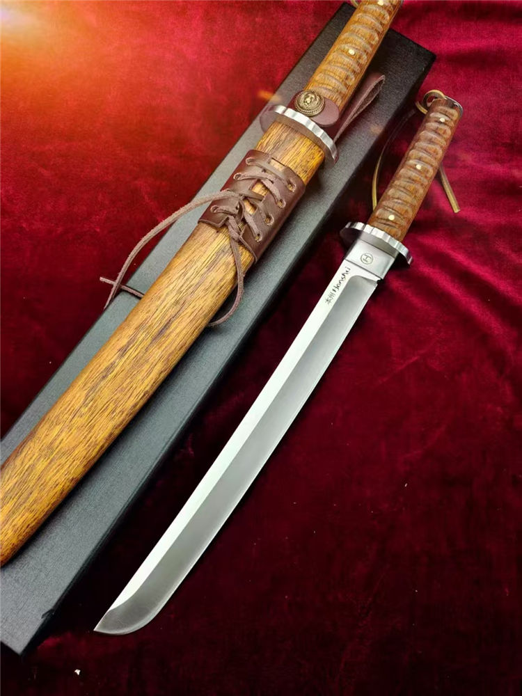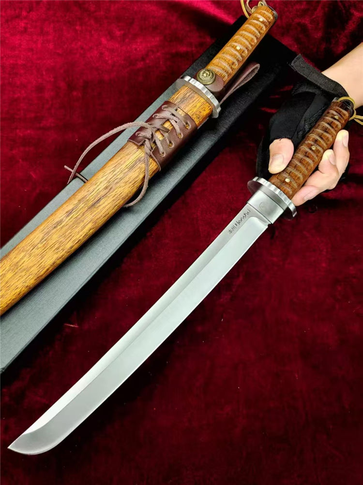 本州极能武士刀 全长:460mm 刃长:300mm 柄长:145m 刃材:进口A8高硬度合金钢 刃面: 拉丝细砂工艺 重量:740g,盒子重:212g 硬度:59-60HRC 柄材:印尼印茄木 刀鞘:木鞘CNC电脑精雕印茄木 包装:黑礼盒