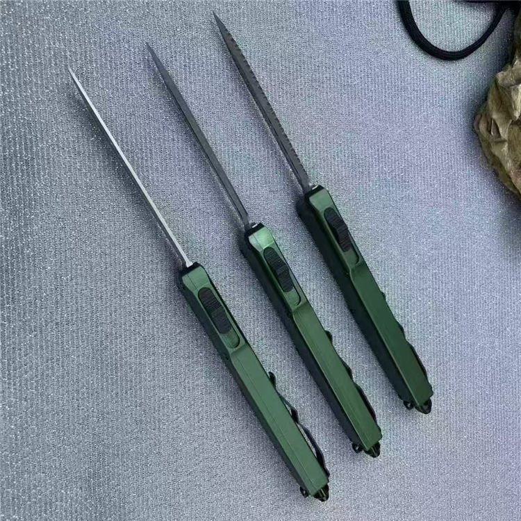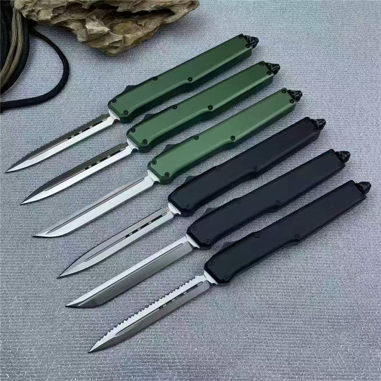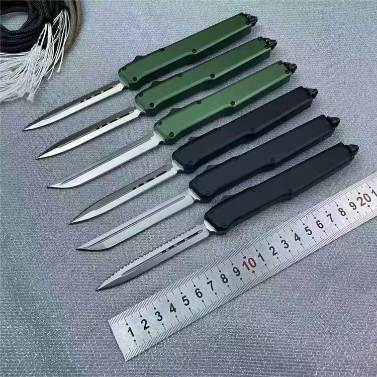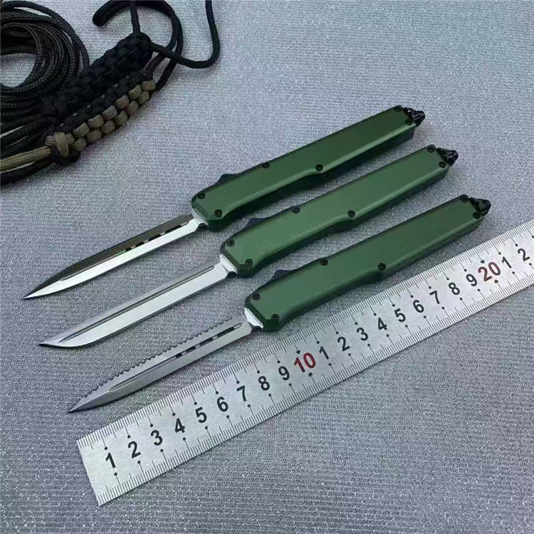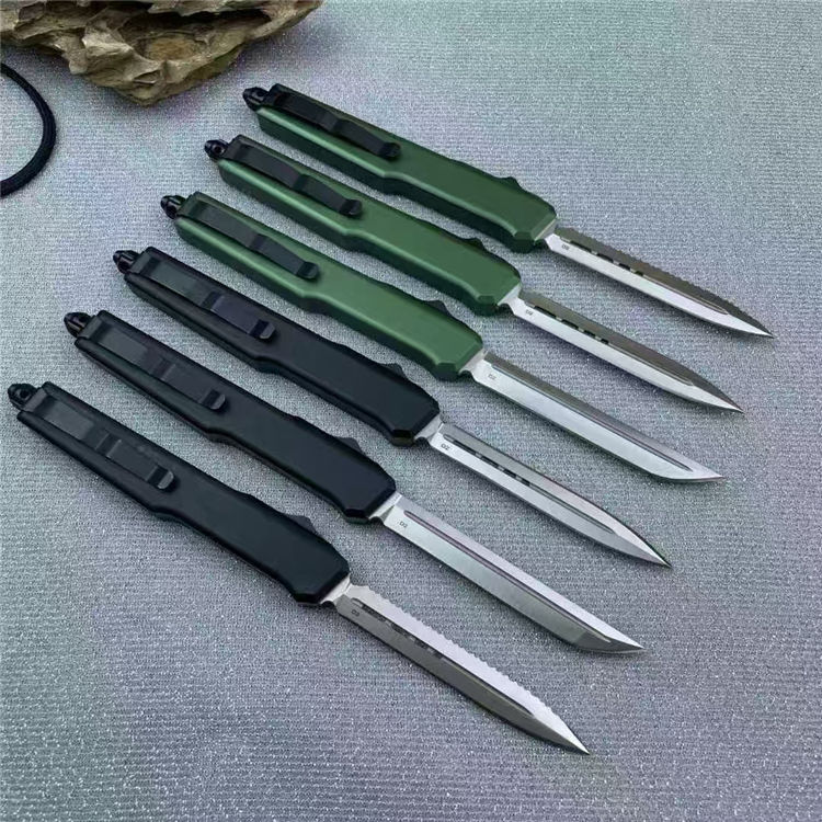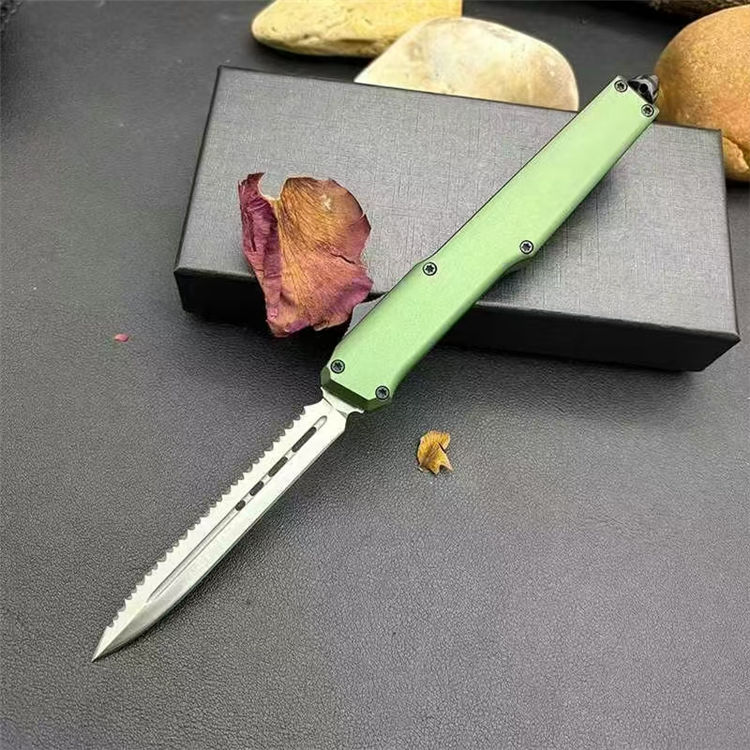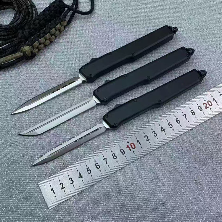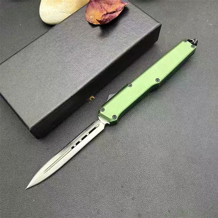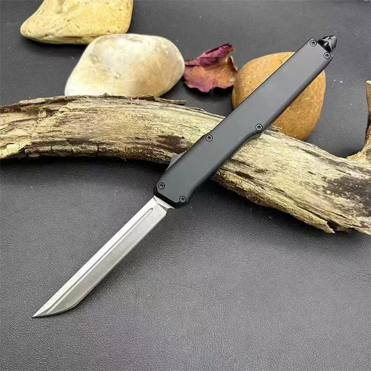 伤齿龙C01肥龙直出跳刀 全长:22cm 刃长:8.8cm 柄长:13cm 刃厚:2mm 刃材:D2 柄材:铝合金 硬度:5-608HRC 净重:73G 毛重:122G 包装:礼盒