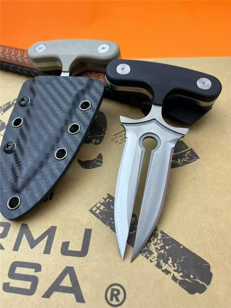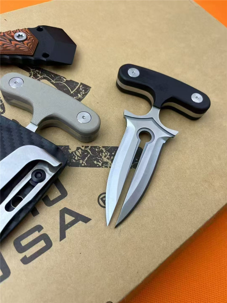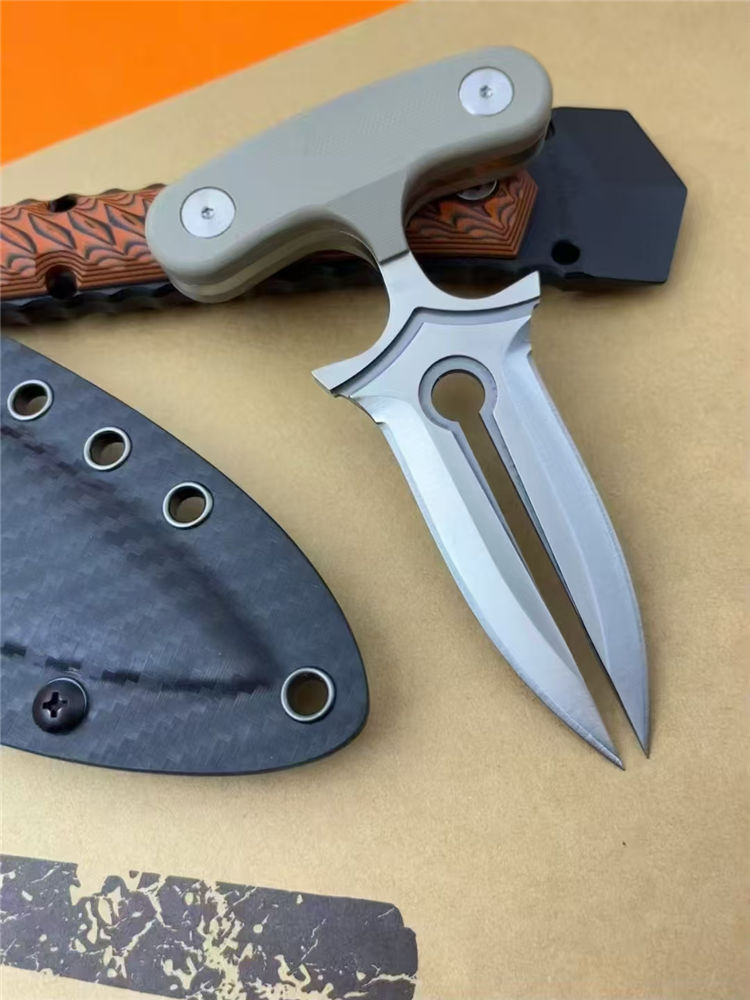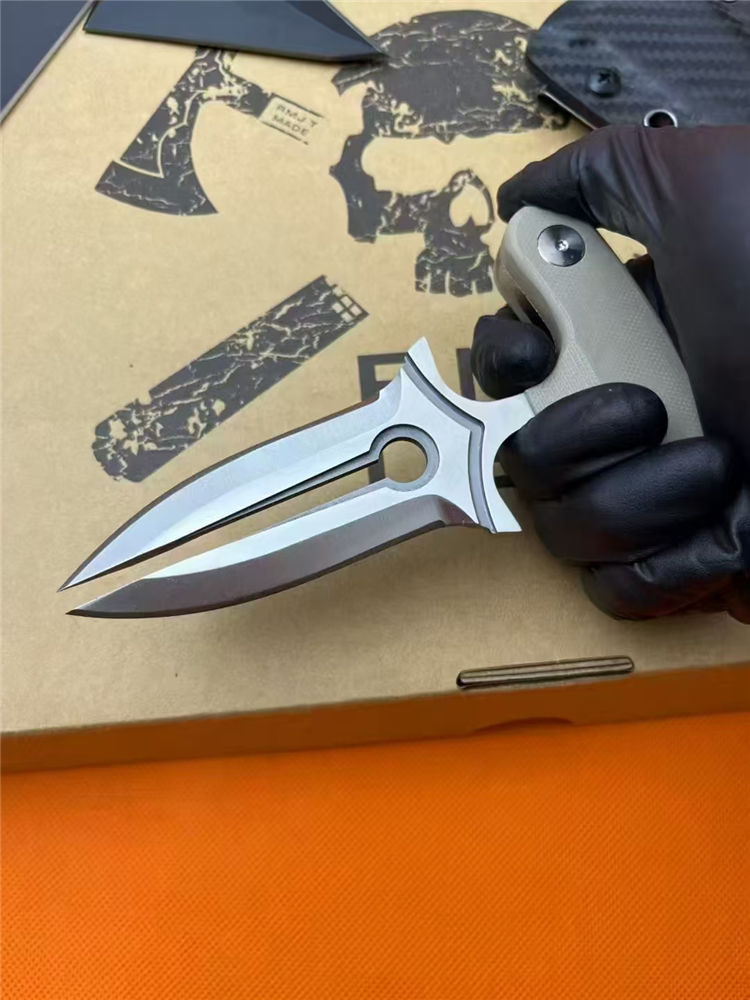 防御者双煞手刺 全长:13.2cm 刃长:7.5cm 柄长:3.3cm 柄宽:7.9cm 材质:DC53钢材 硬度:60+-HRC 表面:砂光 柄材:G10 裸重:155g 配件:战术碳纤维K鞘、精品礼盒 其他:全手工打磨、线切割、手工二次开刃制作,绝对是收藏玩家的一大喜好